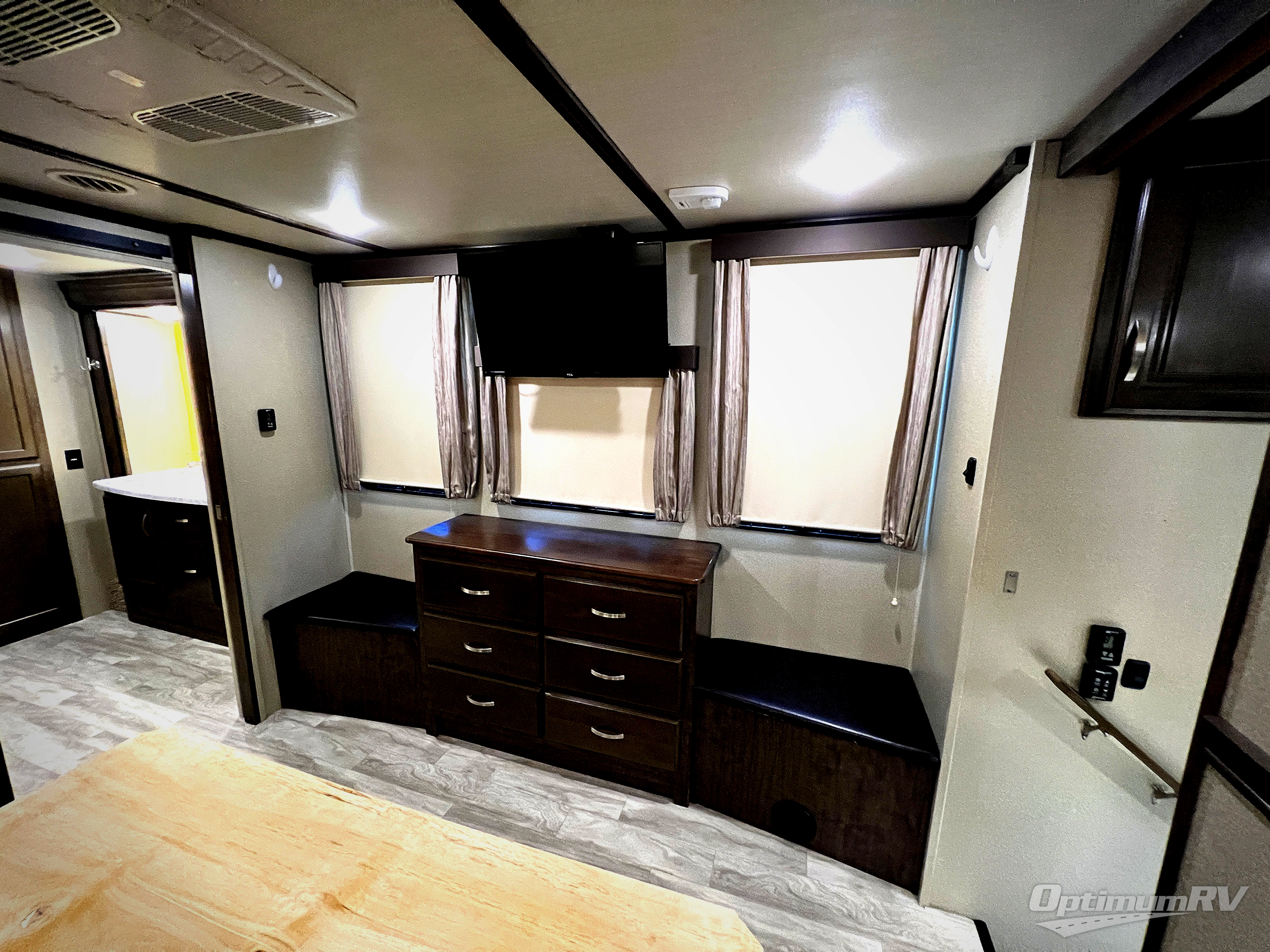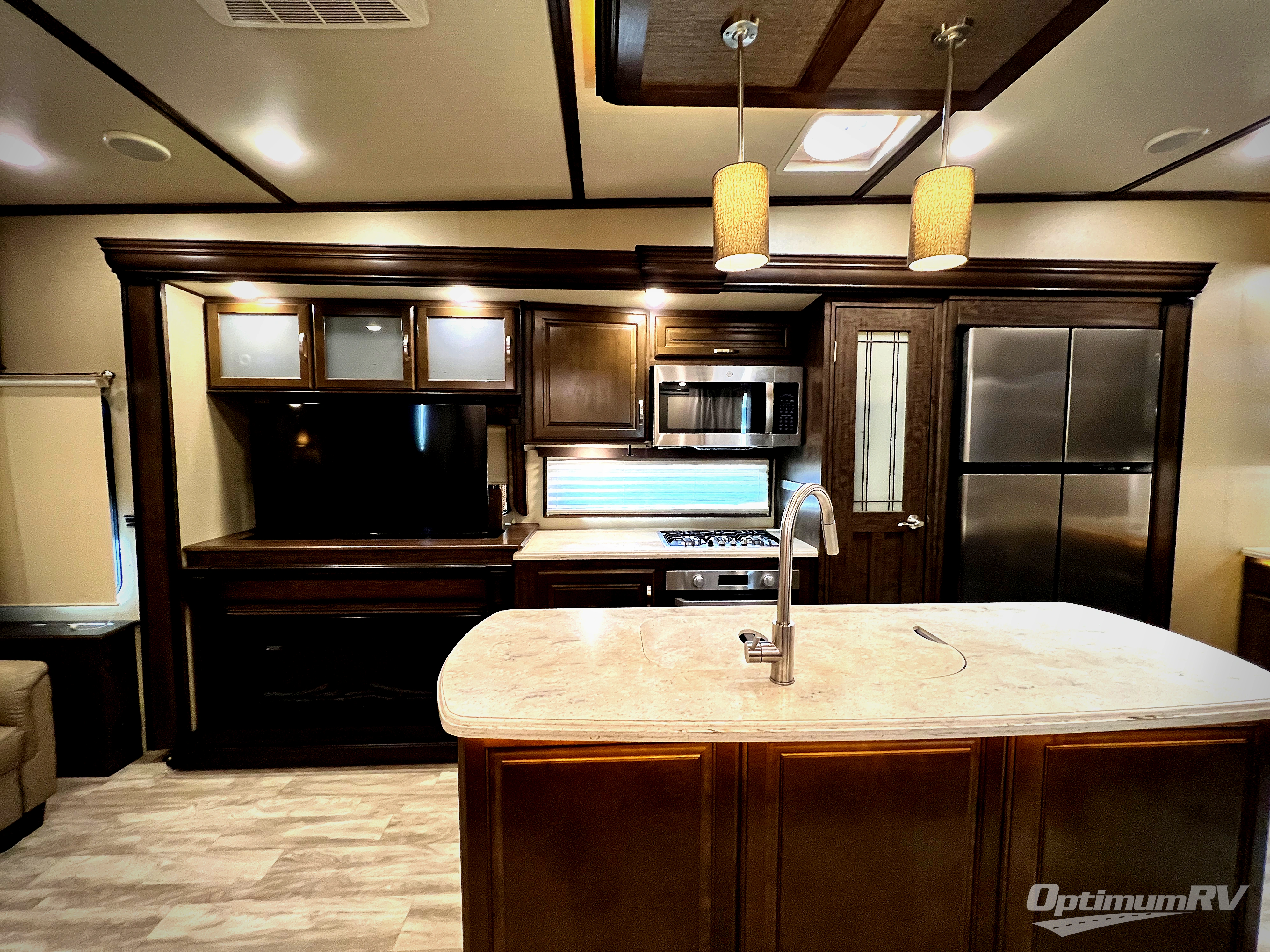 If you are looking for a full-time RV with luxury and comforts like home, this fifth wheel might just be the one. Imagine having a full master bathroom with dual sinks and plenty of storage, plus a washer/dryer if you decided to add those optional appliances to the prepped space. Now start thinking about how you will enjoy the walk-through master bedroom with a flip-top dresser, dual seats, and an LED TV. The cook will have a professional grade stainless steel cooktop, built-in oven and convection microwave to make meals. This model even includes a beverage cooler in the wine bar, dishwasher prep in the kitchen island, a stainless steel 18 cu. ft. four door refrigerator, and a large pantry. You will find plenty of seating to entertain your friends, plus a fireplace to keep everyone cozy on those chilly nights. Come see how this Solitude offers conveniences and comfort throughout, plus plenty of storage for all your things.