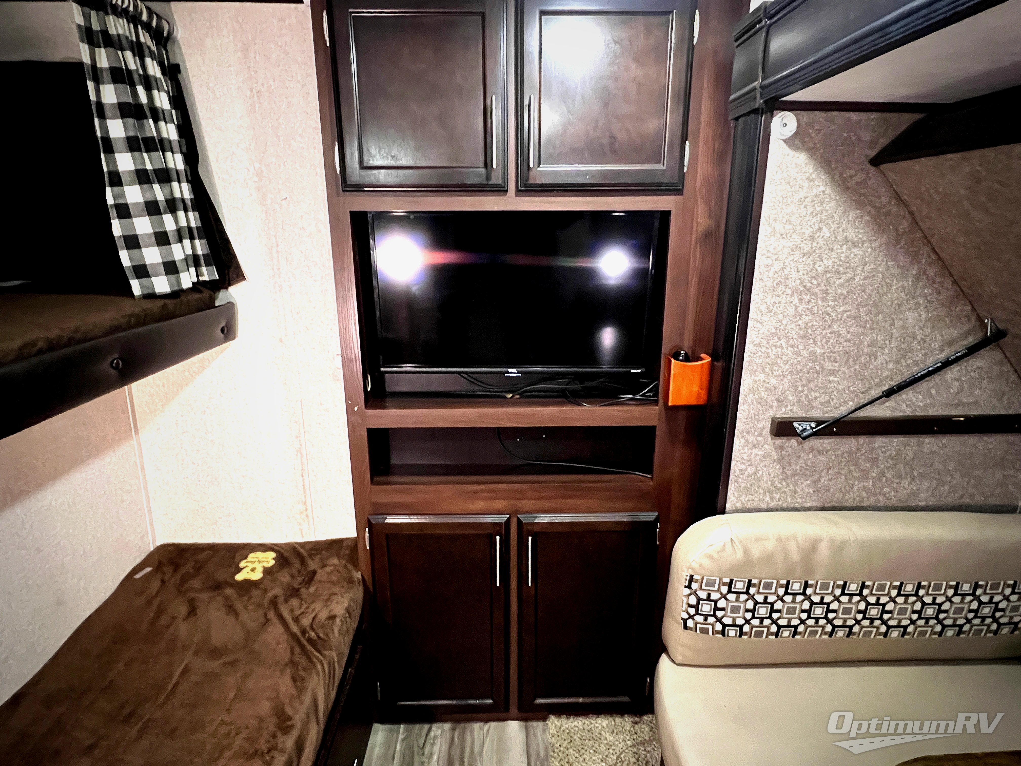 Imagine your kids and their friends in the private rear bunkhouse after riding their bikes all day. You can also imagine them laughing and talking about everything that happened. Then picture yourself relaxing in the living area in this travel trailer. The cook in the family can make meals for everyone either indoors, or outdoors on the outside kitchen, the choice is theirs. The kitchen island provides more counter space for serving meals, and cleaning the dishes. You will find storage throughout the inside as well as outside, load up your gear today!