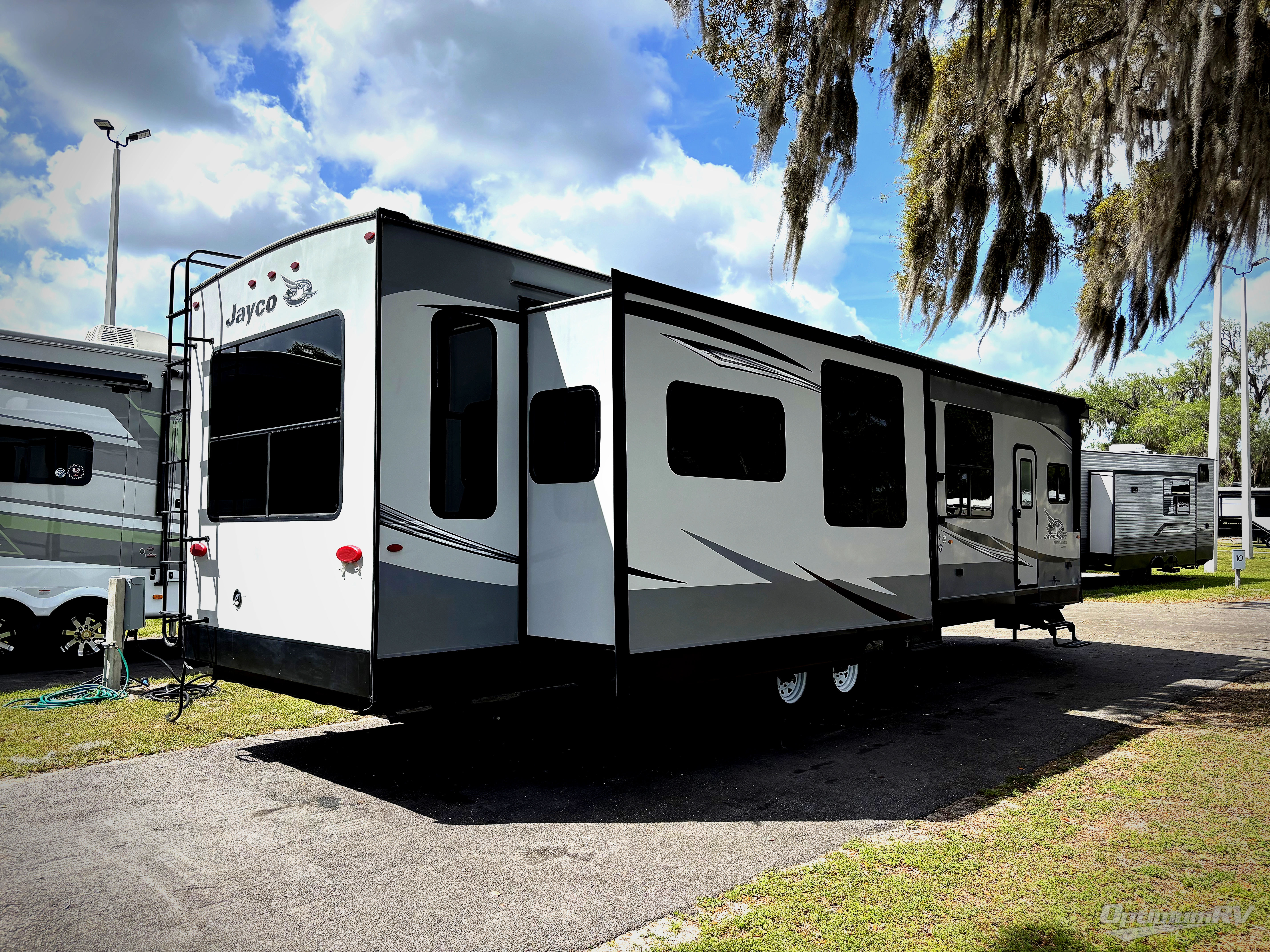 When you want luxury features and optimal comfort in the dreamiest vacation spot, picture this Jay Flight Bungalow travel trailer waiting for you. With its 102" wide-body construction, interior ceiling height of 96", and triple slide outs you will want to enjoy more than just a weekend away. Inside, you will find a private bedroom with a Simmons pillow-top mattress for a comfortable night's sleep, as well as a hide-a-bed sofa in the living area for family or overnight guests. Residential appliances including a large 18 cu. ft. refrigerator will hold all of your perishable goods keeping them cold and fresh, and the large center island is perfect for food prep and serving when you have added guests. You will love the added home-like touches featured throughout this unit like crown molding in the kitchen, a residential shower in the bath, ceiling fans in the living area and bedroom, and even residential style window treatments with wood trim throughout. Entertain inside with an electric fireplace with plenty of seating, or take the party outside out under the 19' power awning featuring LED lights and integrated speakers where you can bring even a bit of music to the outdoors!
