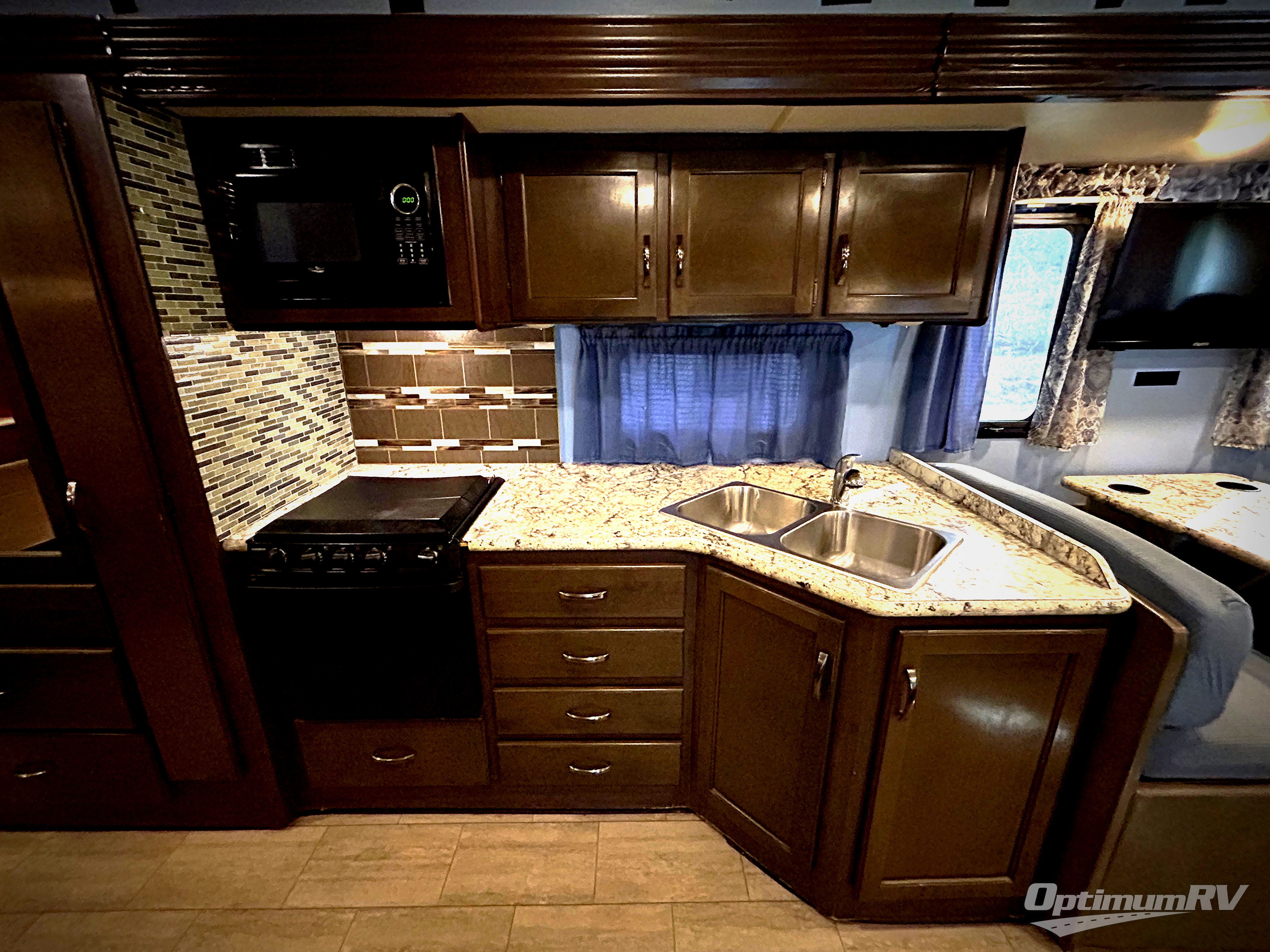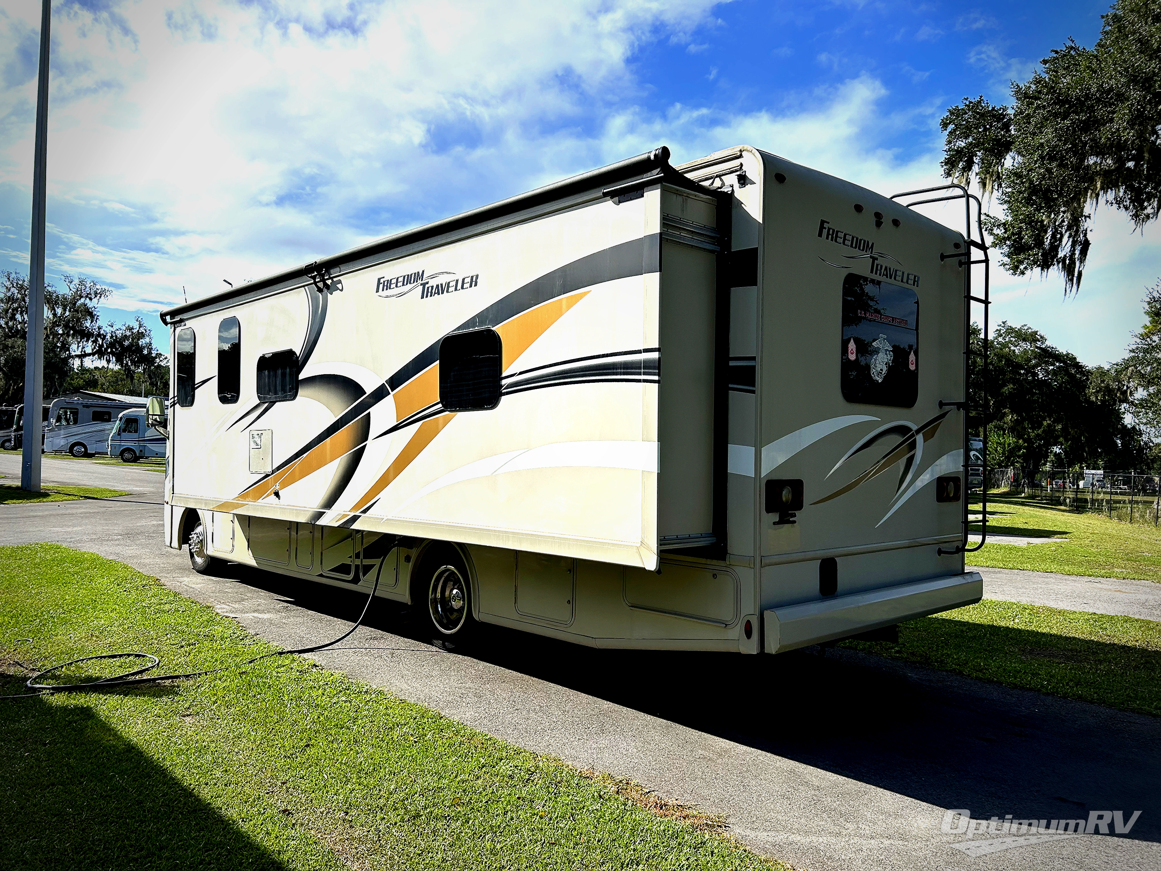 If you don't want anything holding you back while you see the country, then you need this Freedom Traveler Class A gas motorhome! You'll feel completely confident as you sit in the cab and use the back-up monitor to park at the campsite, and the reclining/swivel captain's chairs are not only helpful while you travel, but they are also great for relaxing once you've set up camp. The decorative backsplash and laminate countertops in the kitchen create a beautiful environment in which to cook dinner, and the stainless steel double-bowl sink with pull-down sprayer is extremely handy for cleaning up the mess from dinner.