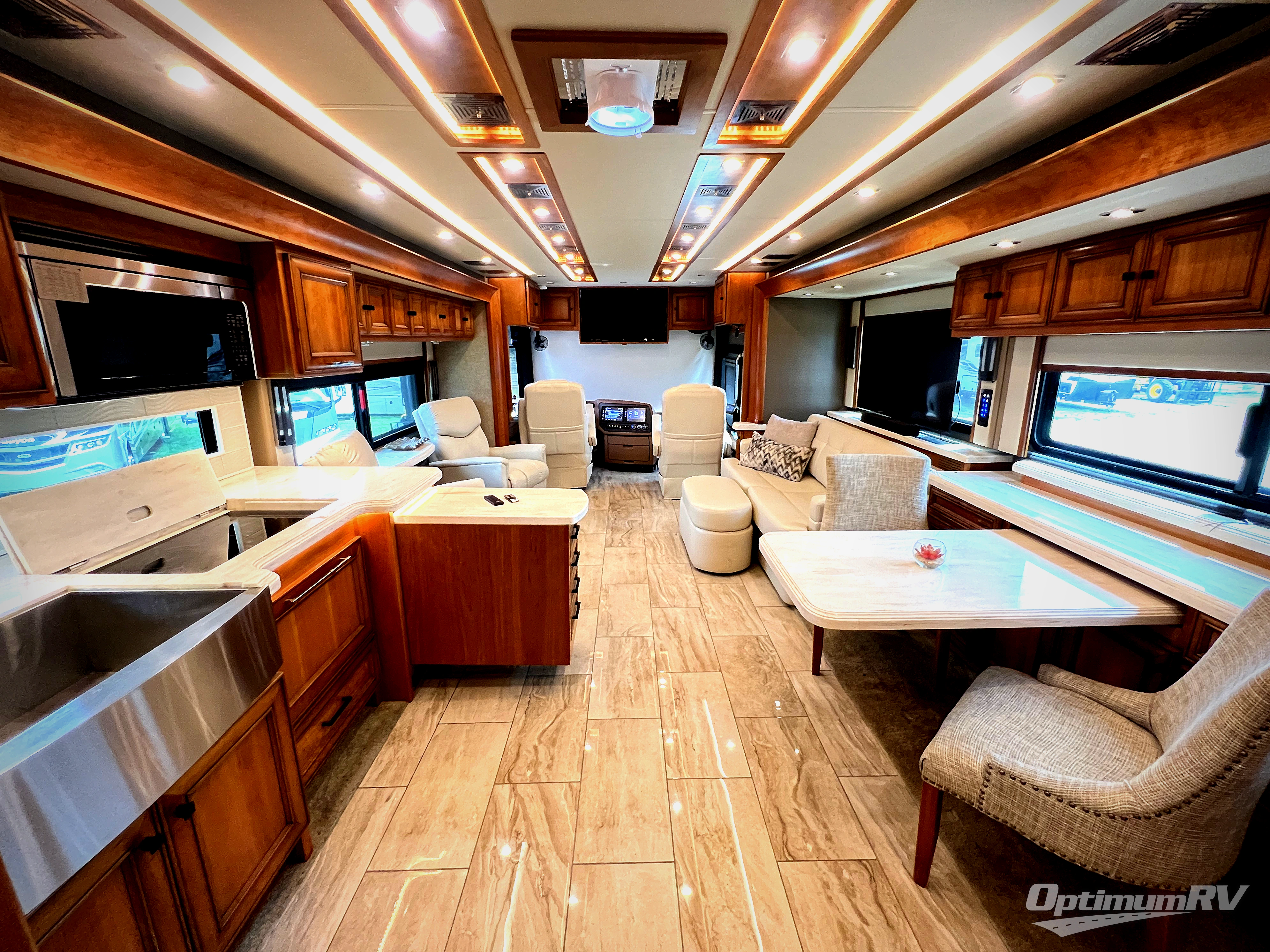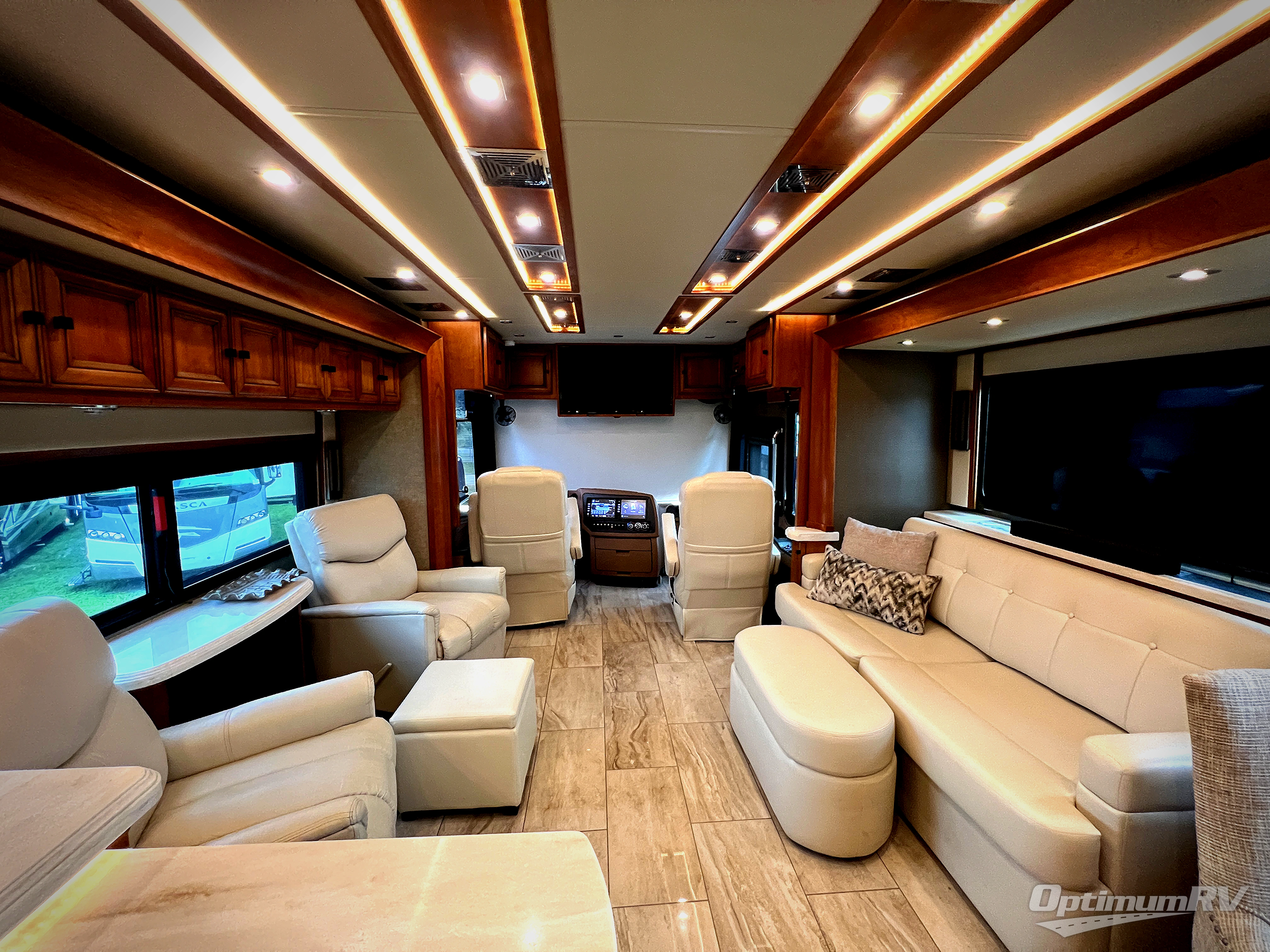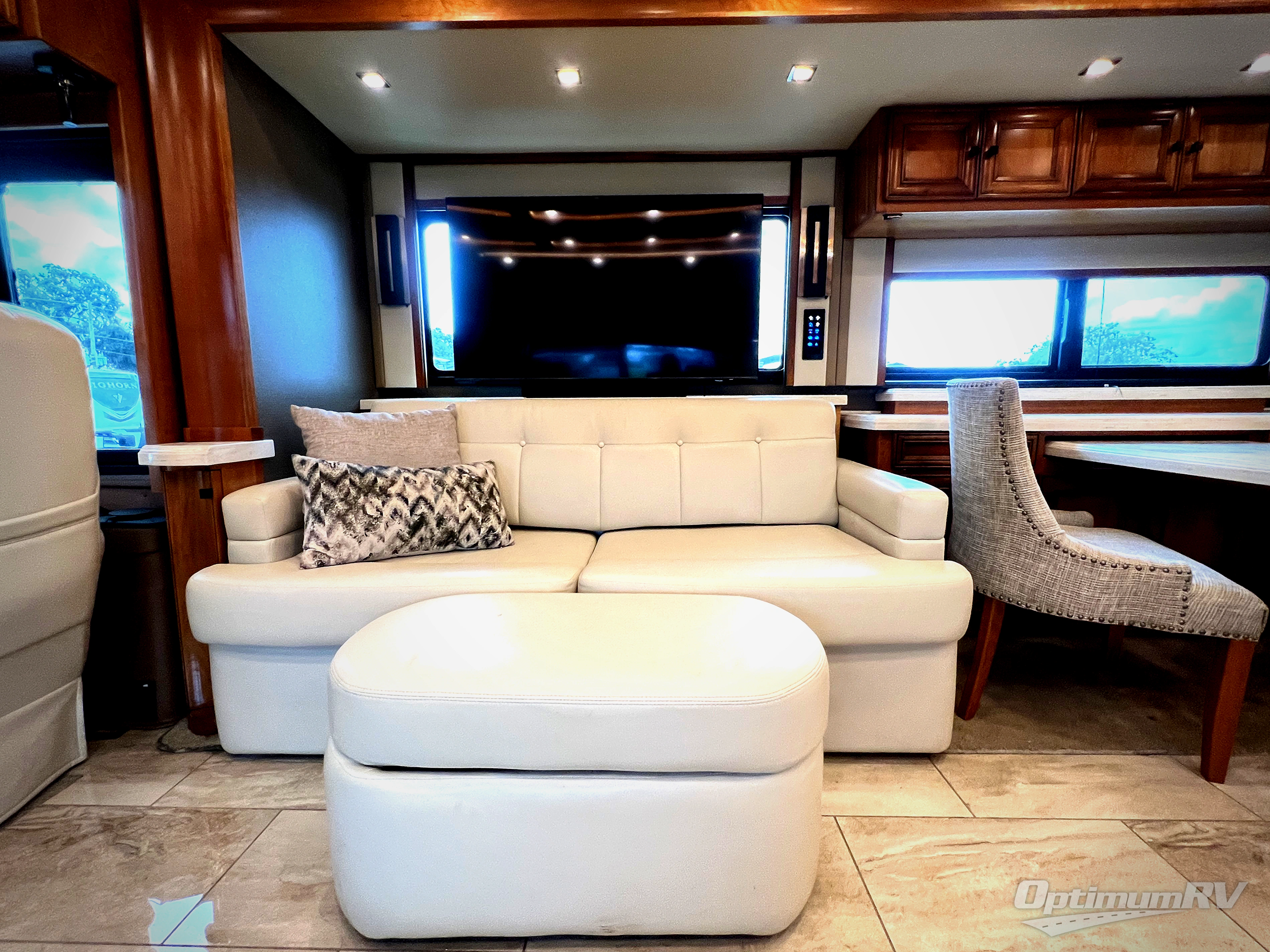 With this Tiffin Allegro Bus class A diesel coach model 45 OPP you will enjoy your best camping trip! Starting with the 4 TV's, the Ultra Leather air coil sofa, and the Ultra Leather DE Sofa with TV cabinet, you can relax, watch the big game, or visit with family and friends just like at home. However, if you need to get some work done the dinette is also a work station with two chairs. The stainless steel residential refrigerator and two pantries give you plenty of space to take the food items you need to prepare and serve your favorite meals on the polished solid surface countertops. You also have a large full bath with dual sinks including a closet for your wardrobe needs, and a half bath. This model is also available with a Freightliner chassis.