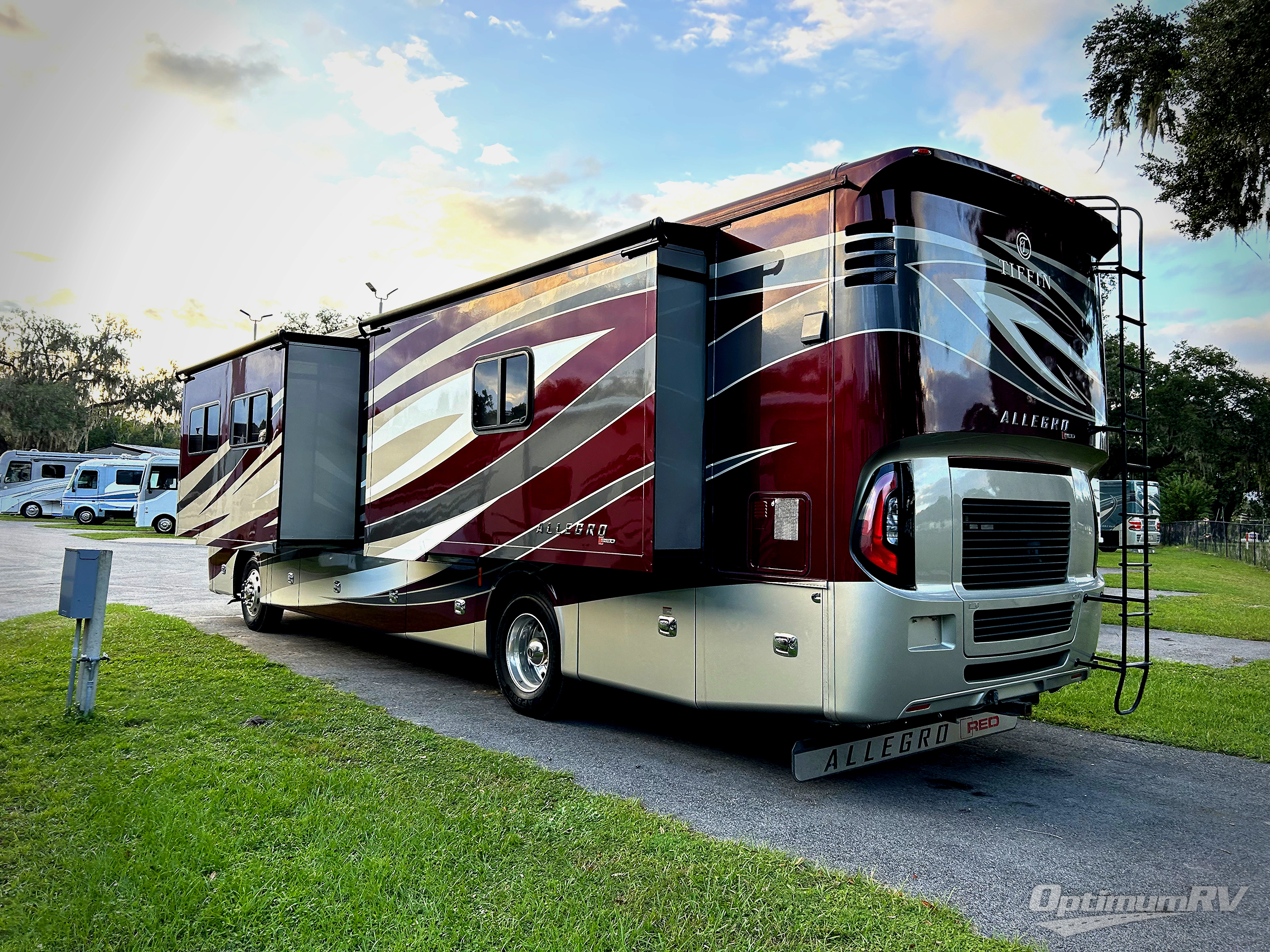 Envision driving down the interstate in this Allegro RED Class A diesel motorhome while your spouse relaxes on the passenger seat with footrests. As you both decide where to stay the night, you can stop to see the views, use the full bathroom with "his and her" sinks, and grab a sandwich from the residential refrigerator. Once at your destination, the four slide outs will provide lots of room to move about from one end to the other. In the morning, be sure to relax on the Ultra Leather recliner, and you will find 12V and USB dash receptacles, two TVs in the main living area, plenty of storage throughout, and much more to enjoy!