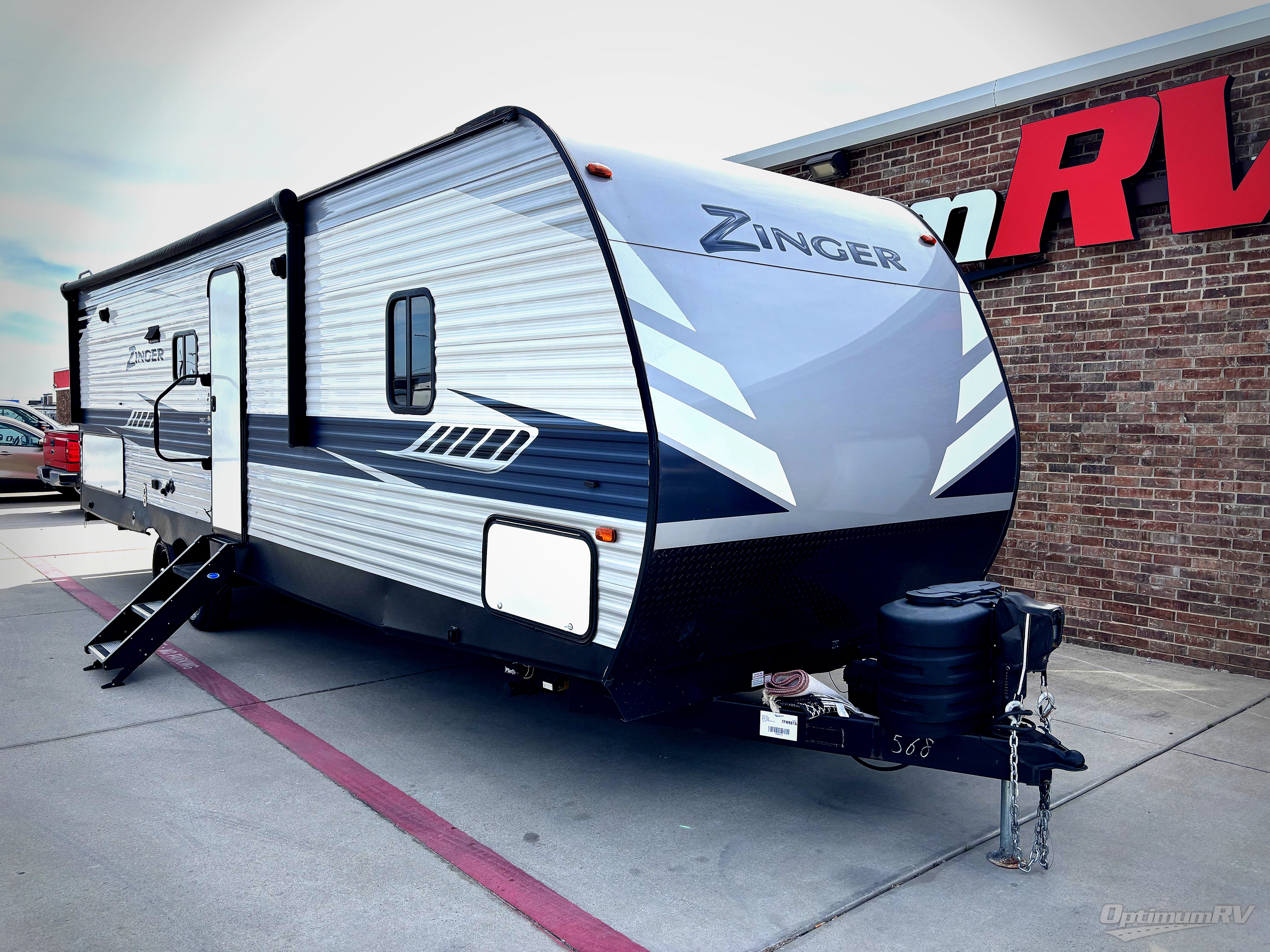 Each Zinger travel trailer by CrossRoads RV features an aerodynamic front end, radial tires, and Keyed-A-Like door locks you are sure to appreciate. Inside, the LED accent lighting and designer valances will give your unit a touch-of-home, and you'll find generous storage for all your items. The stainless steel sink and high rise faucet make cleaning up after dinner a snap, and you can easily clean up with the spacious shower/tub and one-piece surround. Get the best out of your camping experience in a Zinger travel trailer!