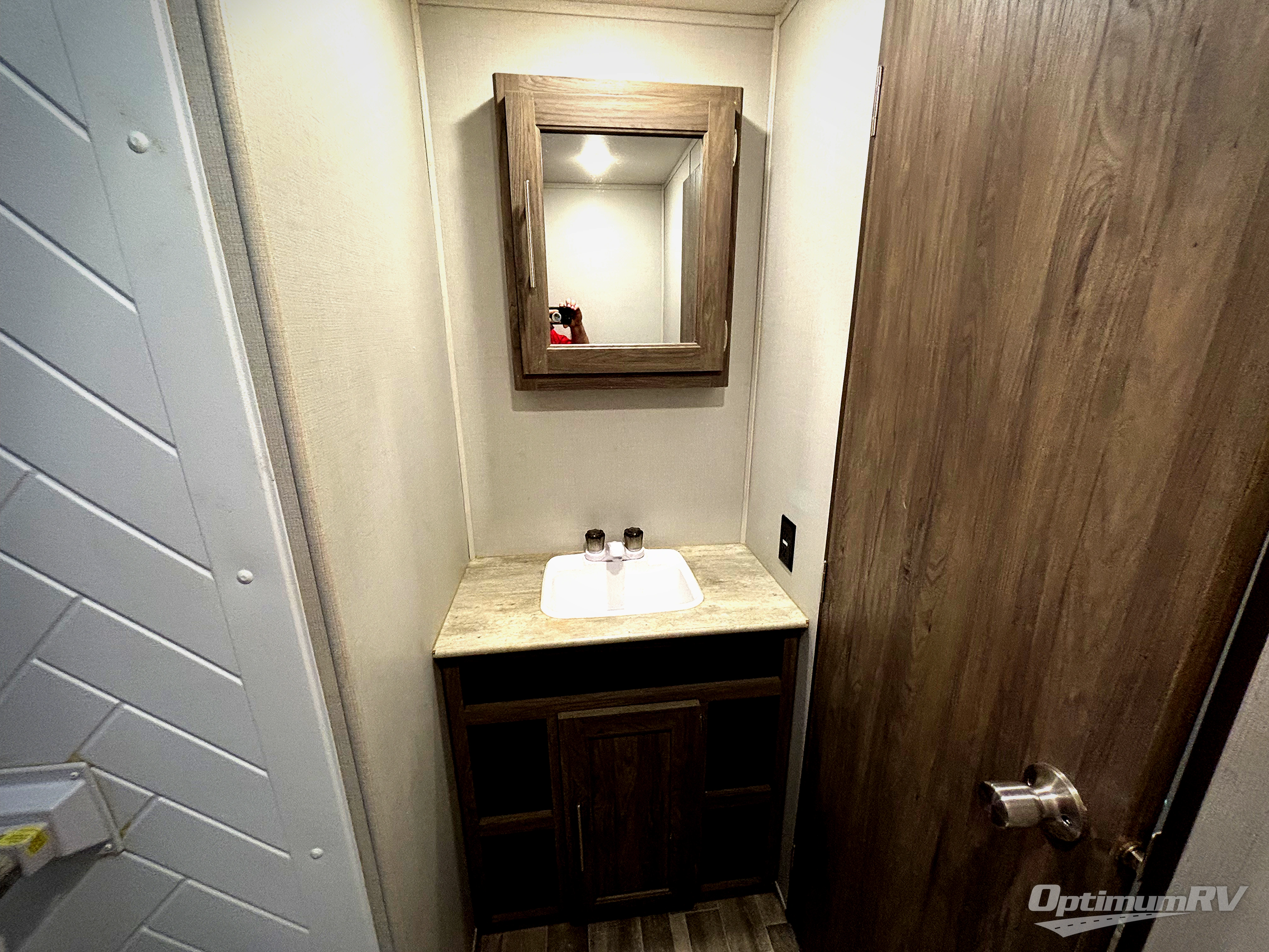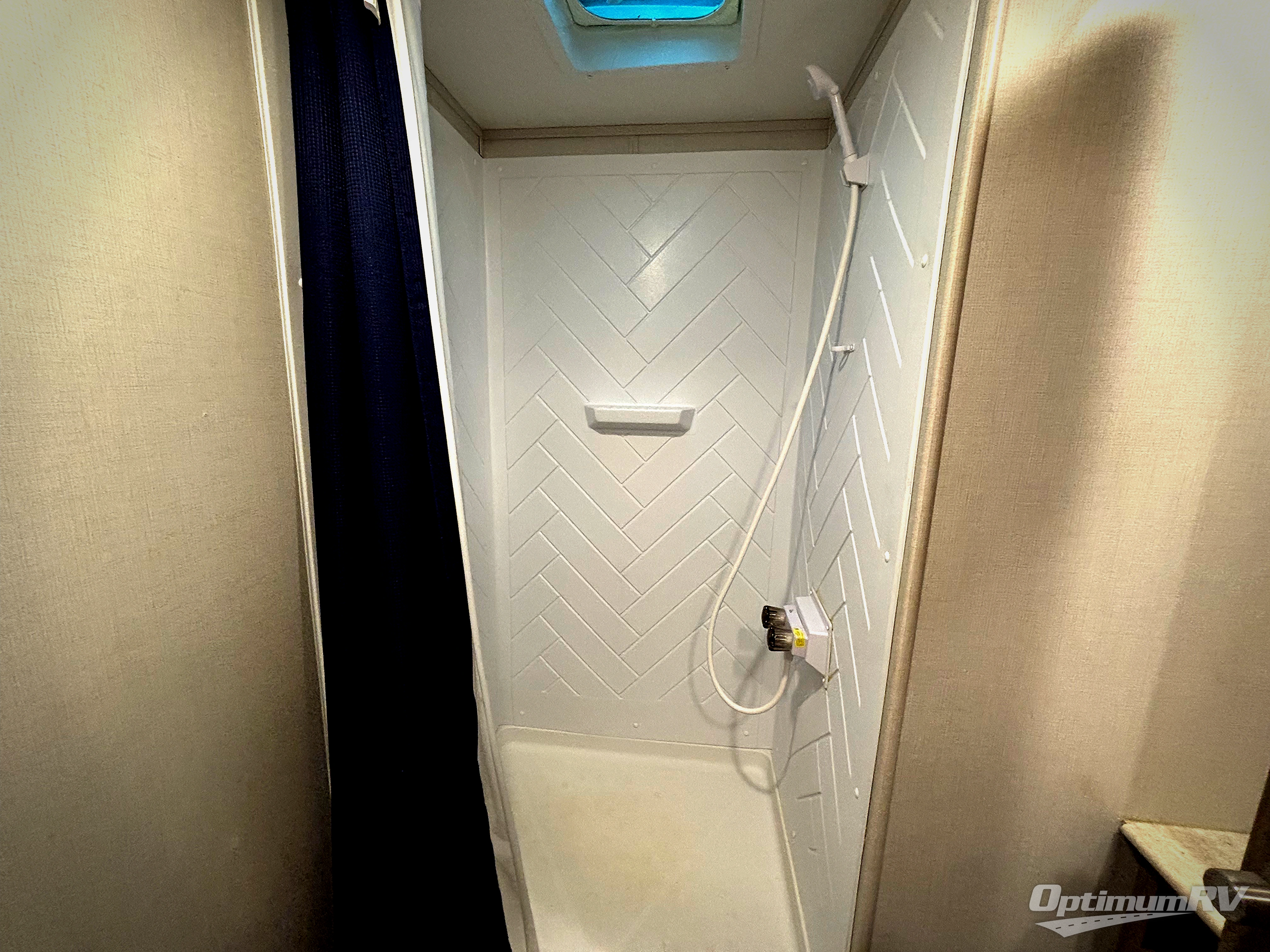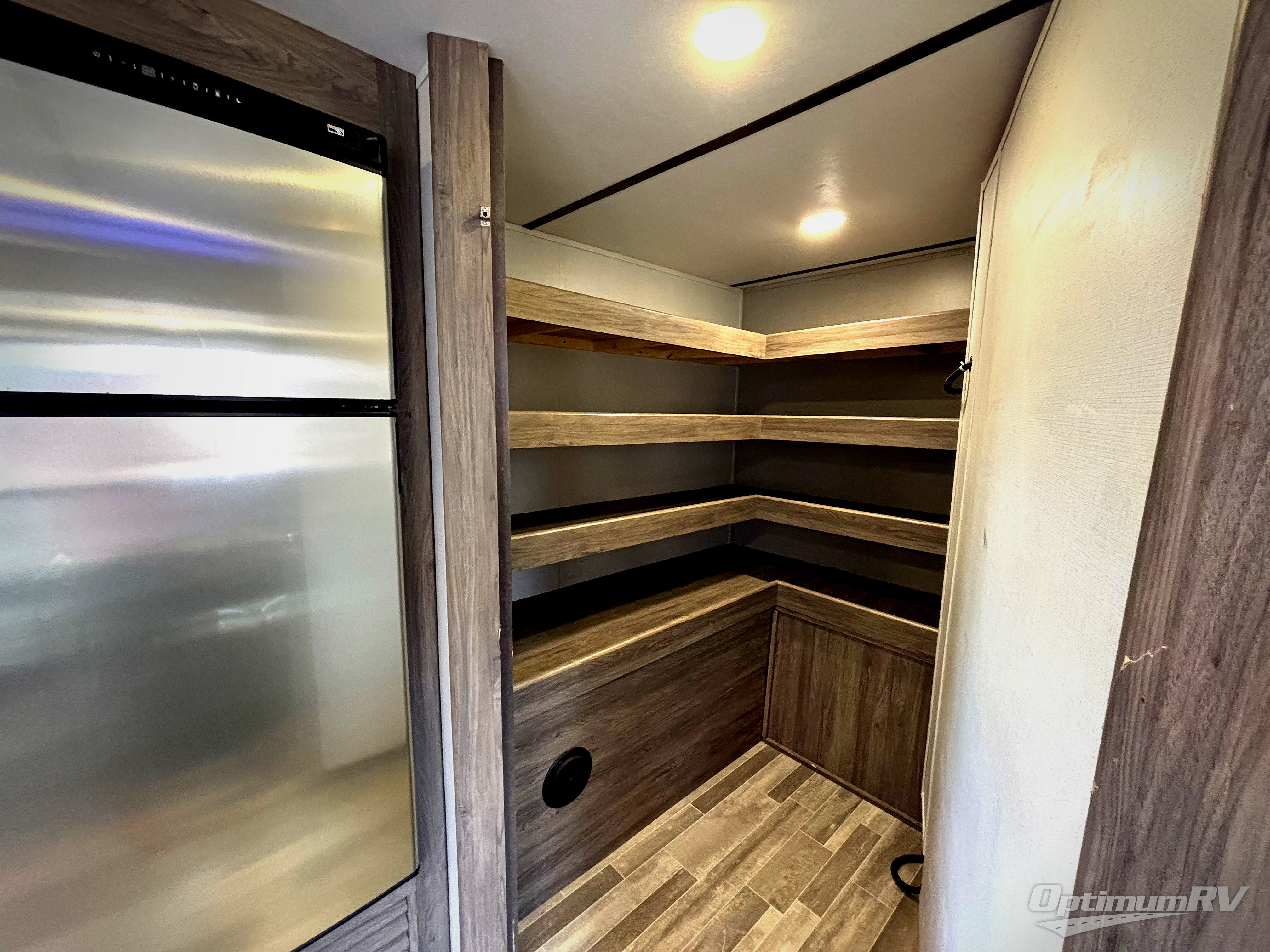 This fabulous Zinger travel trailer is ideal for the couple who enjoys entertaining guests! The huge pantry that is hidden behind the swivel entertainment center, the wine cooler and hutch, and the outdoor kitchen all work together to create the perfect party unit. If your afternoon guests turn into overnight guests, the 64" jackknife sofa and U-shaped dinette will fold down into sleeping accommodations for them, and the RV queen bed in the front private bedroom will be your retreat away from the group. There has even been a space prepped to add a washer and dryer if you choose!
