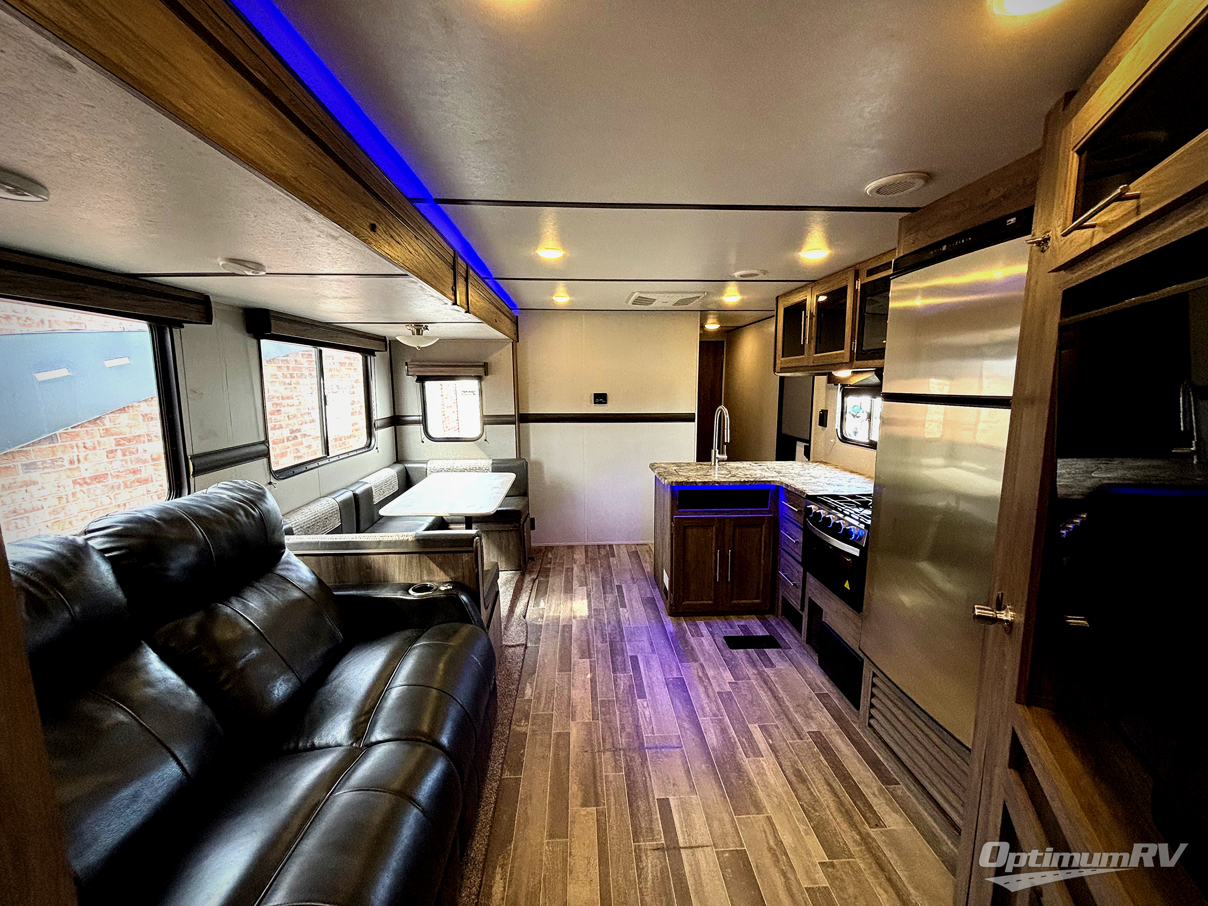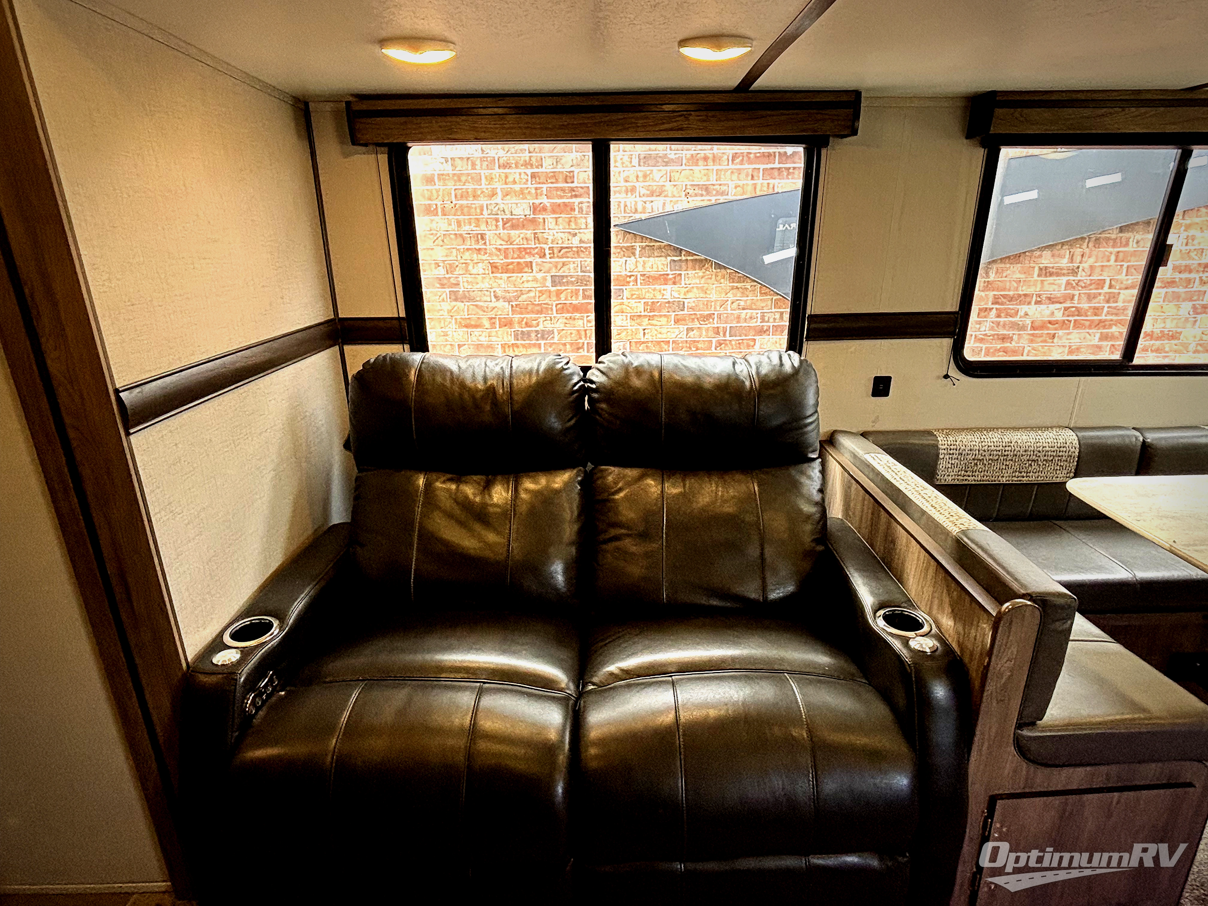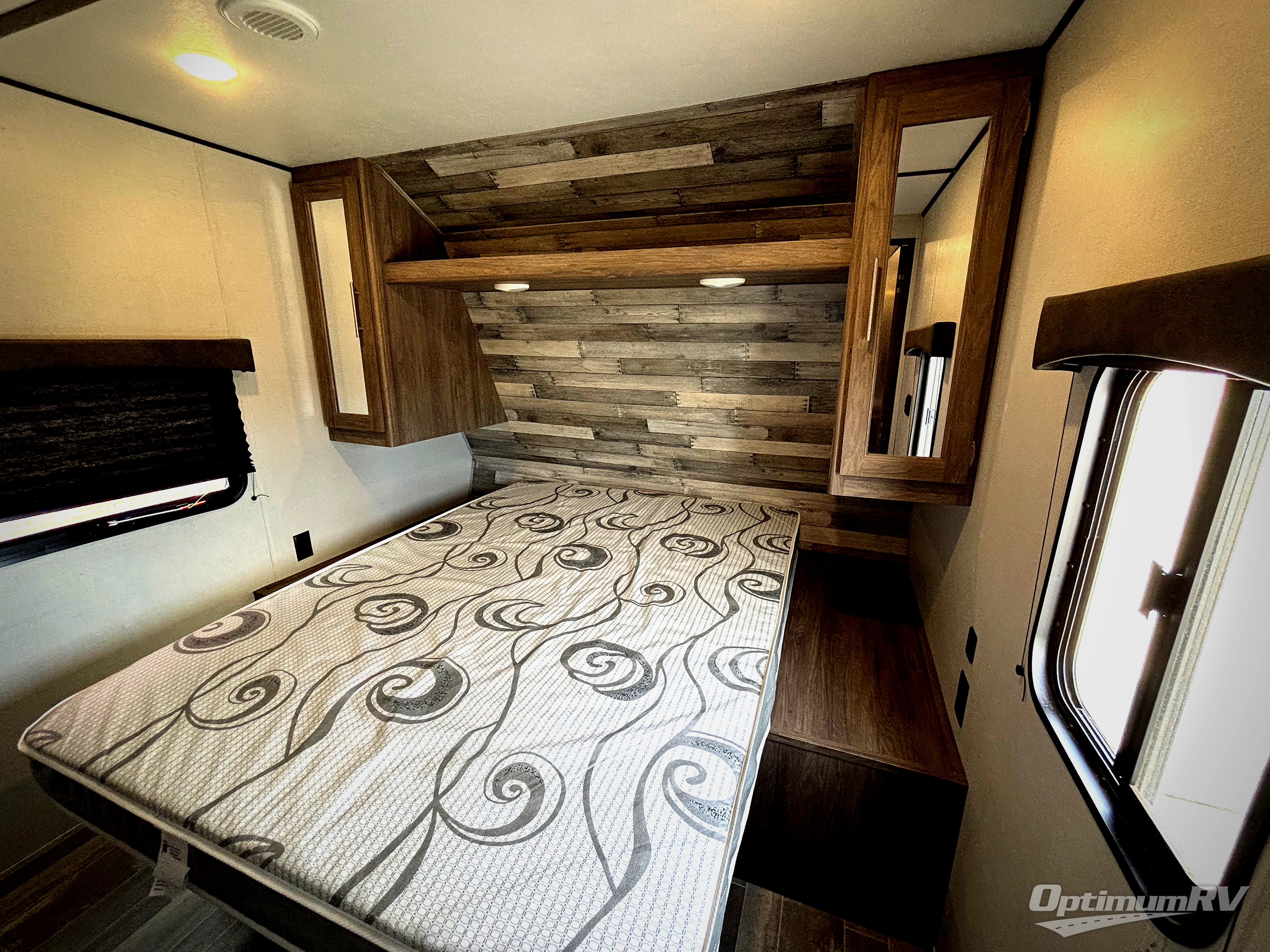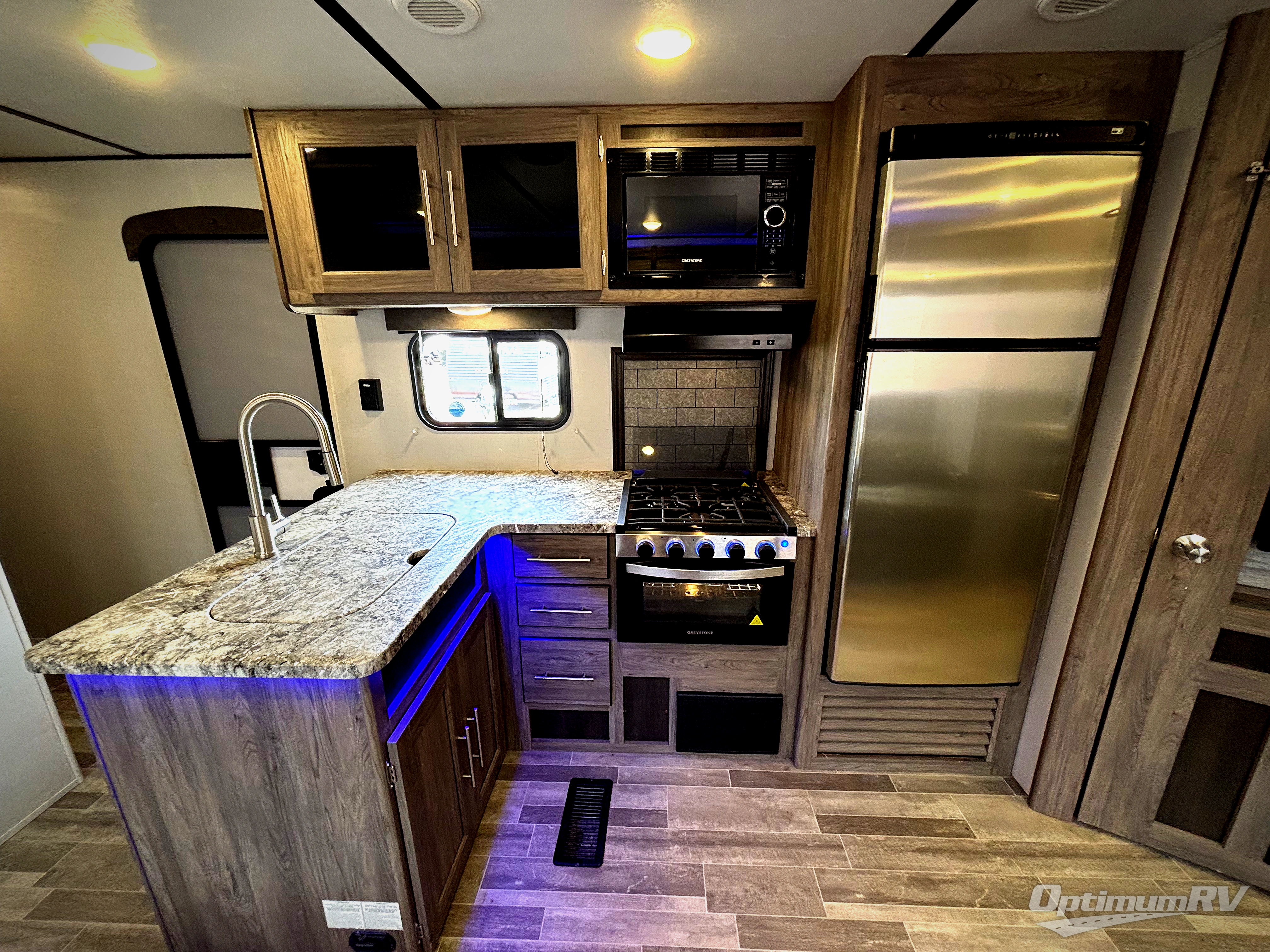 This fabulous Zinger travel trailer is ideal for the couple who enjoys entertaining guests! The huge pantry that is hidden behind the swivel entertainment center, the wine cooler and hutch, and the outdoor kitchen all work together to create the perfect party unit. If your afternoon guests turn into overnight guests, the 64" jackknife sofa and U-shaped dinette will fold down into sleeping accommodations for them, and the RV queen bed in the front private bedroom will be your retreat away from the group. There has even been a space prepped to add a washer and dryer if you choose!