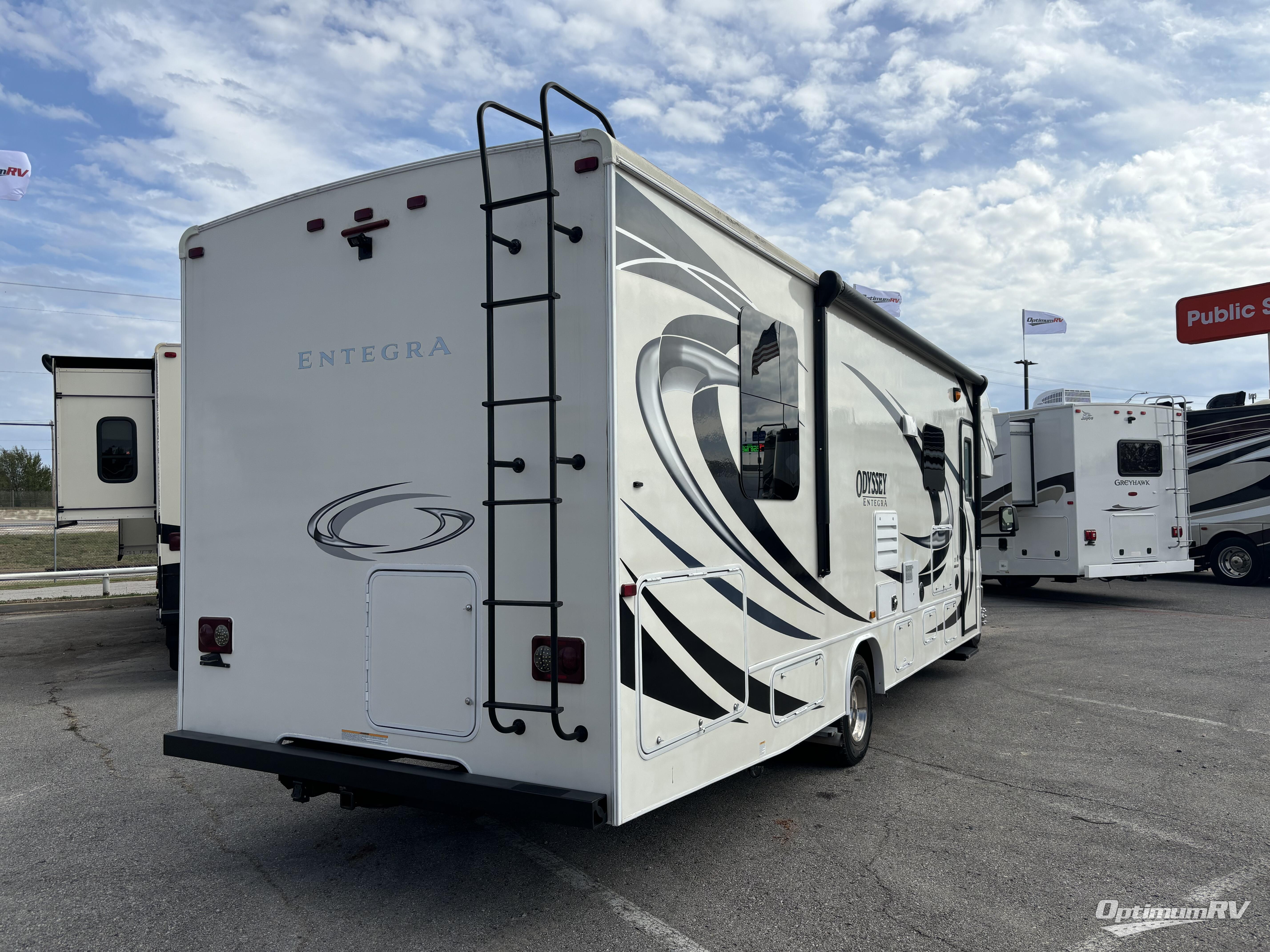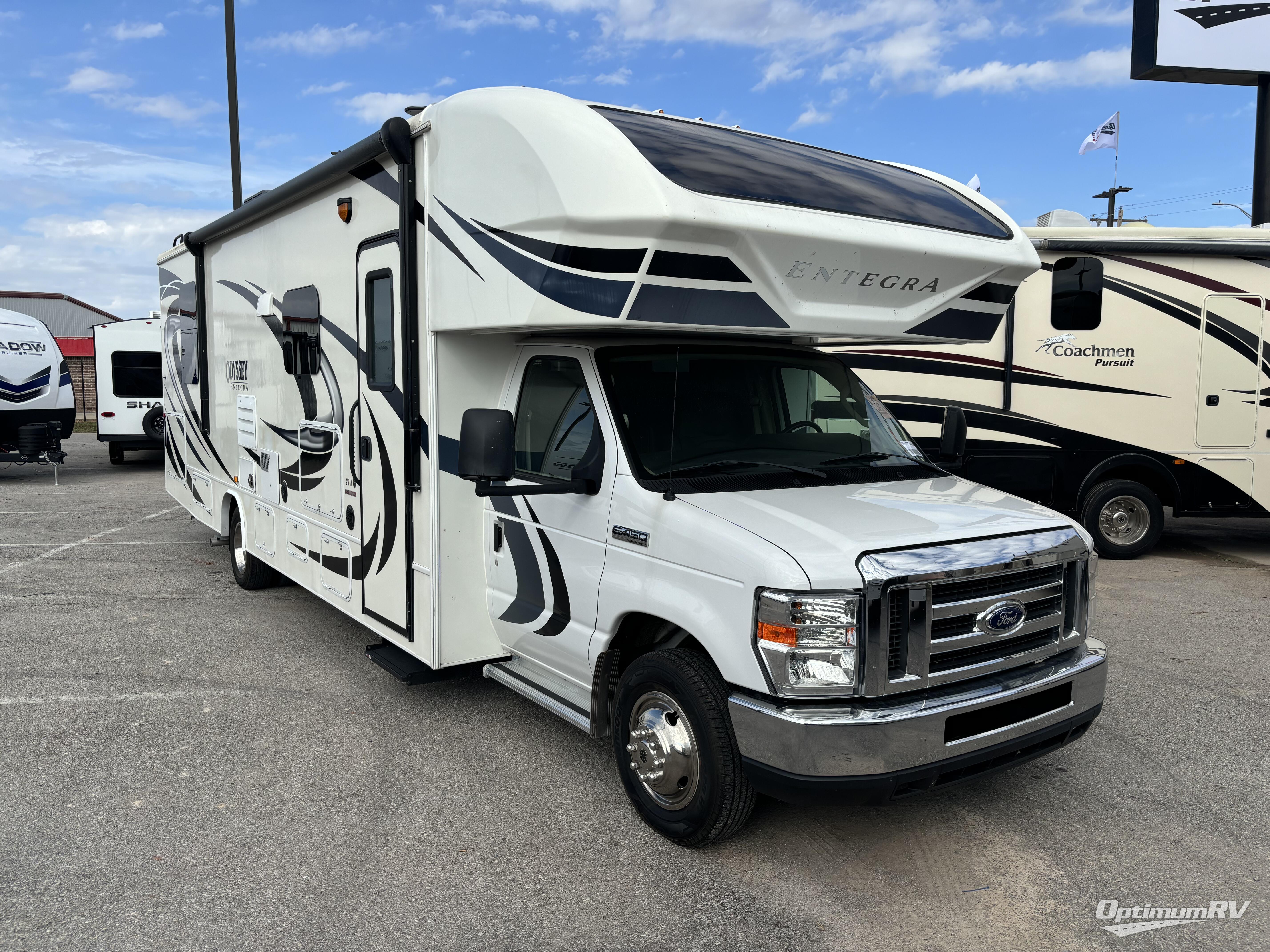 Each Odyssey Class C gas motorhome by Entegra Coach is built upon a Ford E-450 chassis with a Triton 6.8L EFI V-10 305 HP engine with 420 lbs/ft. torque to power any trip you have planned. You'll appreciate the 7,500 lb. hitch with 750 lb. tongue capacity and 7-pin plug to bring the family car along and the 55 gallon fuel tank will keep you on the road for miles. Inside, you'll find linoleum flooring, a 32" LED HDTV, a Furrion all-in-one cooktop and oven, a residential microwave, plus large wardrobes in the bedroom for all your clothes. The models also include aluminum running boards, a 12V LED lit electric awning, high-output marine-grade exterior speakers, plus an outside shower to wash off your hiking gear.