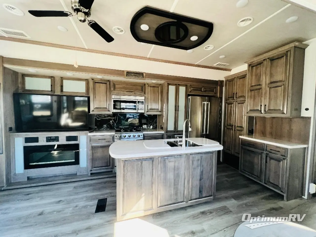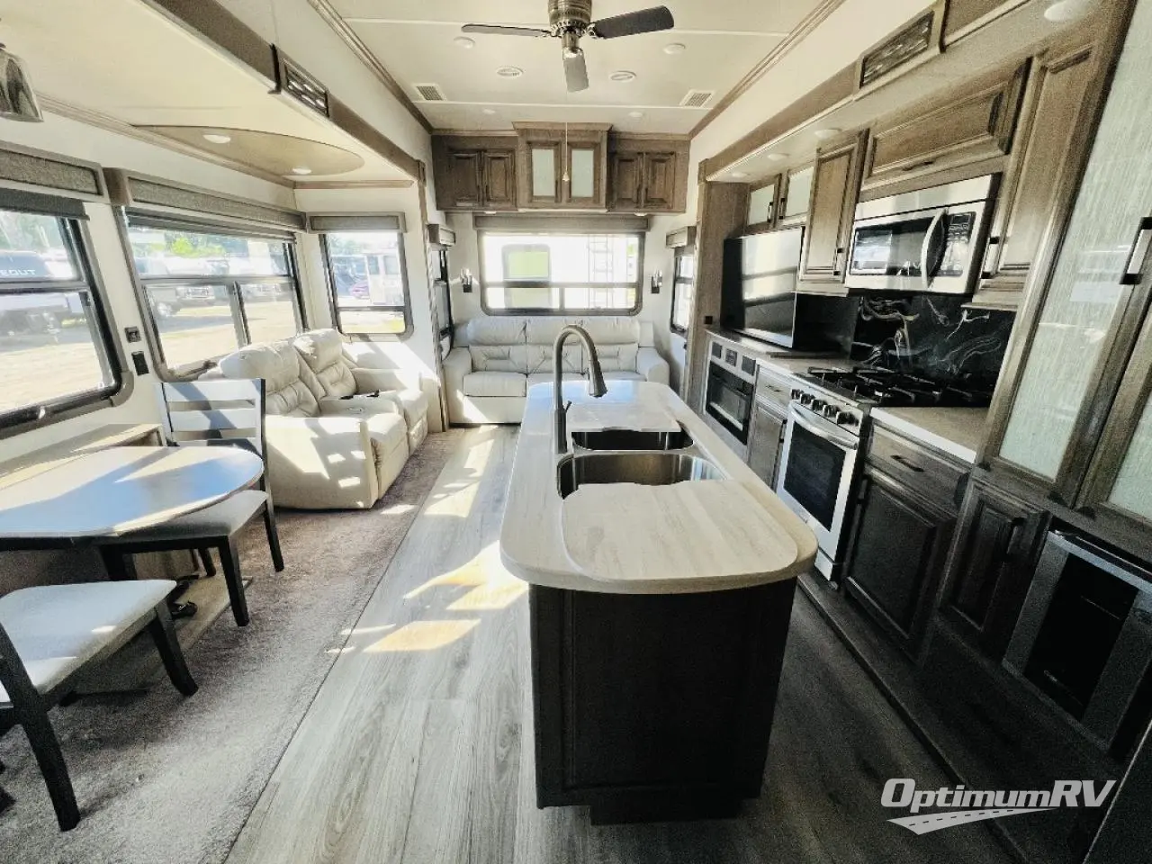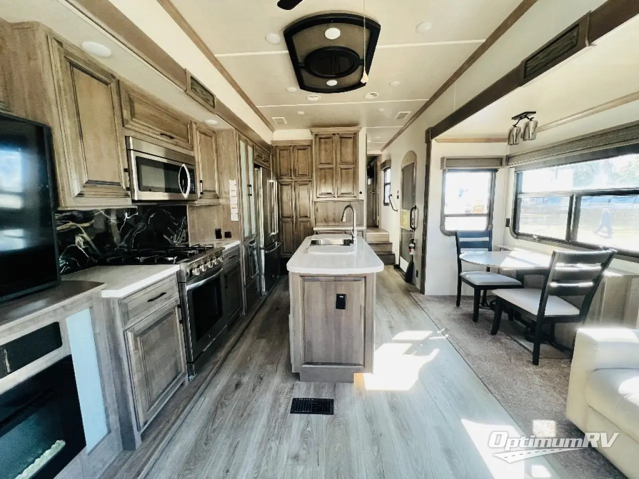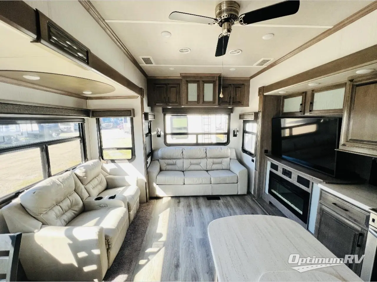 This fifth wheel is the perfect couple's coach to enjoy traveling the countryside with or setting up home base for awhile longer at your favorite location. From the three spacious slide outs for increased interior space, to the theater seats directly across from the fireplace, you will feel right at home! The kitchen island has a double sink, extra counter space, plus you can add an optional dishwasher which will speed up the clean-up process. Enjoy your meals at the free-standing dinette, and at night head up the stairs to the private front bedroom where you will find a king bed, a full-length wardrobe for your clothes, plus there is a spot that has been prepped for a washer and dryer so that you can easily keep up with the laundry while you are away from home!