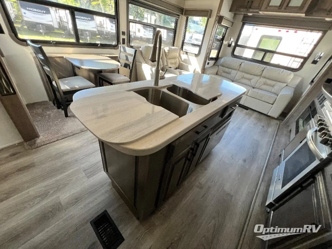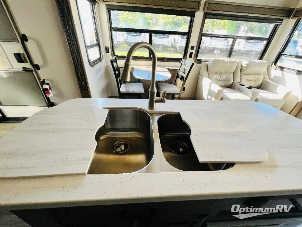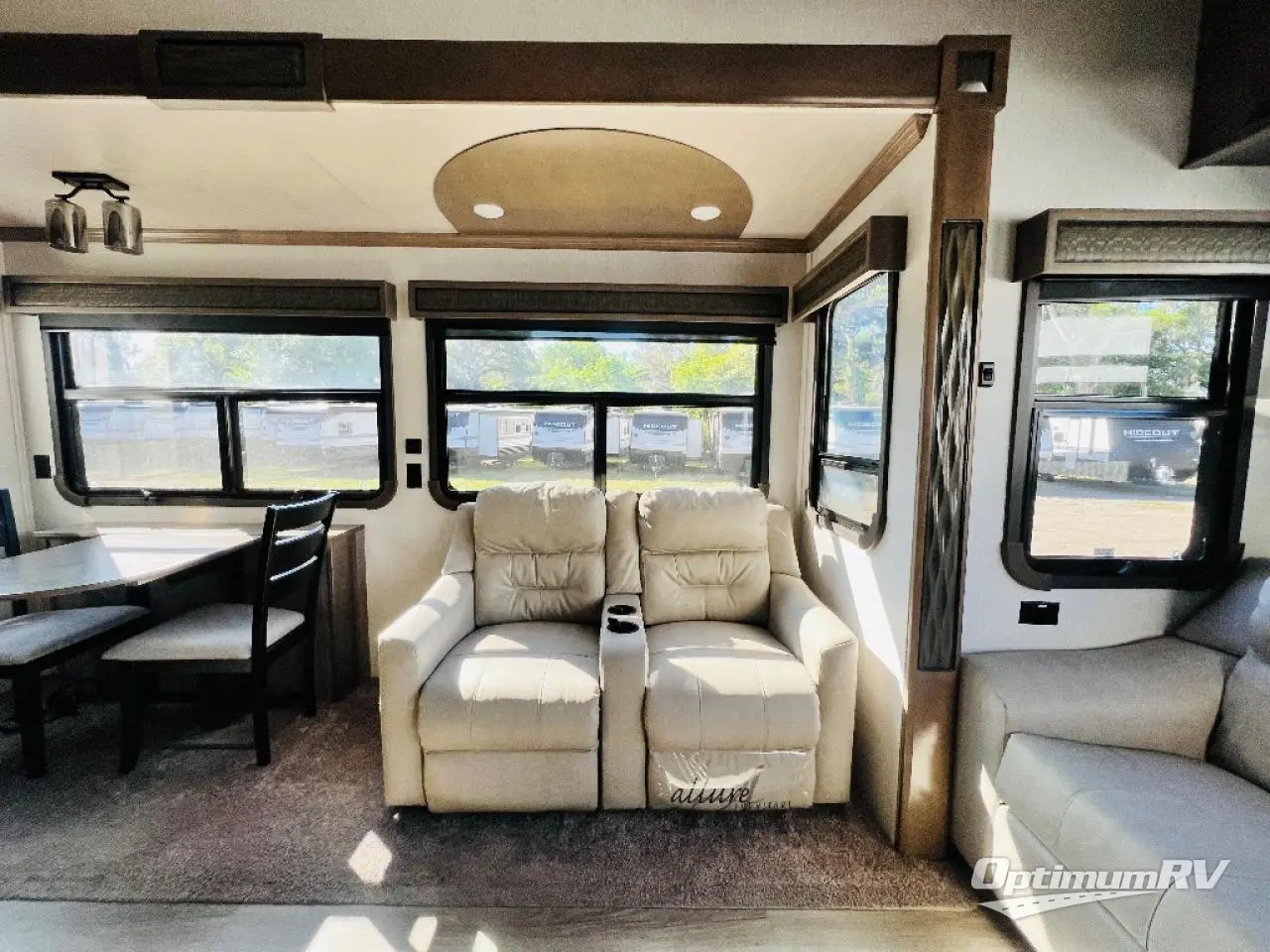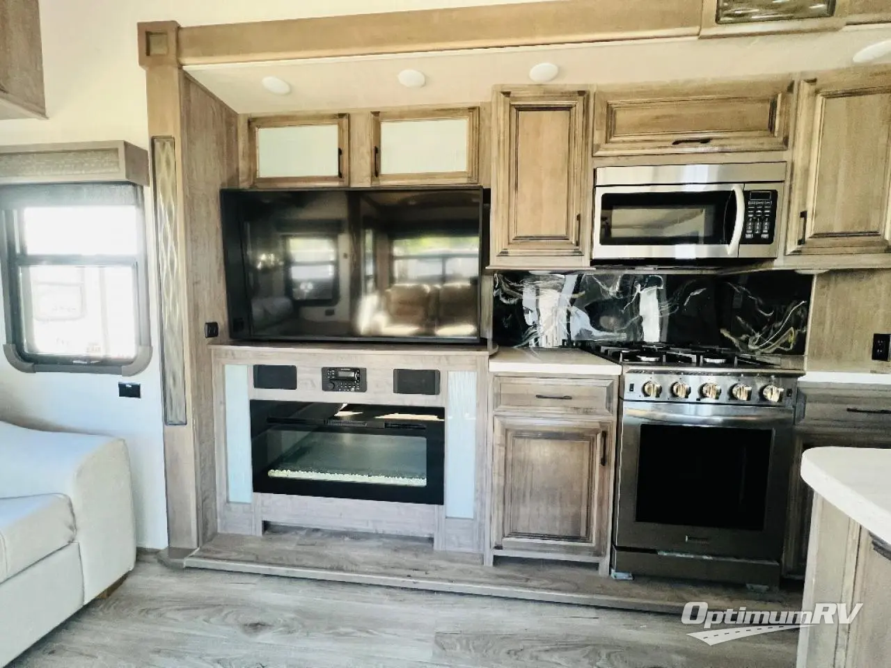 This fifth wheel is the perfect couple's coach to enjoy traveling the countryside with or setting up home base for awhile longer at your favorite location. From the three spacious slide outs for increased interior space, to the theater seats directly across from the fireplace, you will feel right at home! The kitchen island has a double sink, extra counter space, plus you can add an optional dishwasher which will speed up the clean-up process. Enjoy your meals at the free-standing dinette, and at night head up the stairs to the private front bedroom where you will find a king bed, a full-length wardrobe for your clothes, plus there is a spot that has been prepped for a washer and dryer so that you can easily keep up with the laundry while you are away from home!