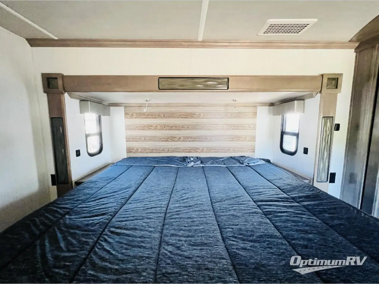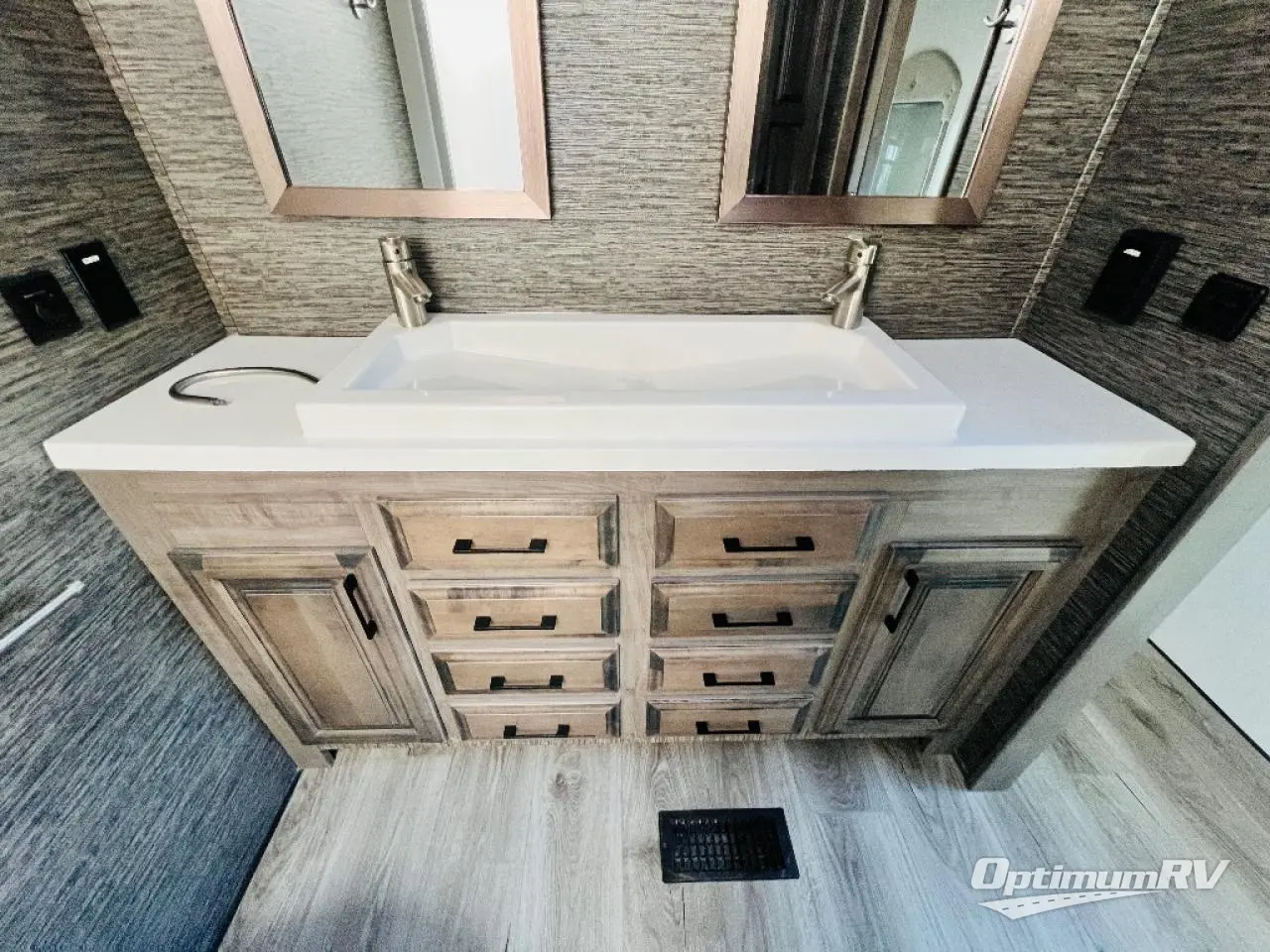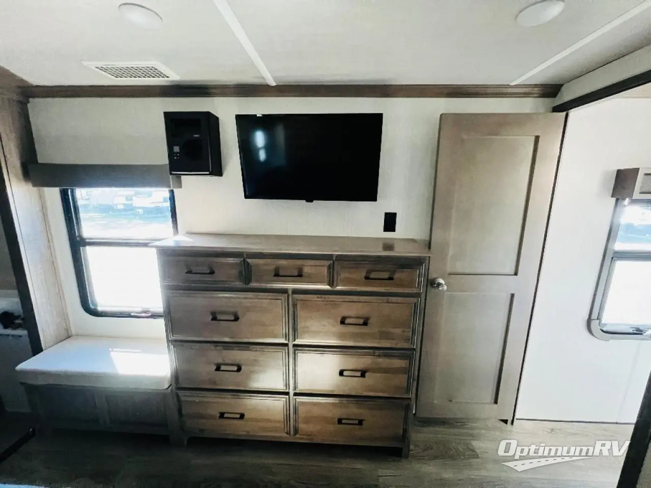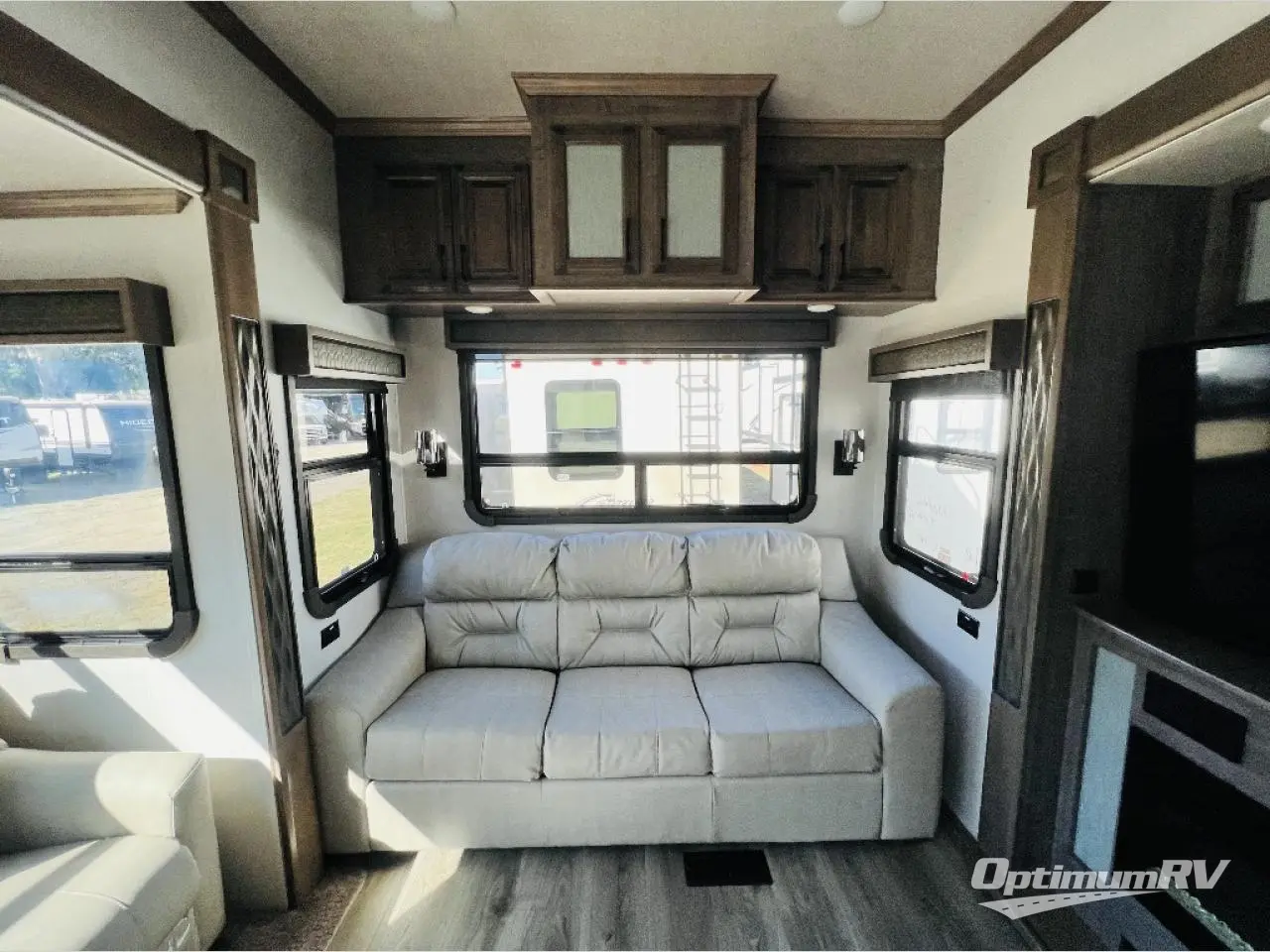 This fifth wheel is the perfect couple's coach to enjoy traveling the countryside with or setting up home base for awhile longer at your favorite location. From the three spacious slide outs for increased interior space, to the theater seats directly across from the fireplace, you will feel right at home! The kitchen island has a double sink, extra counter space, plus you can add an optional dishwasher which will speed up the clean-up process. Enjoy your meals at the free-standing dinette, and at night head up the stairs to the private front bedroom where you will find a king bed, a full-length wardrobe for your clothes, plus there is a spot that has been prepped for a washer and dryer so that you can easily keep up with the laundry while you are away from home!