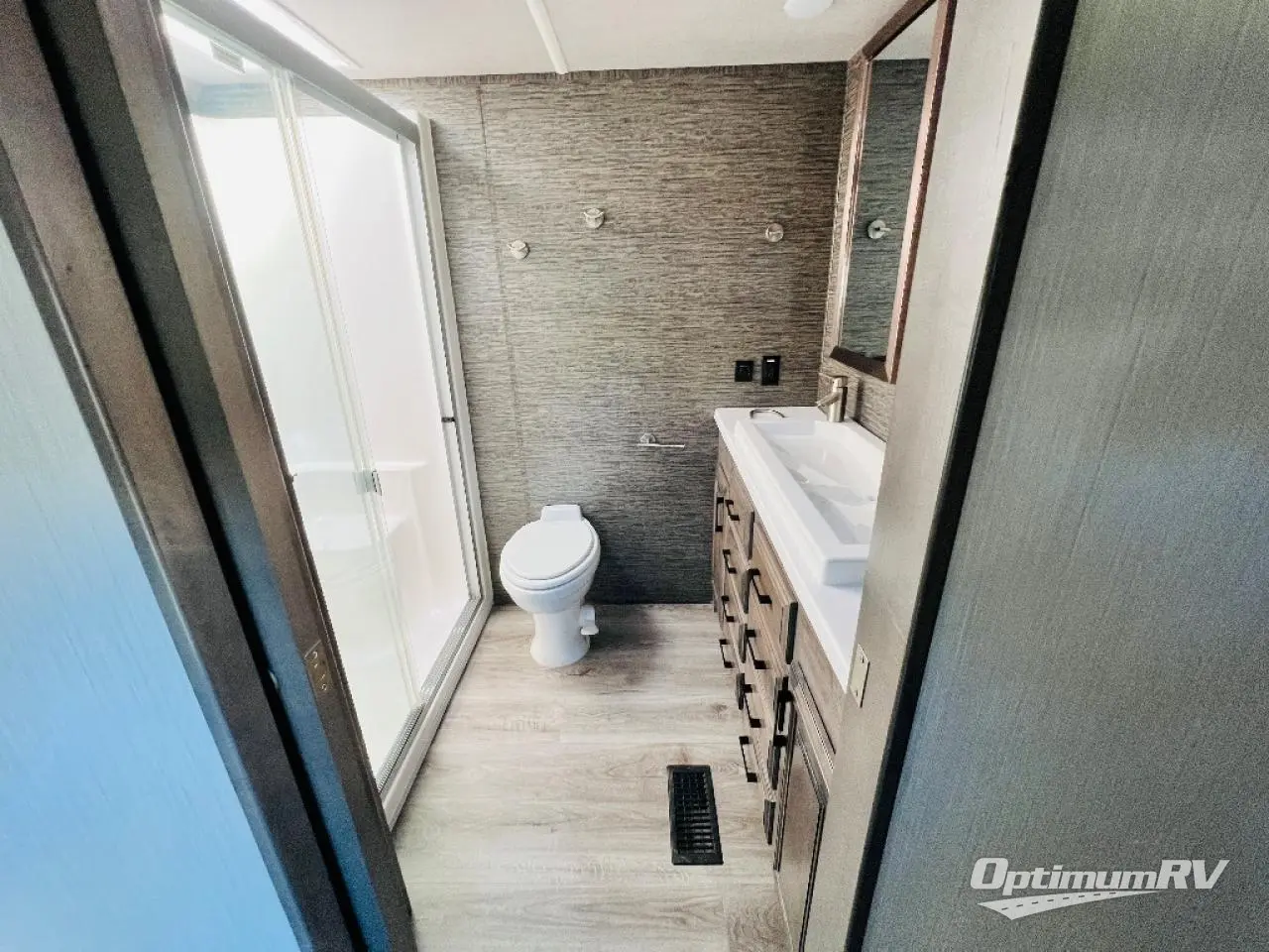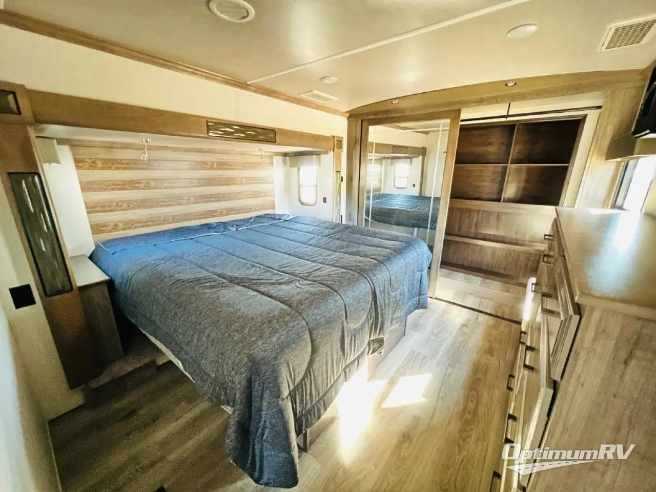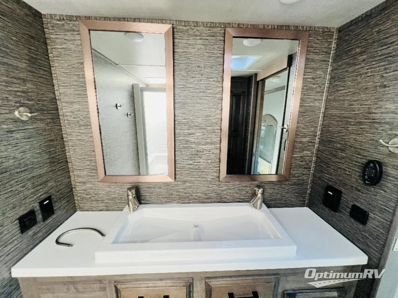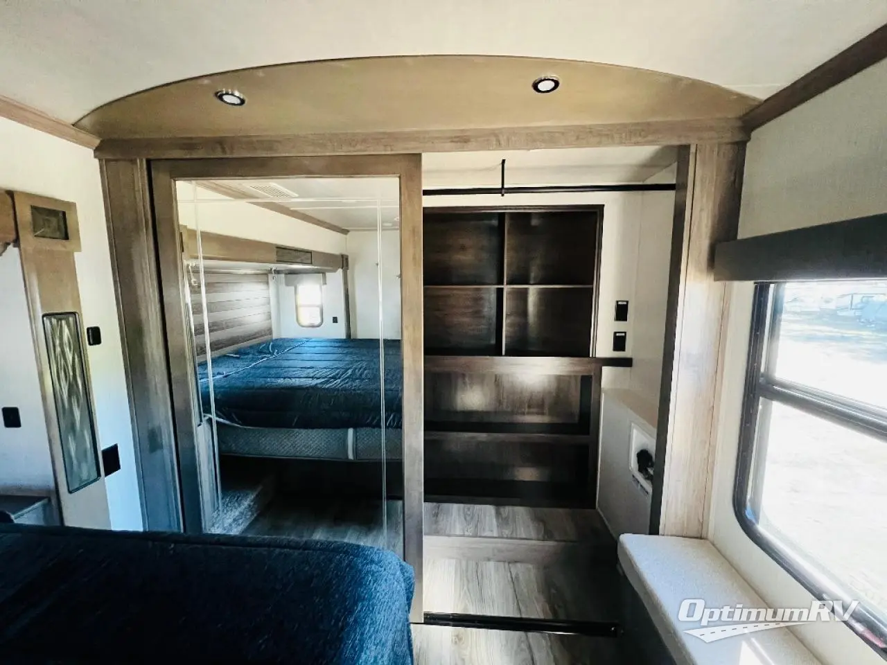 This fifth wheel is the perfect couple's coach to enjoy traveling the countryside with or setting up home base for awhile longer at your favorite location. From the three spacious slide outs for increased interior space, to the theater seats directly across from the fireplace, you will feel right at home! The kitchen island has a double sink, extra counter space, plus you can add an optional dishwasher which will speed up the clean-up process. Enjoy your meals at the free-standing dinette, and at night head up the stairs to the private front bedroom where you will find a king bed, a full-length wardrobe for your clothes, plus there is a spot that has been prepped for a washer and dryer so that you can easily keep up with the laundry while you are away from home!
