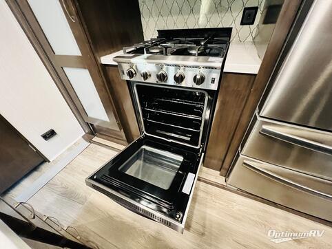 Whether you decided to go full-time RVing, or camping at your local state park, this fifth wheel is packed with at-home features you're sure to love. The front entertainment/living area allows you to relax like you do at home and with dual opposing slides, you'll have more space to stretch out. The power theater seats sit directly across from the 50" TV on swing arm for easy viewing and you'll find two tri-fold sofas for the grandkids to sleep on at night. The chef of the family will have everything they need to prepare meals each day; a 24" free-standing gas range, an over-the-range microwave, a hutch and pantry for extra storage space, and a kitchen island. You'll also find dual opposing slides in the kitchen as well to create an open space and the half bath is located right off of the kitchen for convenience. This fifth wheel features a private suite with a king bed slide out and a large full rear bath, complete with a shower with a seat and drop-down storage for toiletries.