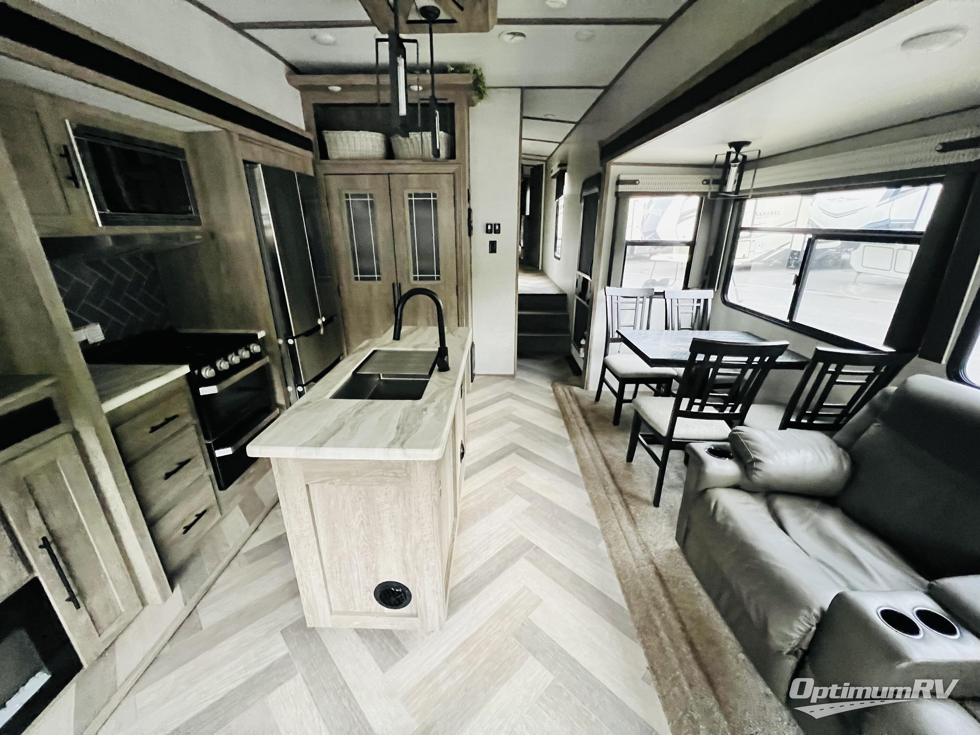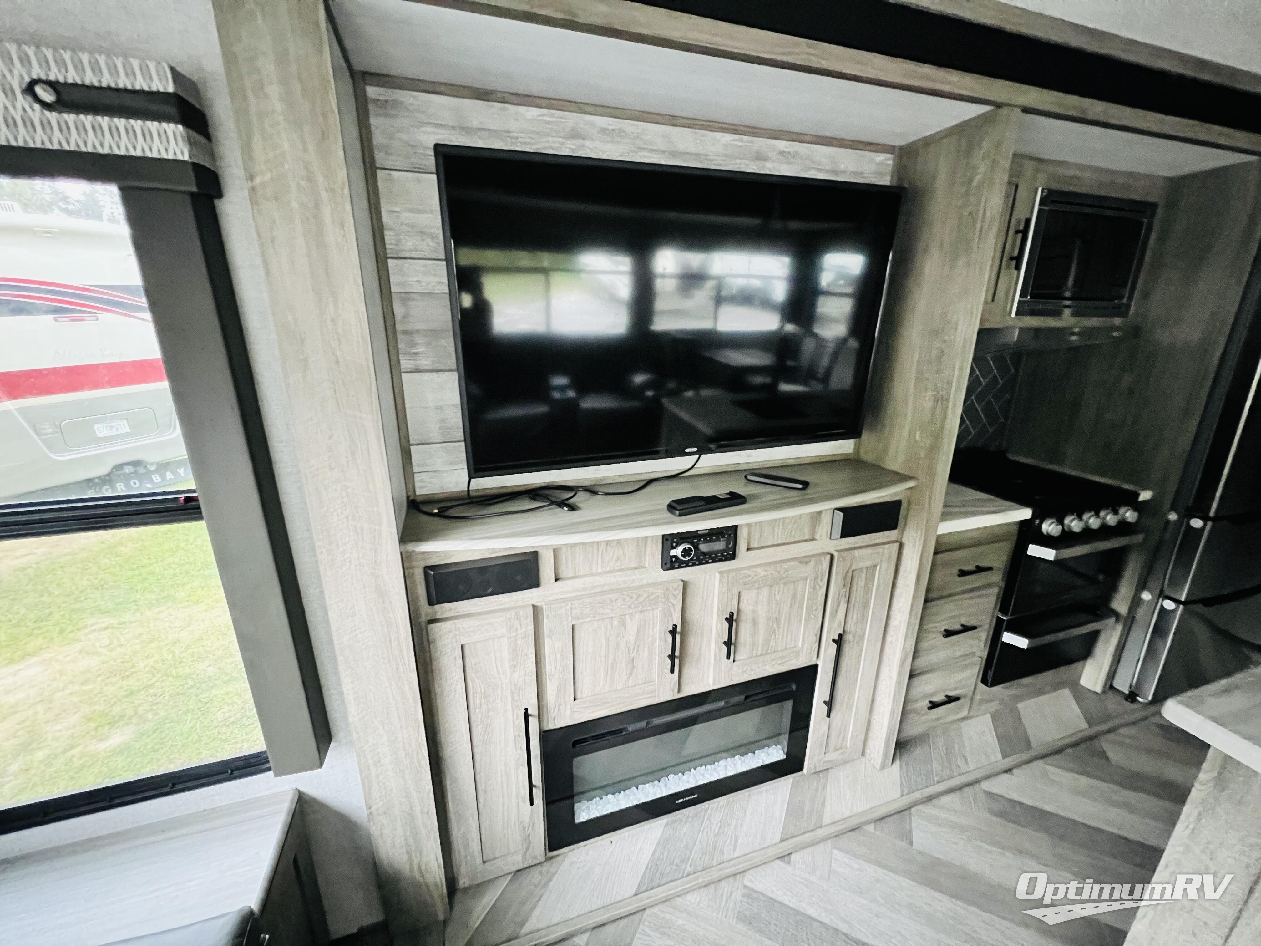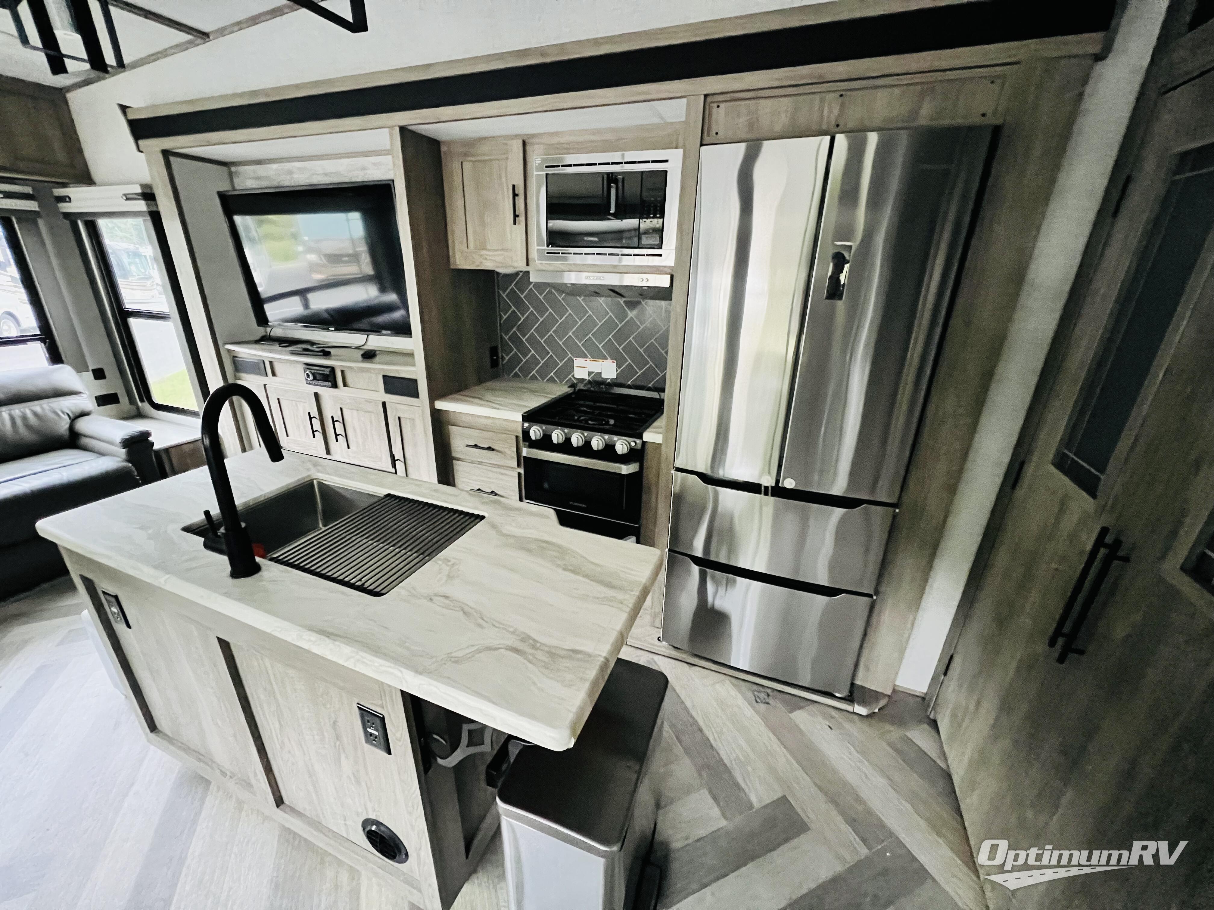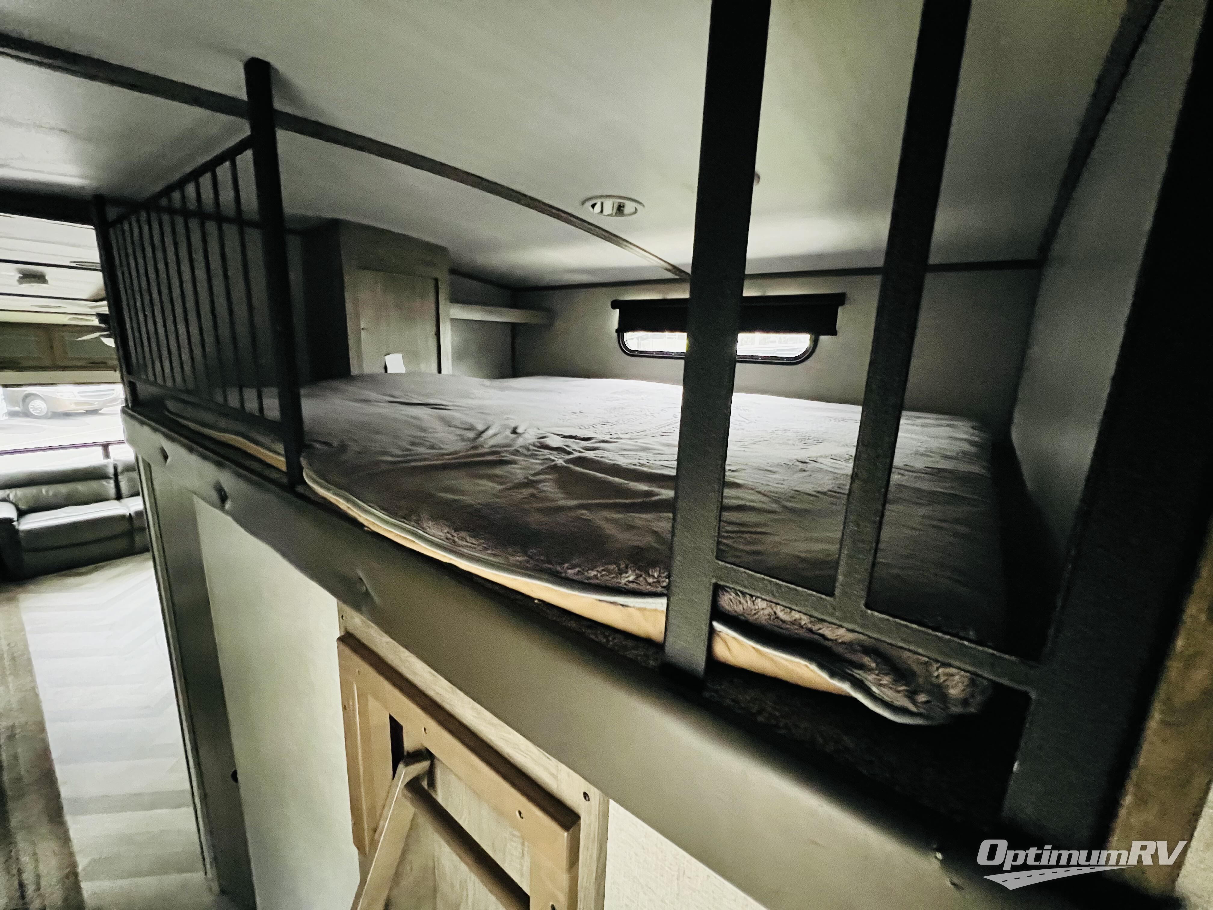 You won't know where to begin when you enter this fifth wheel! The rear living area has plenty of entertainment and seating options between the tri-fold sofa and the theatre seating with cupholders, the 50" LED TV, and the 32" glass front electric fireplace. Meal prepping and clean up will be a breeze thanks to the kitchen island with a large sink, and the deluxe French door pantry is big enough to store everyone's favorite snacks. Inside the second bedroom, you will find a bunk with a twin trundle bed below it and a loft above it all, plus there is a desk with a TV hookup and a dresser with a wardrobe. The exterior also has lots of features you will love like the exterior storage with a refrigerator, the coax/TV hookup, and the Texas-sized pass-through storage area!