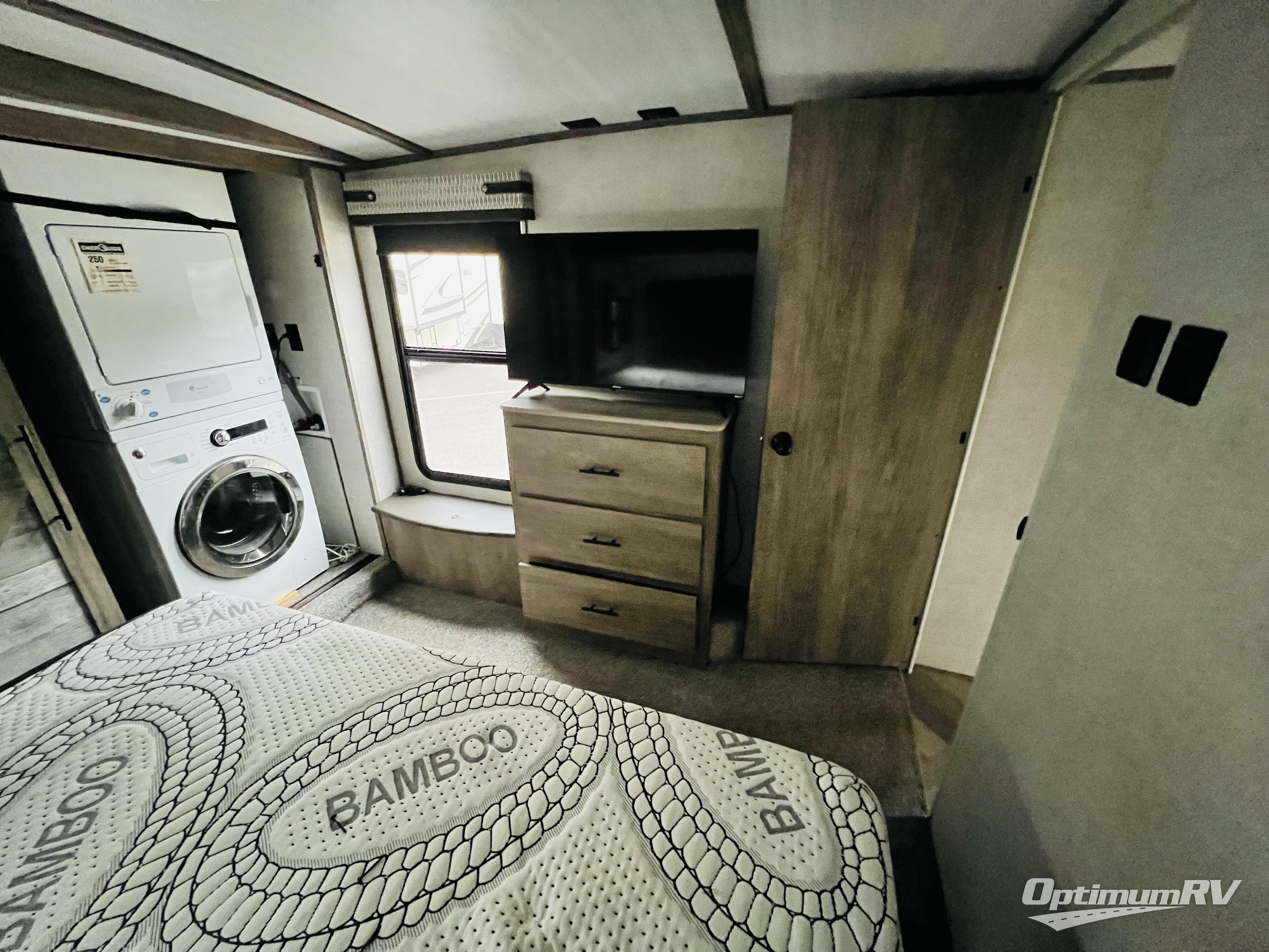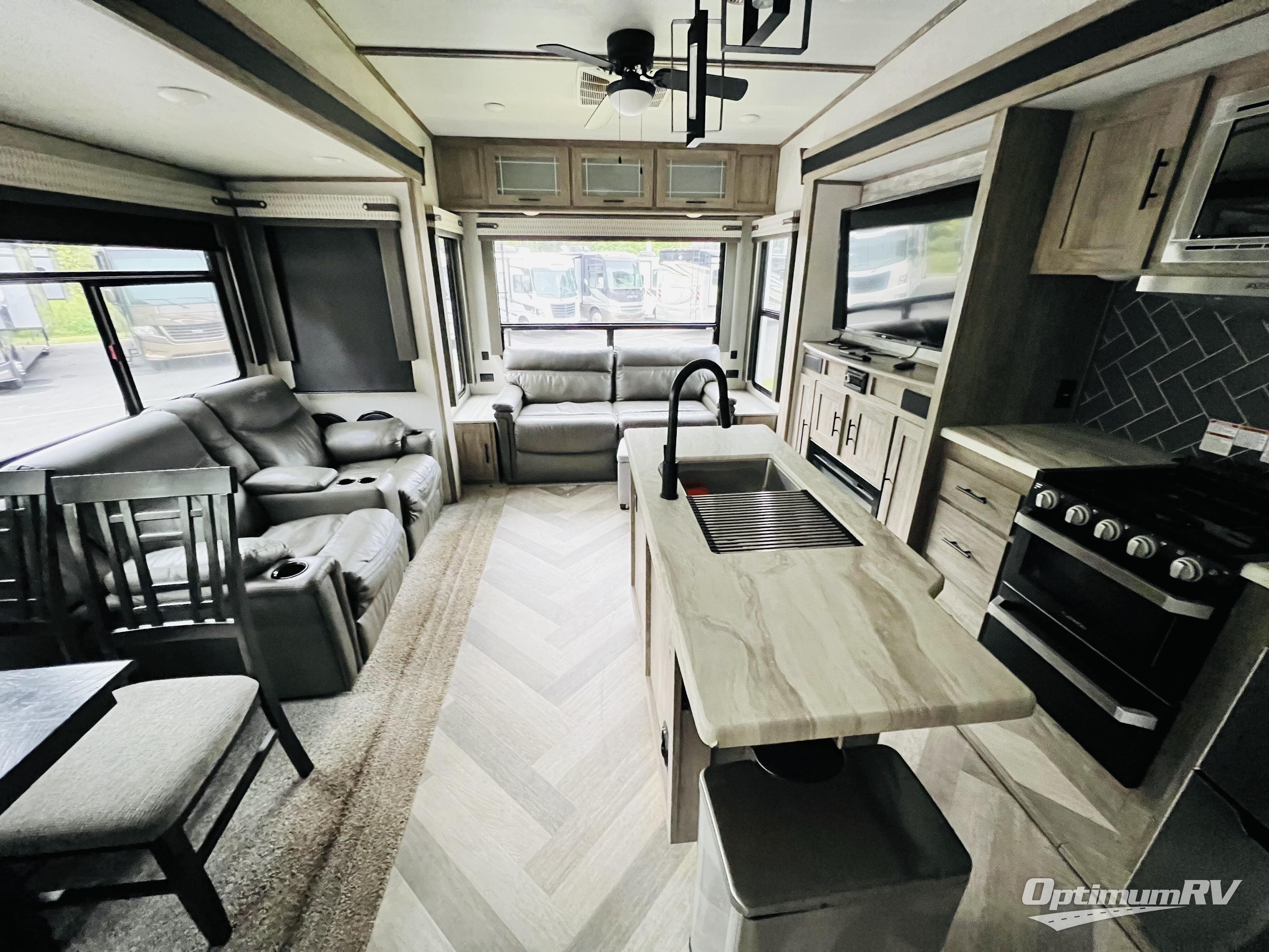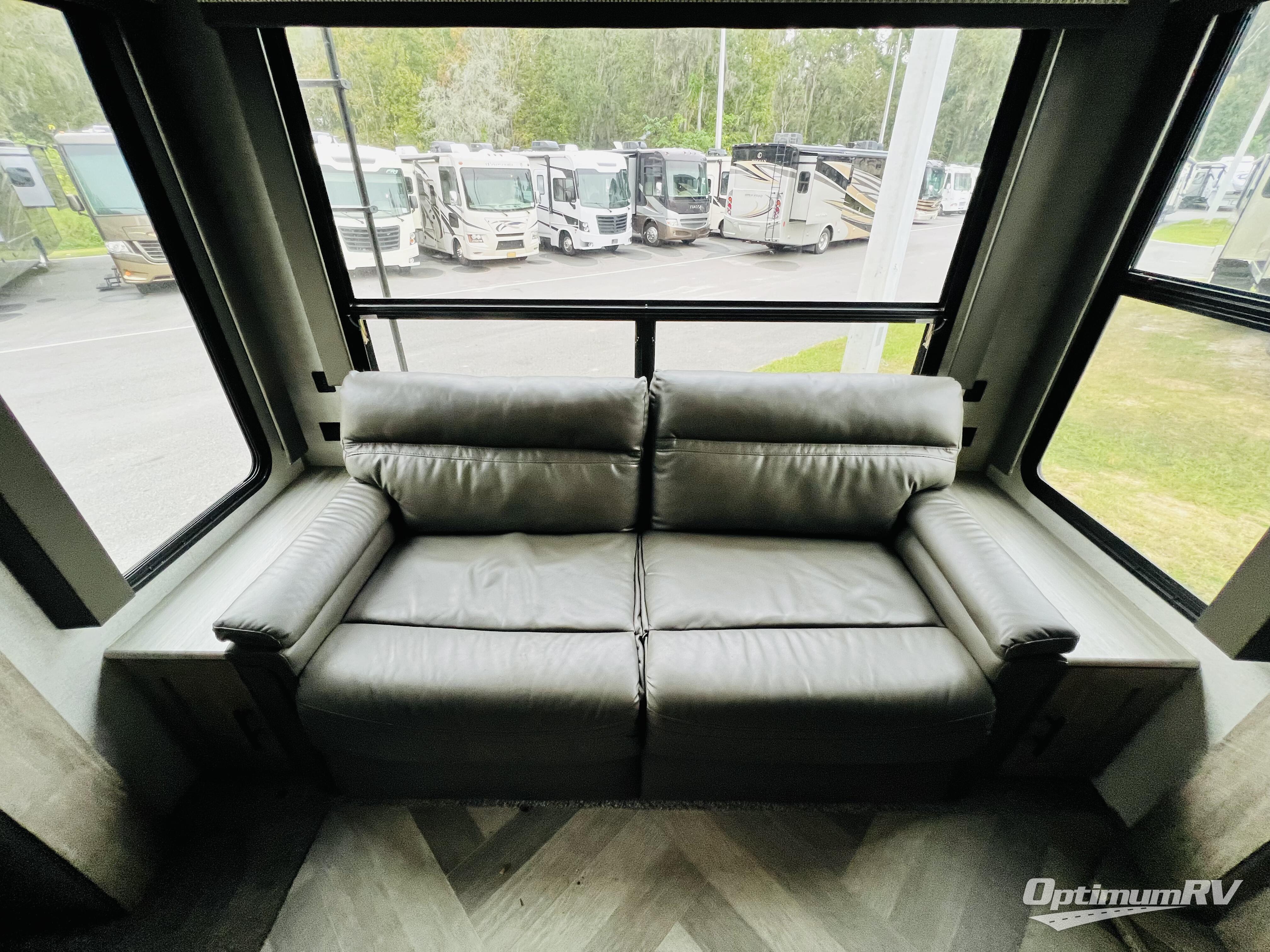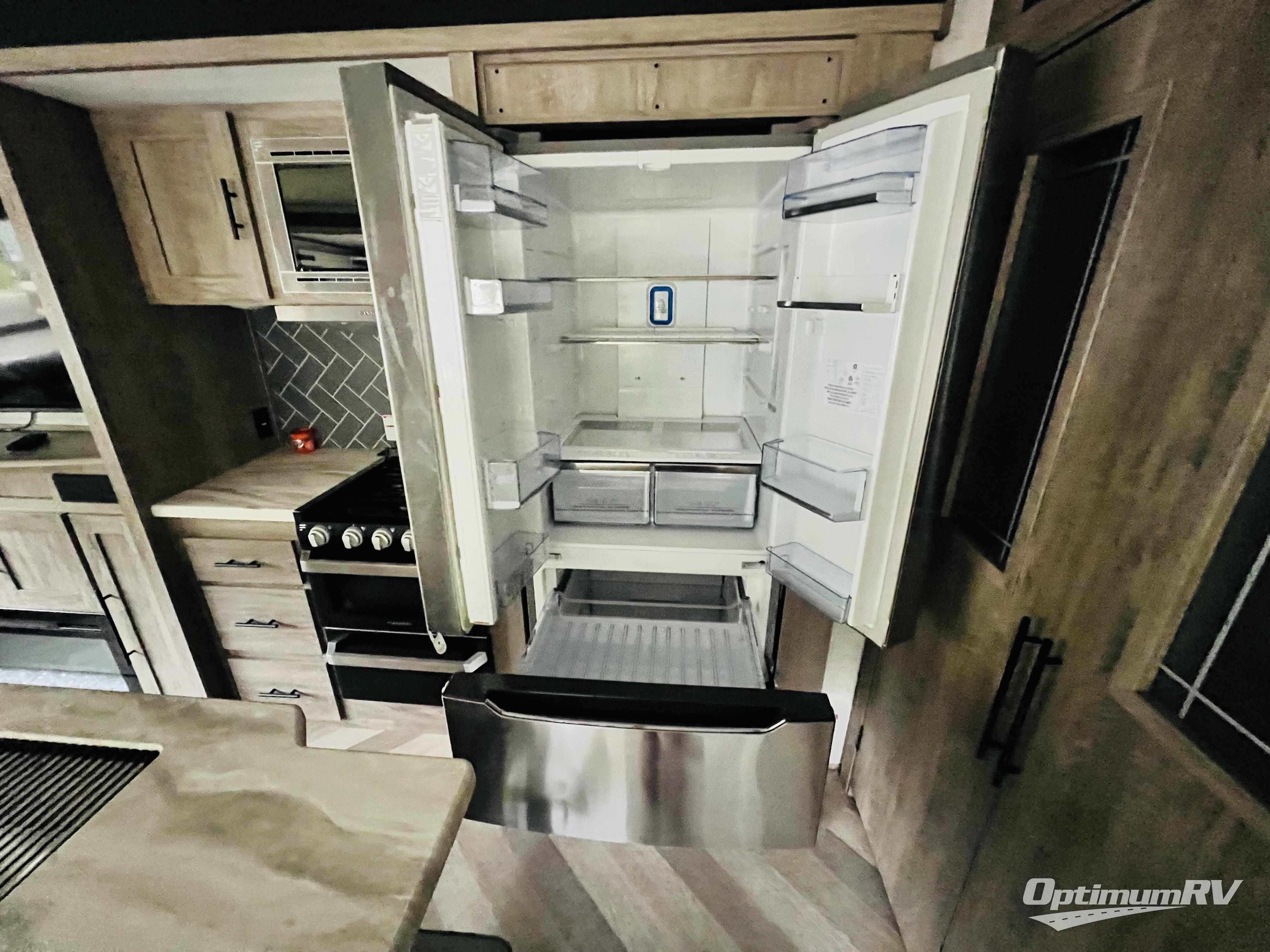 You won't know where to begin when you enter this fifth wheel! The rear living area has plenty of entertainment and seating options between the tri-fold sofa and the theatre seating with cupholders, the 50" LED TV, and the 32" glass front electric fireplace. Meal prepping and clean up will be a breeze thanks to the kitchen island with a large sink, and the deluxe French door pantry is big enough to store everyone's favorite snacks. Inside the second bedroom, you will find a bunk with a twin trundle bed below it and a loft above it all, plus there is a desk with a TV hookup and a dresser with a wardrobe. The exterior also has lots of features you will love like the exterior storage with a refrigerator, the coax/TV hookup, and the Texas-sized pass-through storage area!