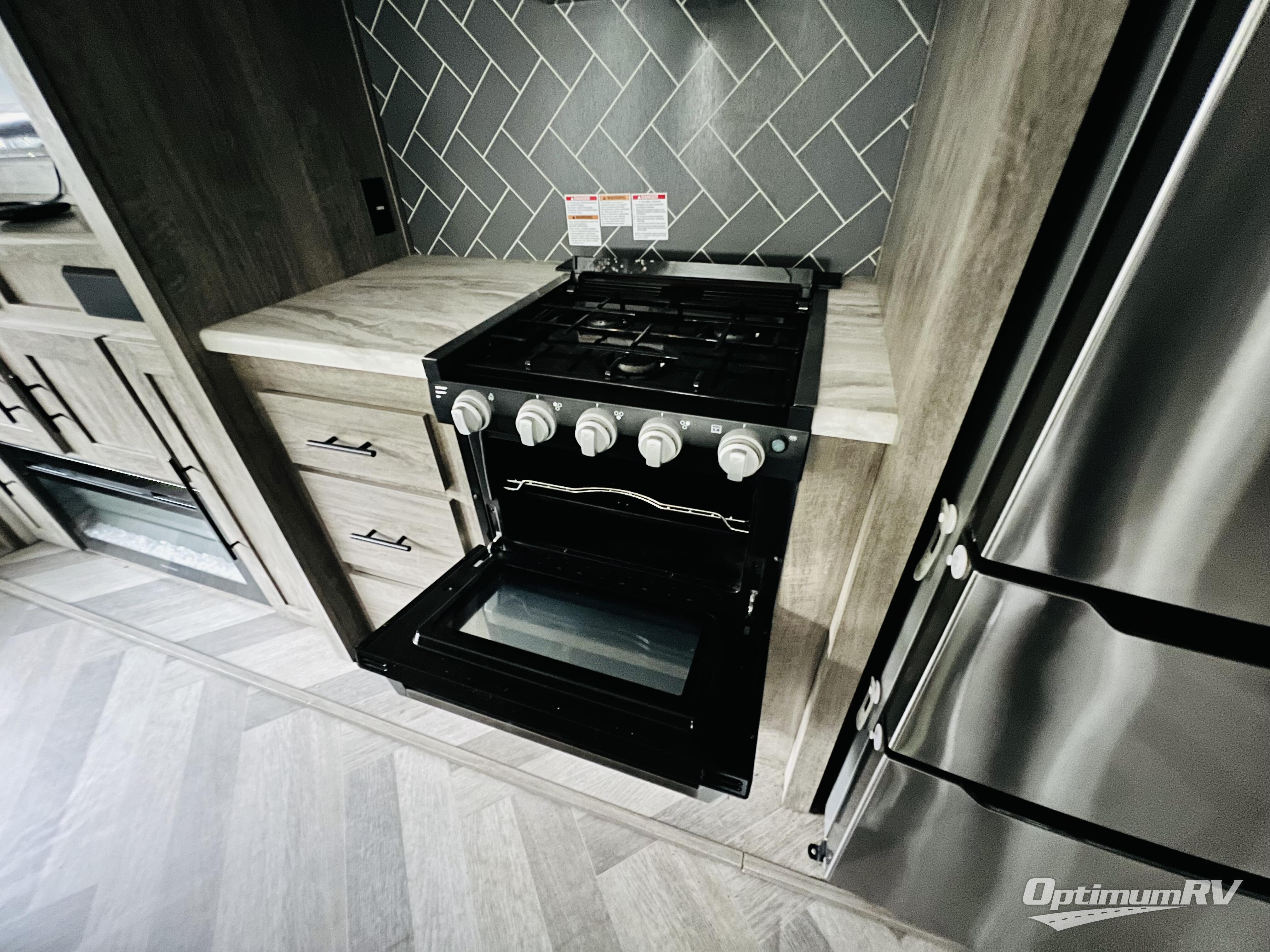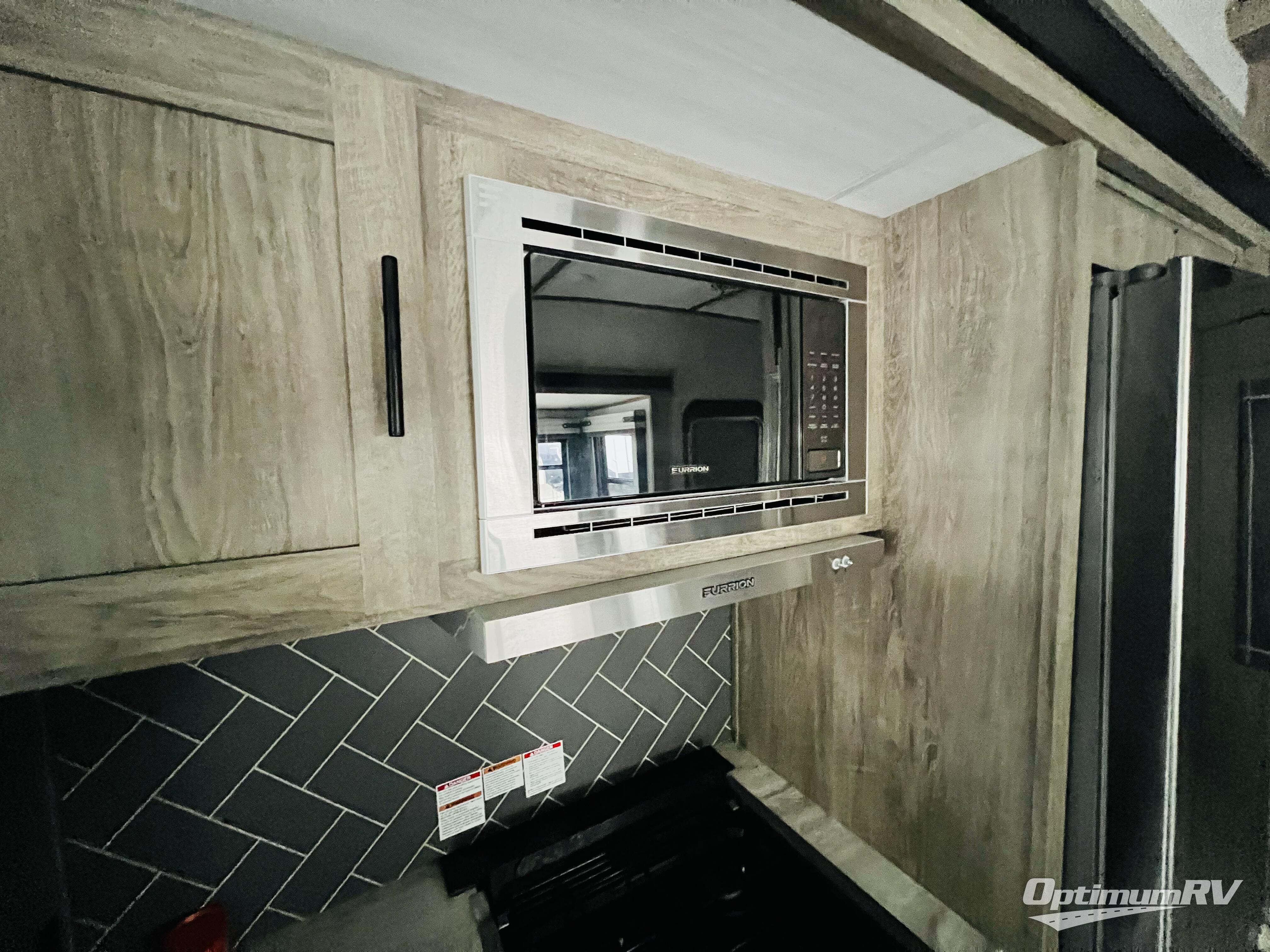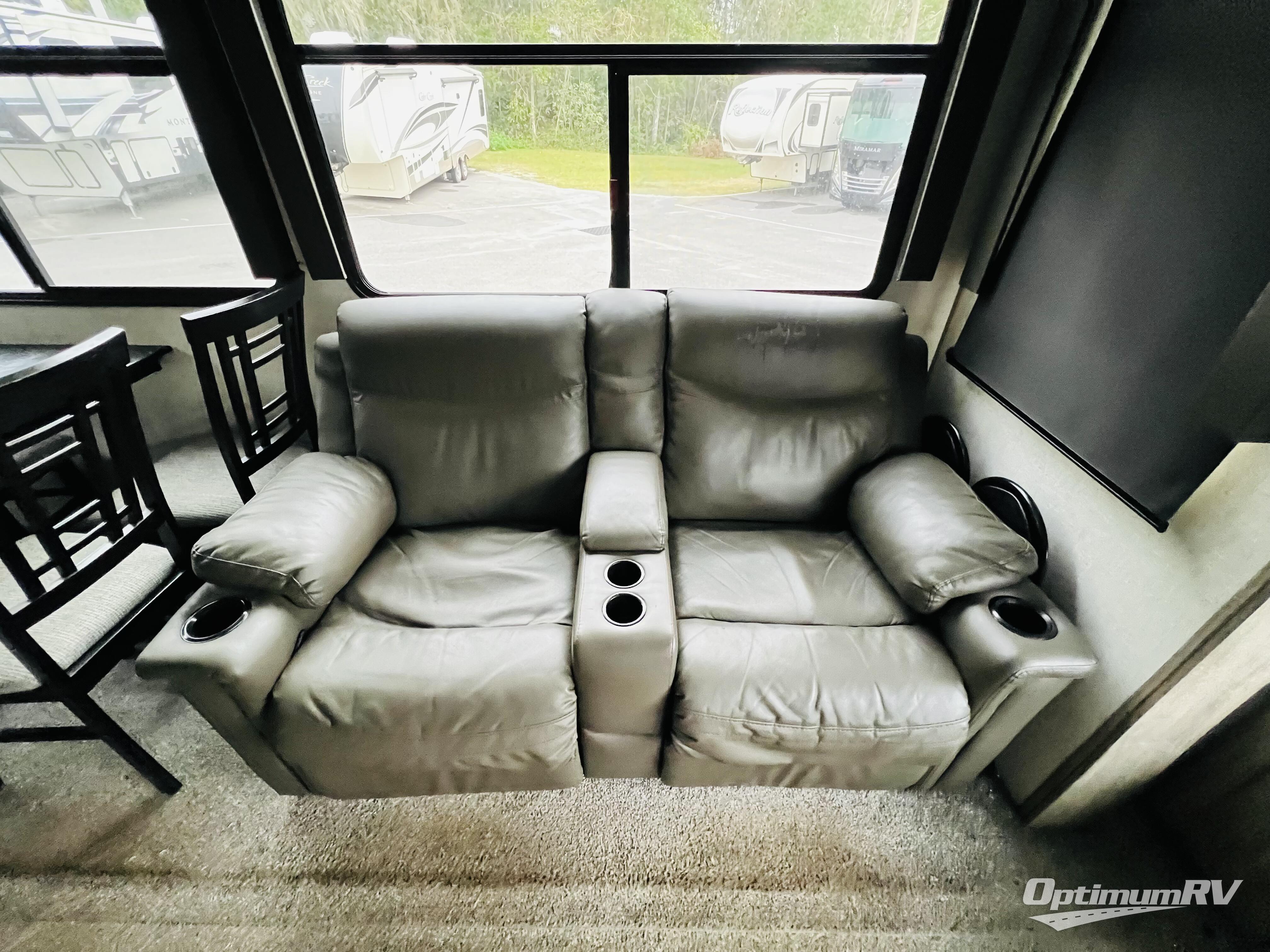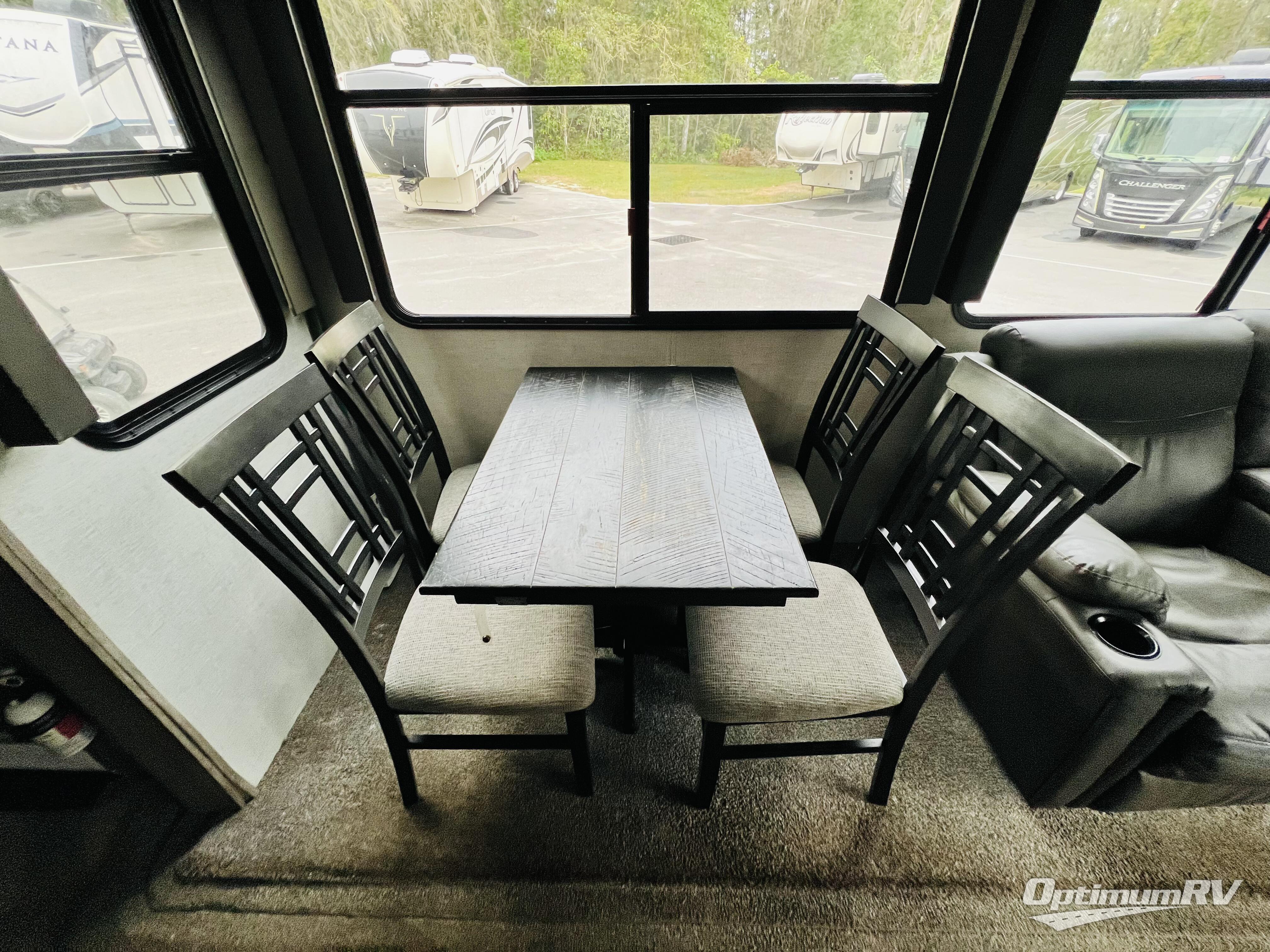 You won't know where to begin when you enter this fifth wheel! The rear living area has plenty of entertainment and seating options between the tri-fold sofa and the theatre seating with cupholders, the 50" LED TV, and the 32" glass front electric fireplace. Meal prepping and clean up will be a breeze thanks to the kitchen island with a large sink, and the deluxe French door pantry is big enough to store everyone's favorite snacks. Inside the second bedroom, you will find a bunk with a twin trundle bed below it and a loft above it all, plus there is a desk with a TV hookup and a dresser with a wardrobe. The exterior also has lots of features you will love like the exterior storage with a refrigerator, the coax/TV hookup, and the Texas-sized pass-through storage area!