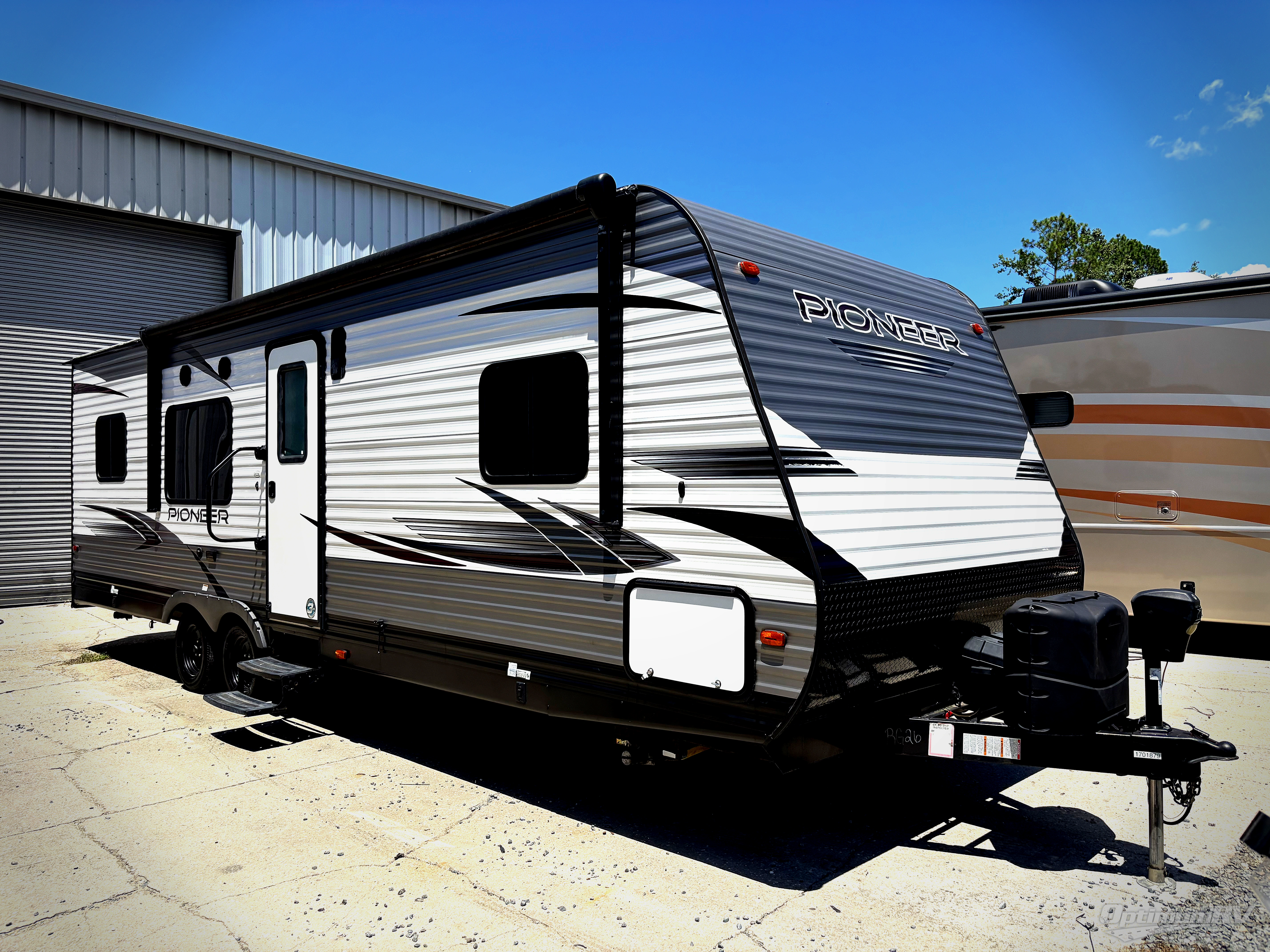 Blaze new trails and be the first to explore new and exciting destinations with a Heartland Pioneer! You will be able to focus on the fun ahead since Heartland has taken care of all of your needs with the features and amenities that they have included in each Pioneer. From the 13,500 BTU air conditioner that will keep you cool all summer long to the in-floor ducted heat that will eliminate the need for piles of blankets at night, the Pioneer will always be a retreat from outside elements. You will also find security and peace as you travel with the Pioneer because it comes with plenty of standard safety equipment, like the propane, smoke, and carbon monoxide alarms, as well as the dead-bolt lock on the entrance door.
