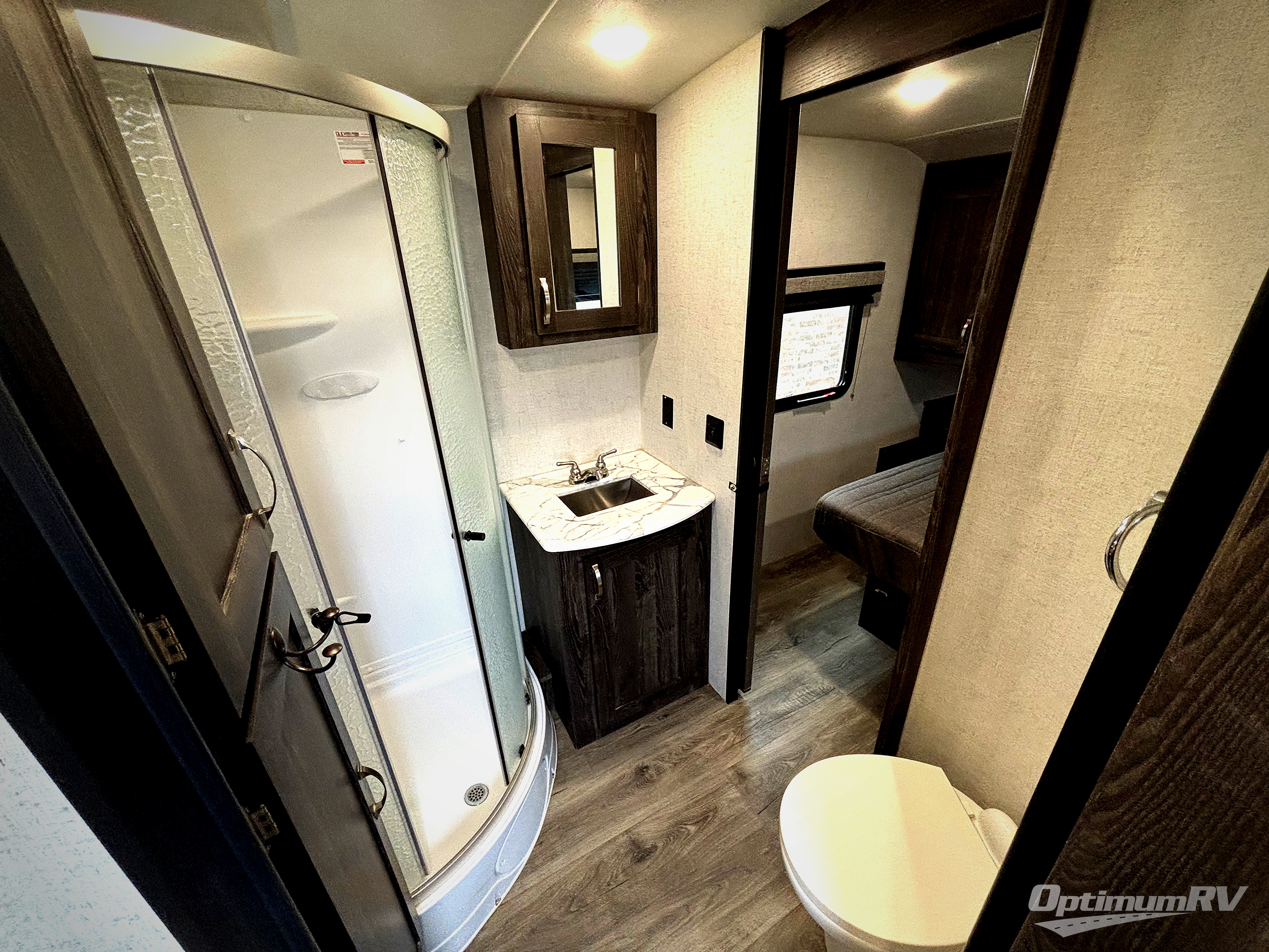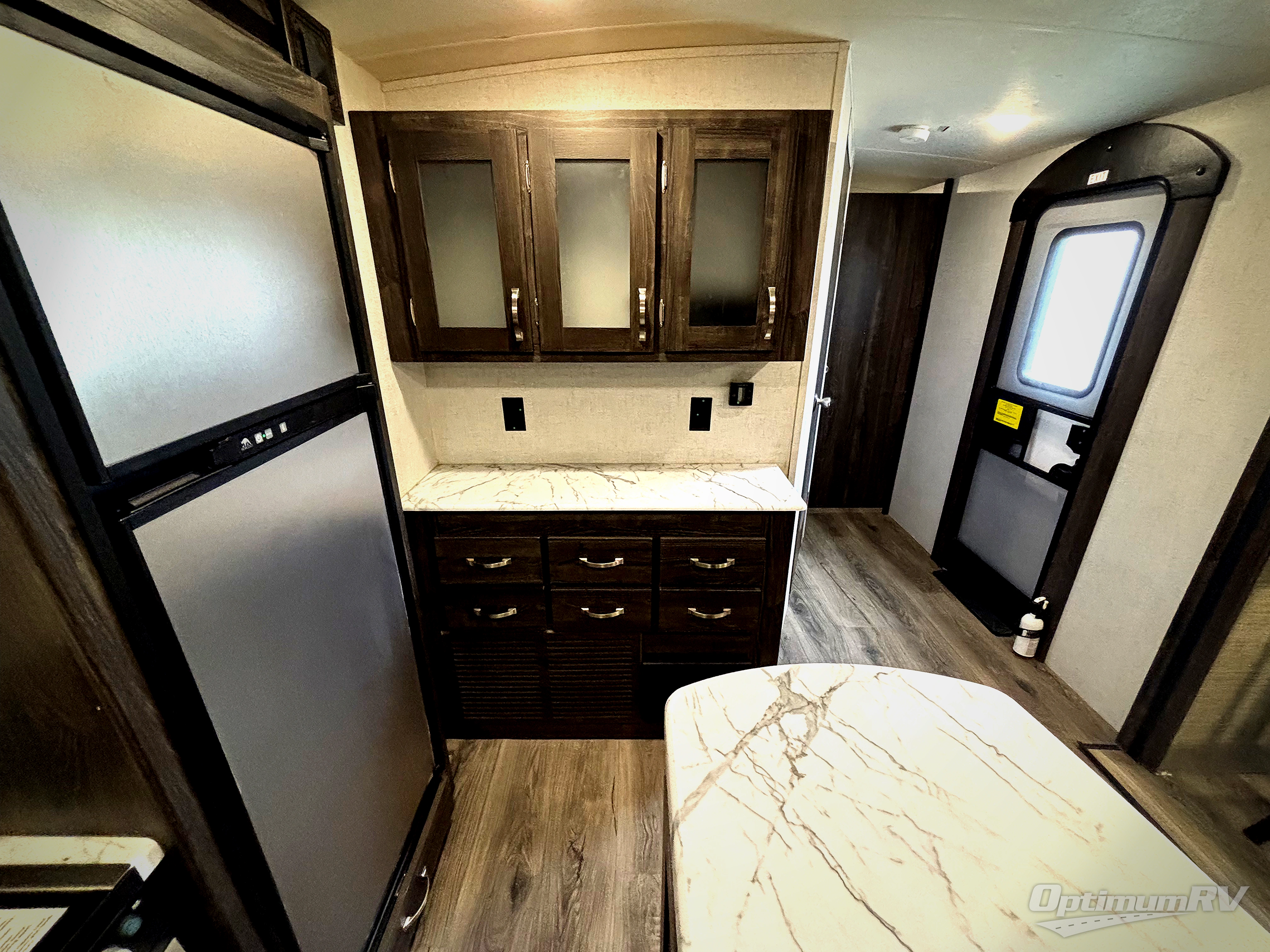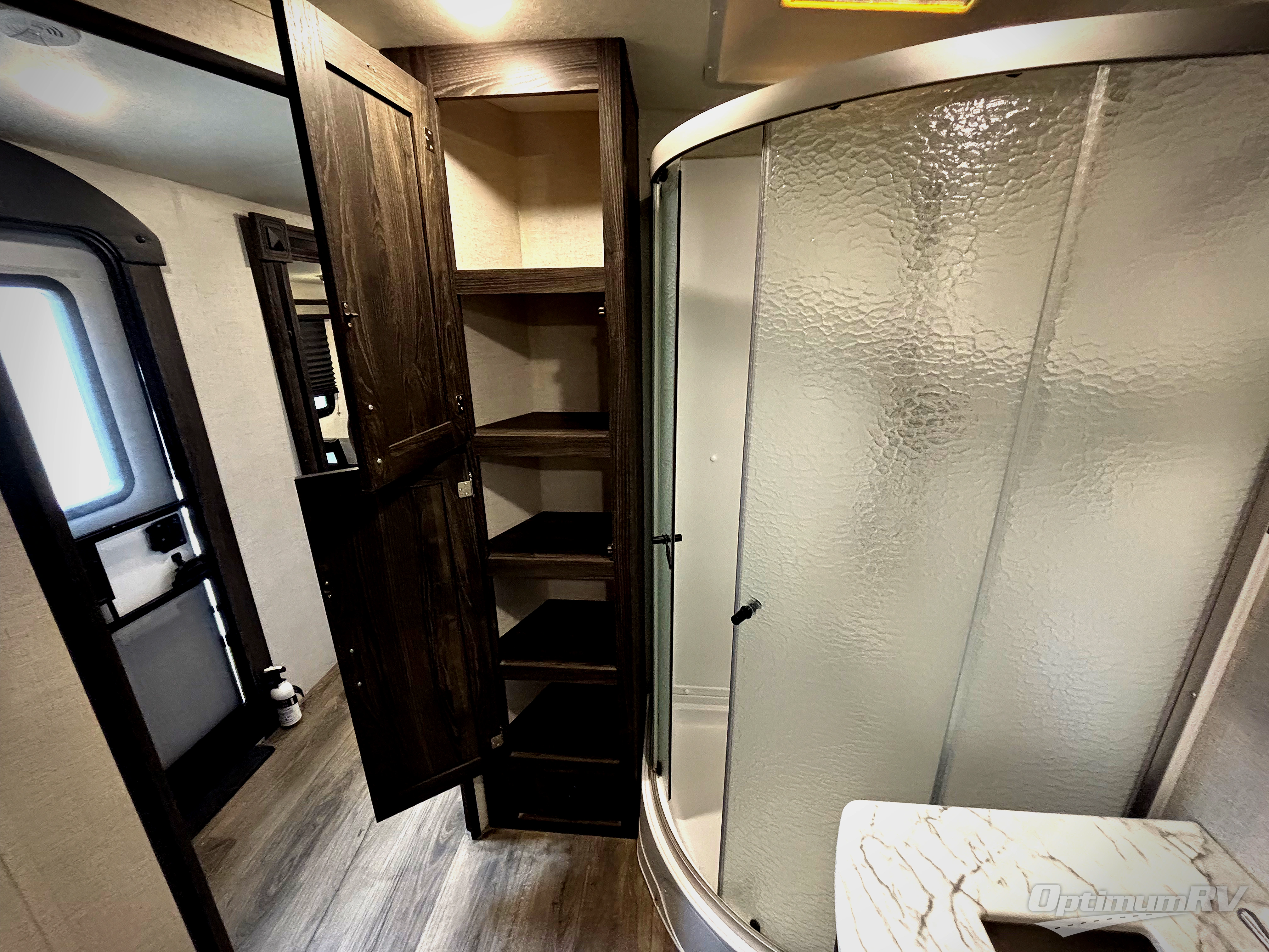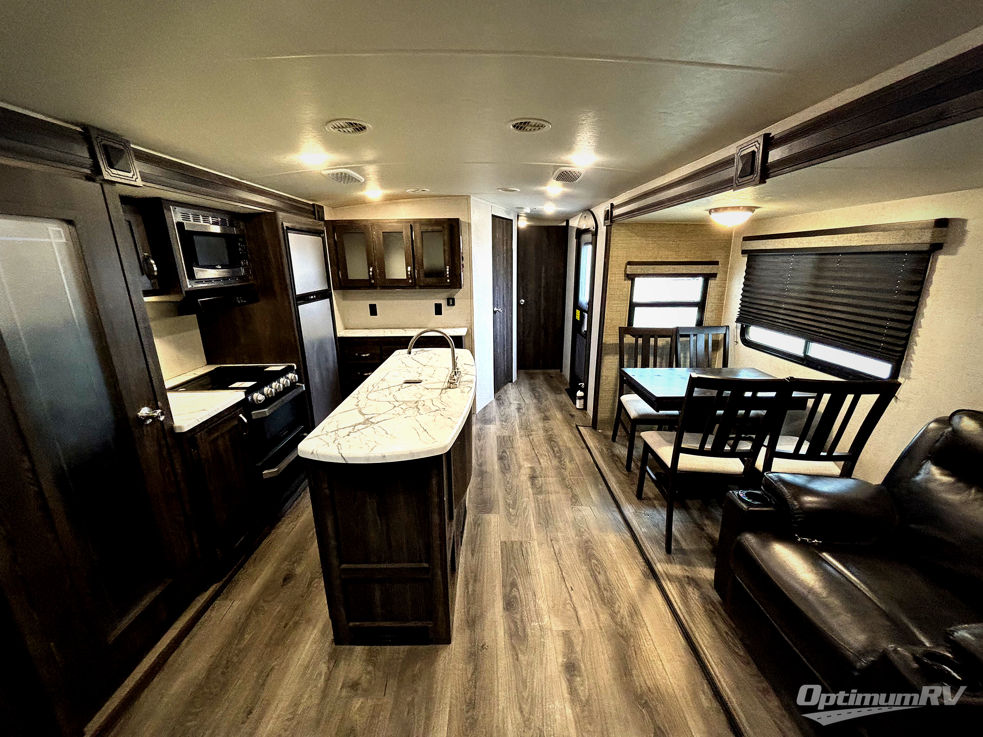 Have you been thinking about purchasing an RV for you and your favorite person with extra sleeping accommodations for family and friends? Well you might have found it! You will have your own walk-around queen bed with pet kennel underneath and dual shirt closets as well as easy access to the double entry bathroom. You can offer the family the tri-fold sofa and booth dinette as well as someone might sleep in a theater seat after everyone is finished hanging out in the main living area and kitchen. The next morning the cook can make breakfast using the stainless steel appliances and kitchen island as well as the hutch. And some campers might decide to grab a camp chair from the pass-through storage with motion light to sit under one of the two power awnings outside.