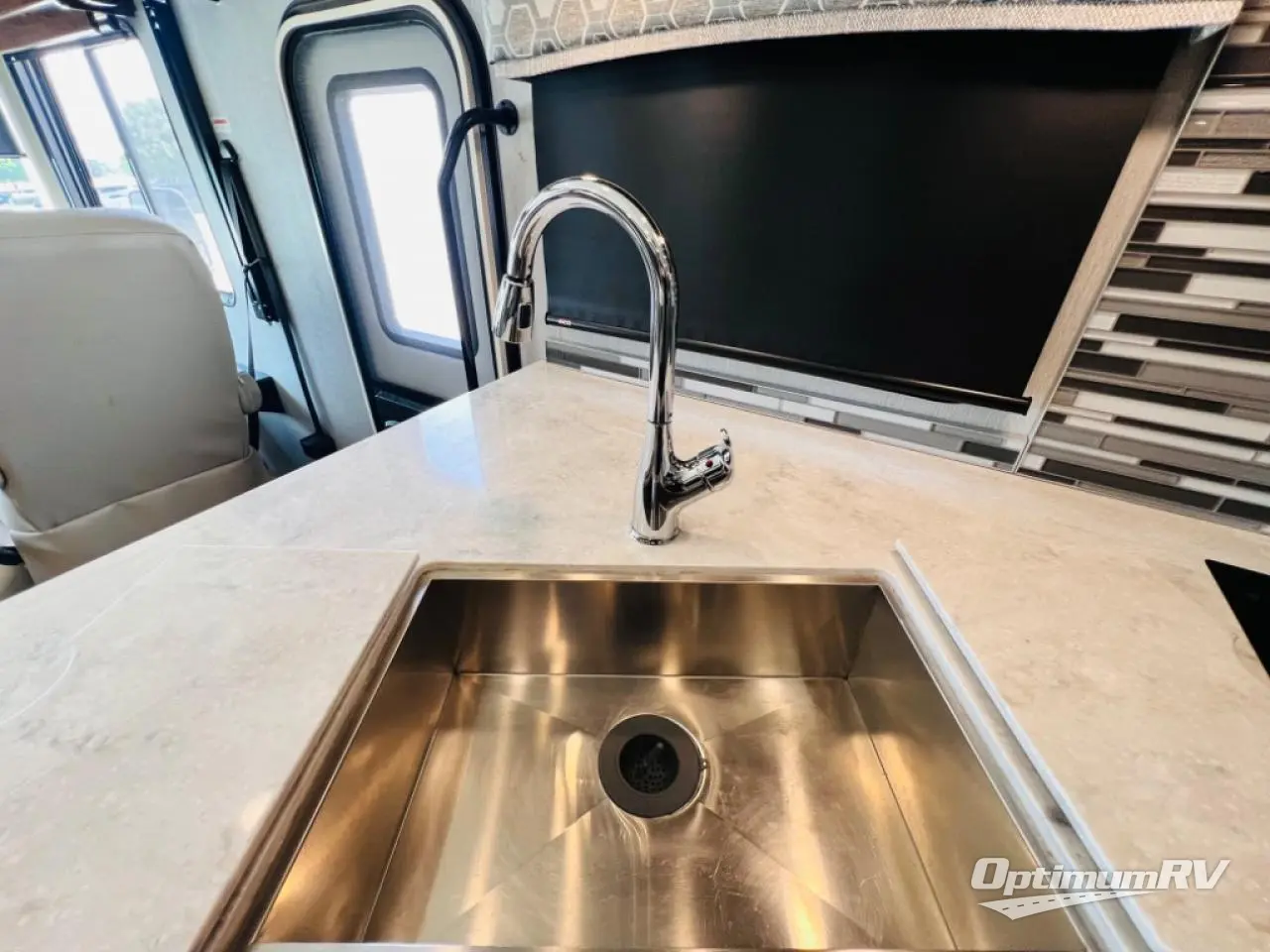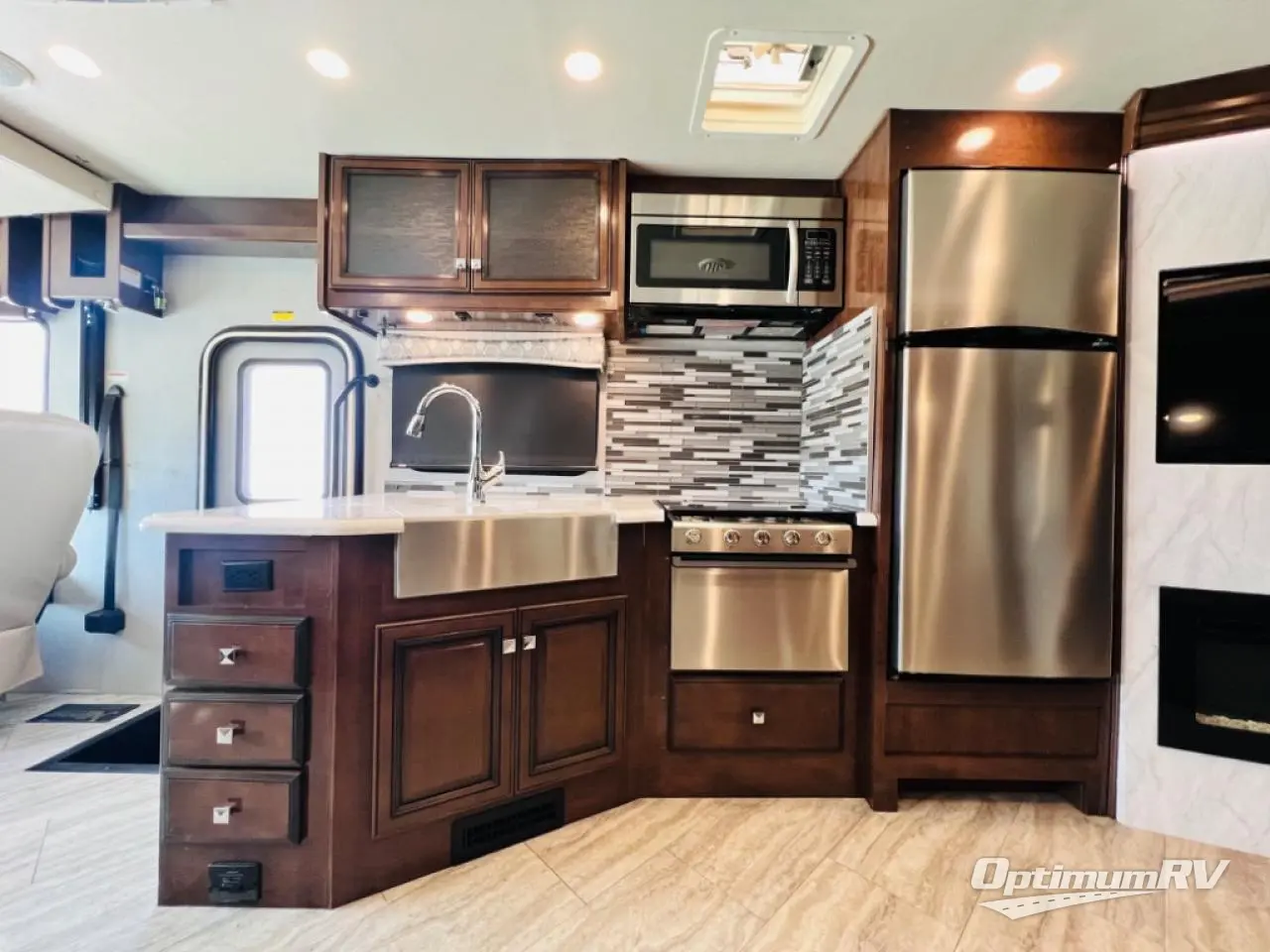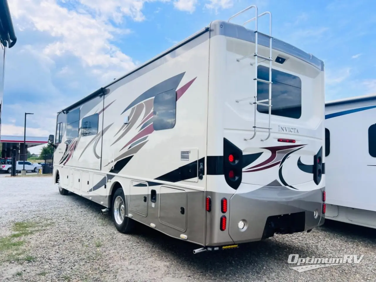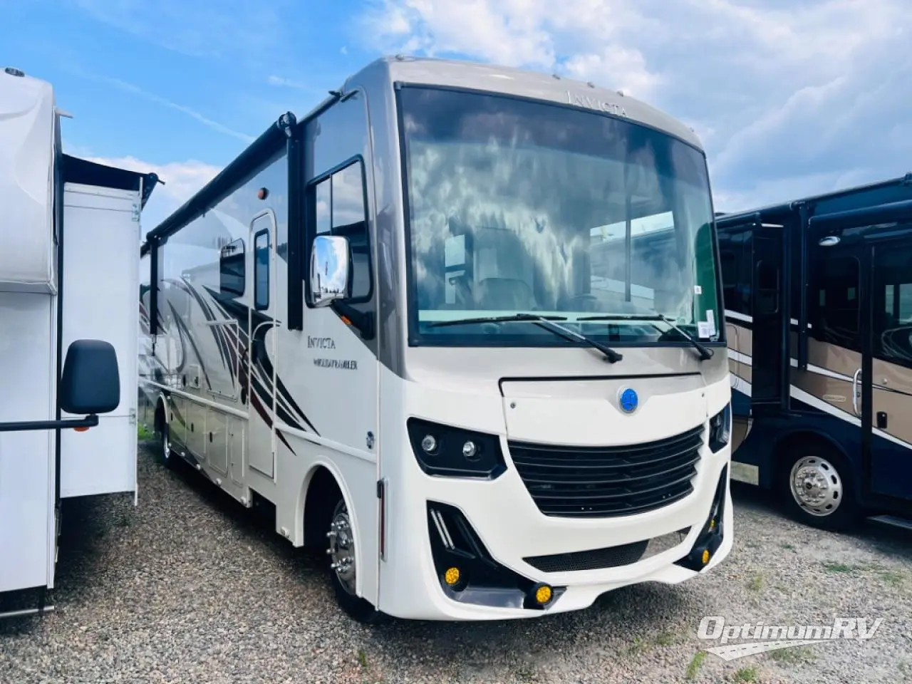This Invicta Class A gas motorhome gives you luxury and convenience throughout its many modern features! As you spend your days preparing meals in the kitchen, you will certainly come to appreciate the extra space in the residential refrigerator, the quick cooking of the convection microwave, the easy dish washing in the farmhouse sink with residential pullout sprayer, and the reliability of the three-burner cooktop. The bathroom is just as accommodating with its glass shower door and skylight above, and the rear private bedroom is a dream with its king bed slide, full-size wardrobe, and 32" LED TV.