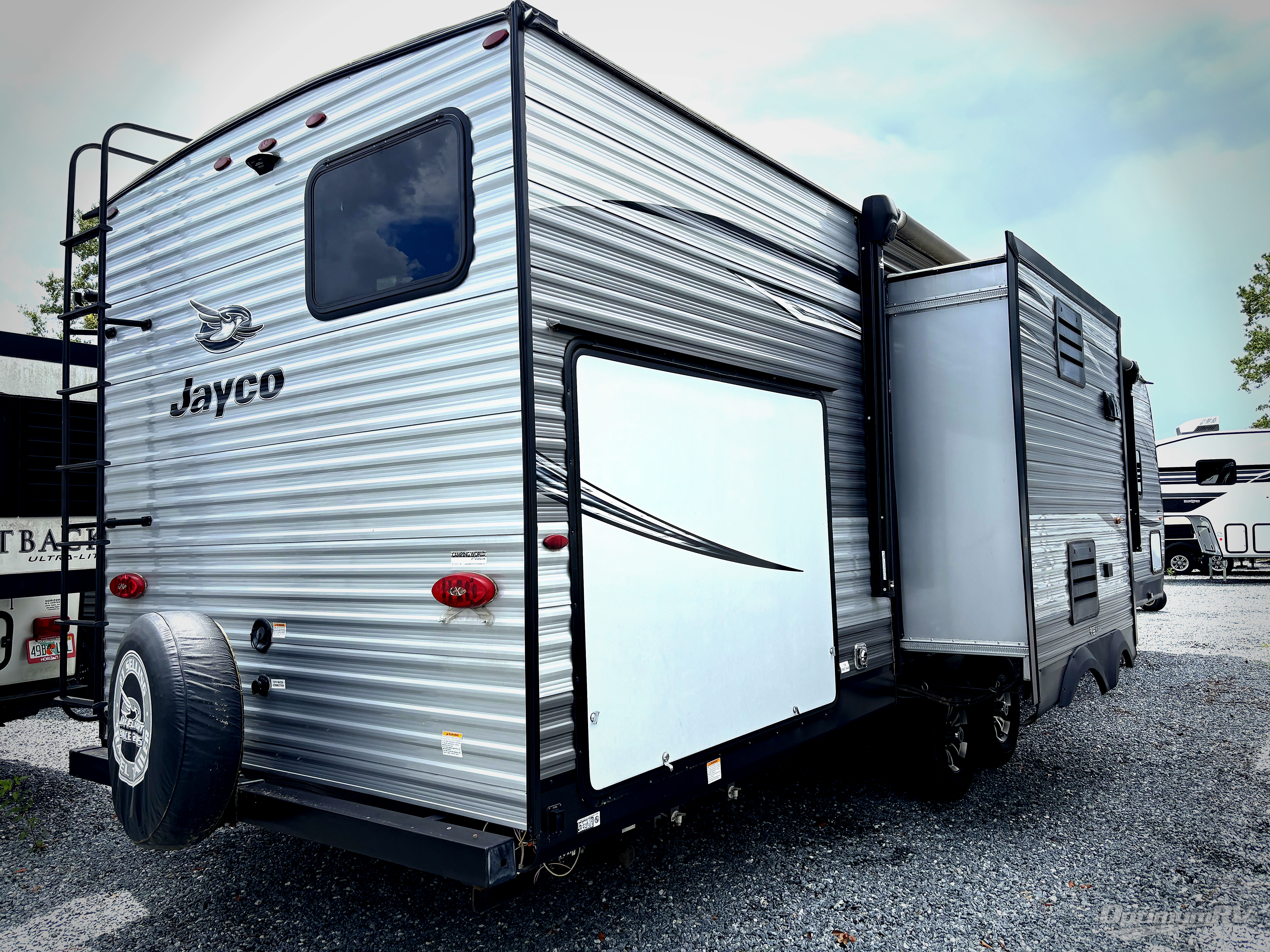 As the best-selling travel trailer in America, the Jayco Jay Flight travel trailer features all that you need for reliable, comfortable, and accommodating adventures! The American-made Goodyear tires, Dexter axles with Nev-R-Adjust brakes, and E-Z Lube hubs are what make it a dream to tow the Jay Flight, and the fully integrated A-frame and Magnum Truss roof system create a foundation that will last for years to come. Make your time spent at the campground an enjoyable one by using the power awning with LED lights and speakers as you sit around in some lawn chairs and share ghost stories by the campfire. Plus, if your hands get sticky from the roasted marshmallows, you can use the outside shower to rinse them off.