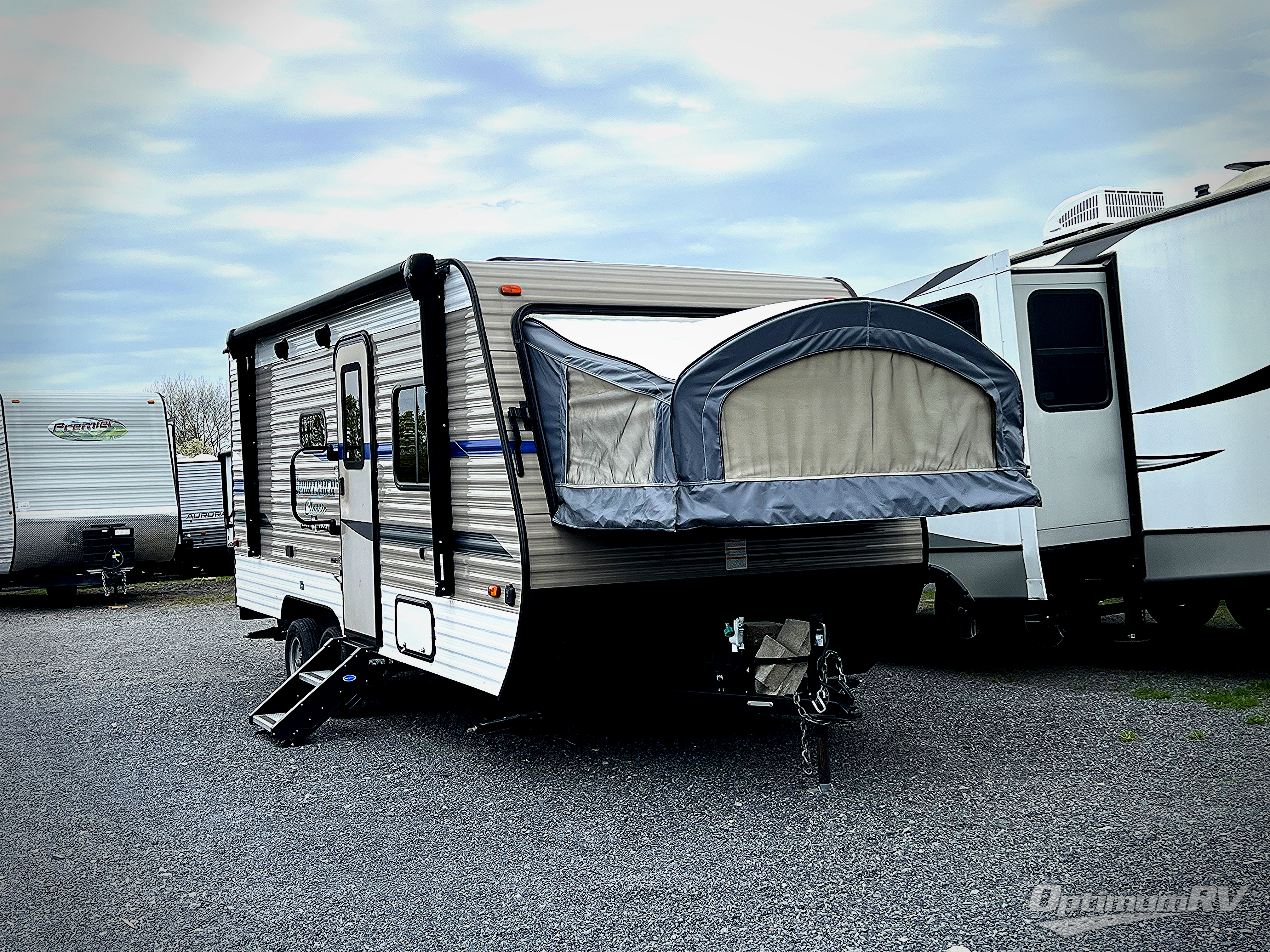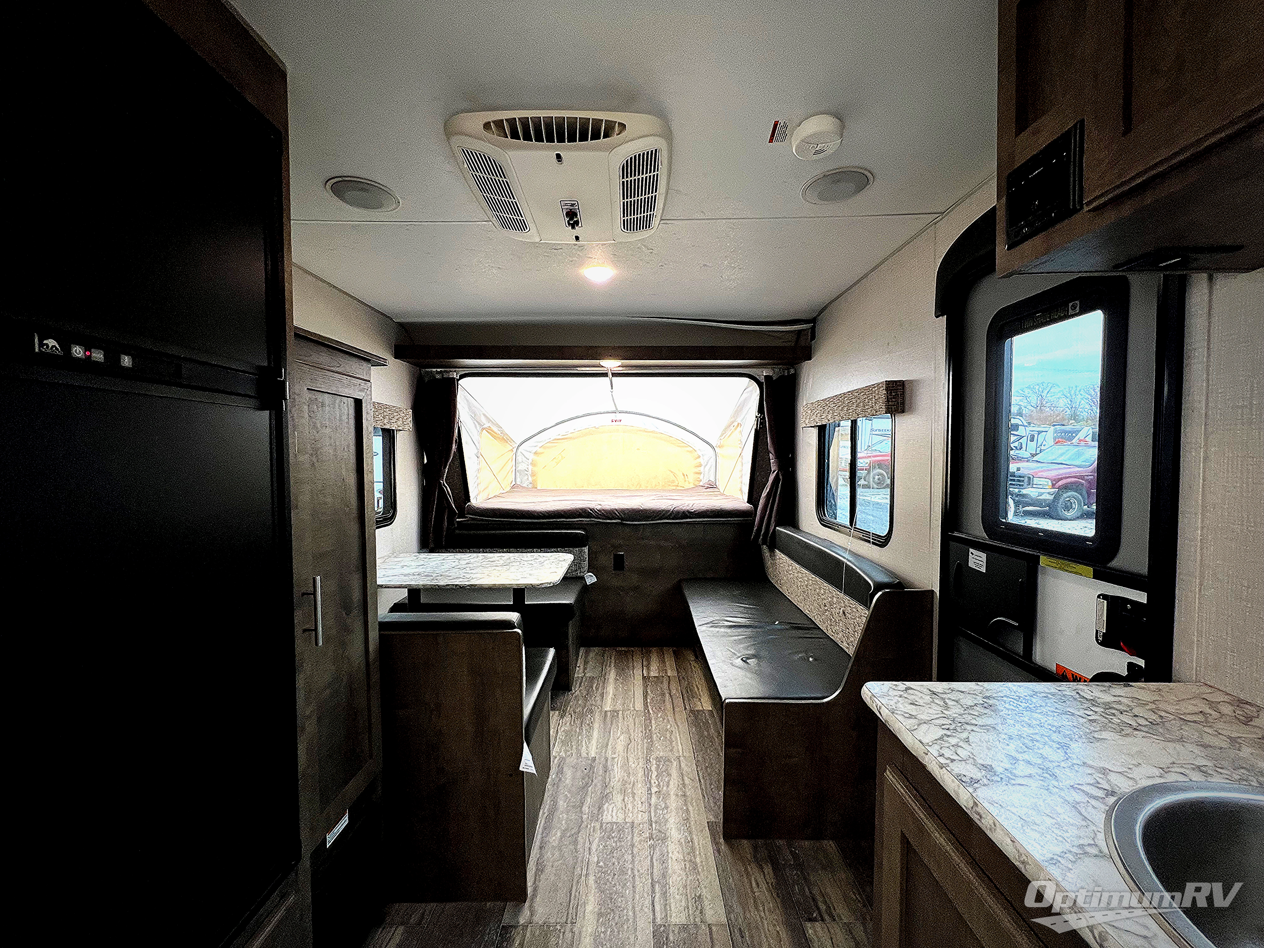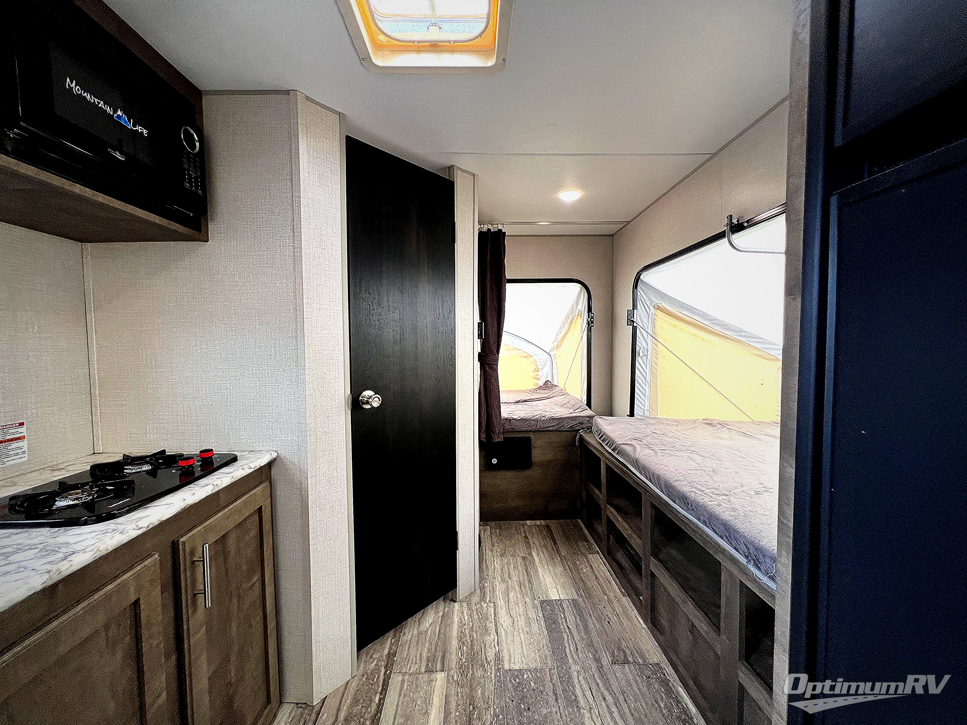 Load up your larger family in this Sportsmen Classic expandable for a fun weekend in the great outdoors with indoor comforts such as three full-size tent end beds, a booth dinette, and a bench seat. You will also find more floor space to move from the beds to the full bathroom and to the entry/exit door so that you can head back outside to hike and relax under the 13' power awning. You can make warm meals inside with the kitchen appliances which include a two-burner range and 7 cu. ft. refrigerator. And the stainless steel round kitchen sink allows you to keep everything clean for the next meal.