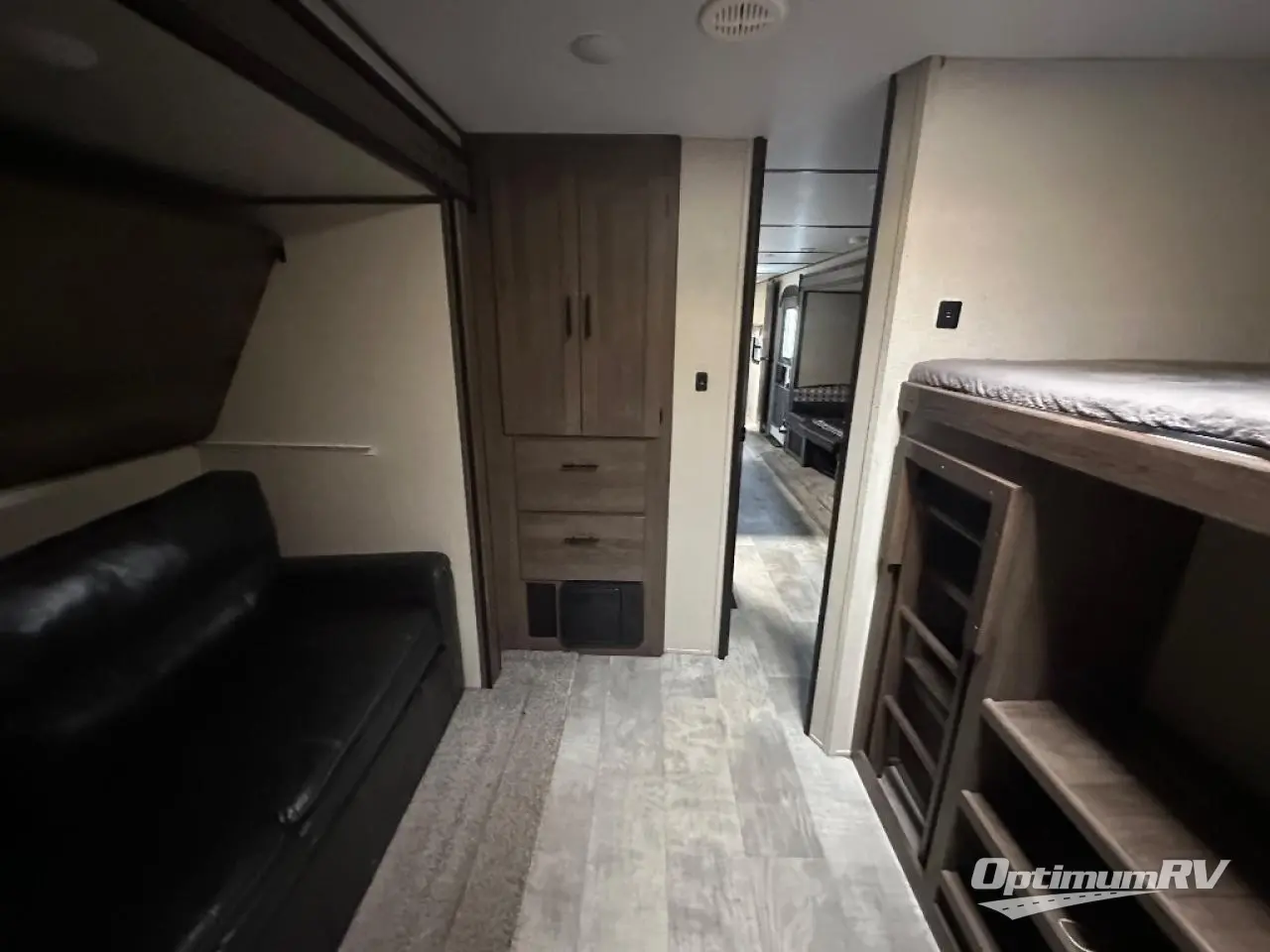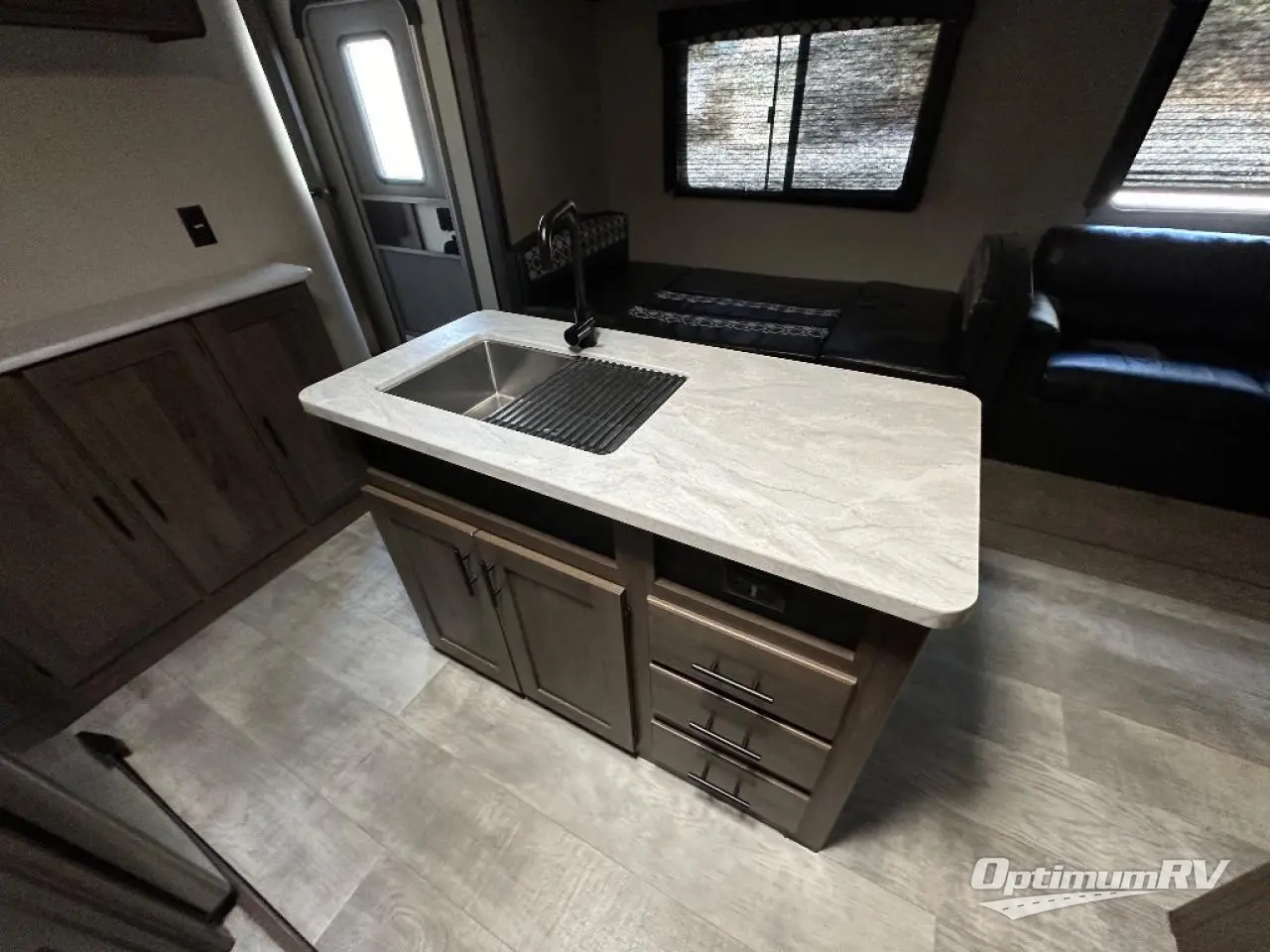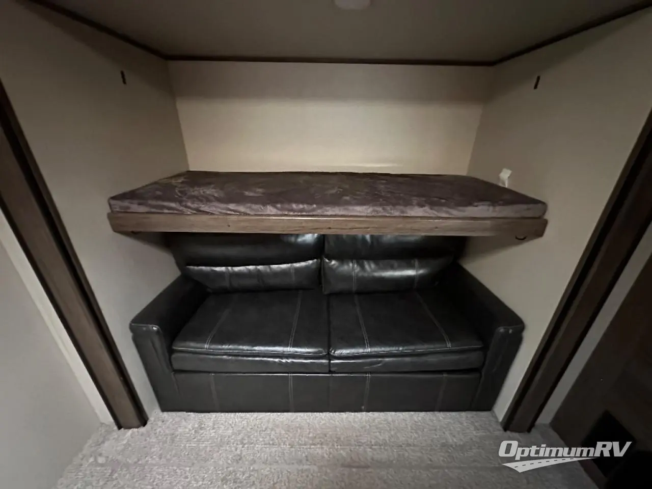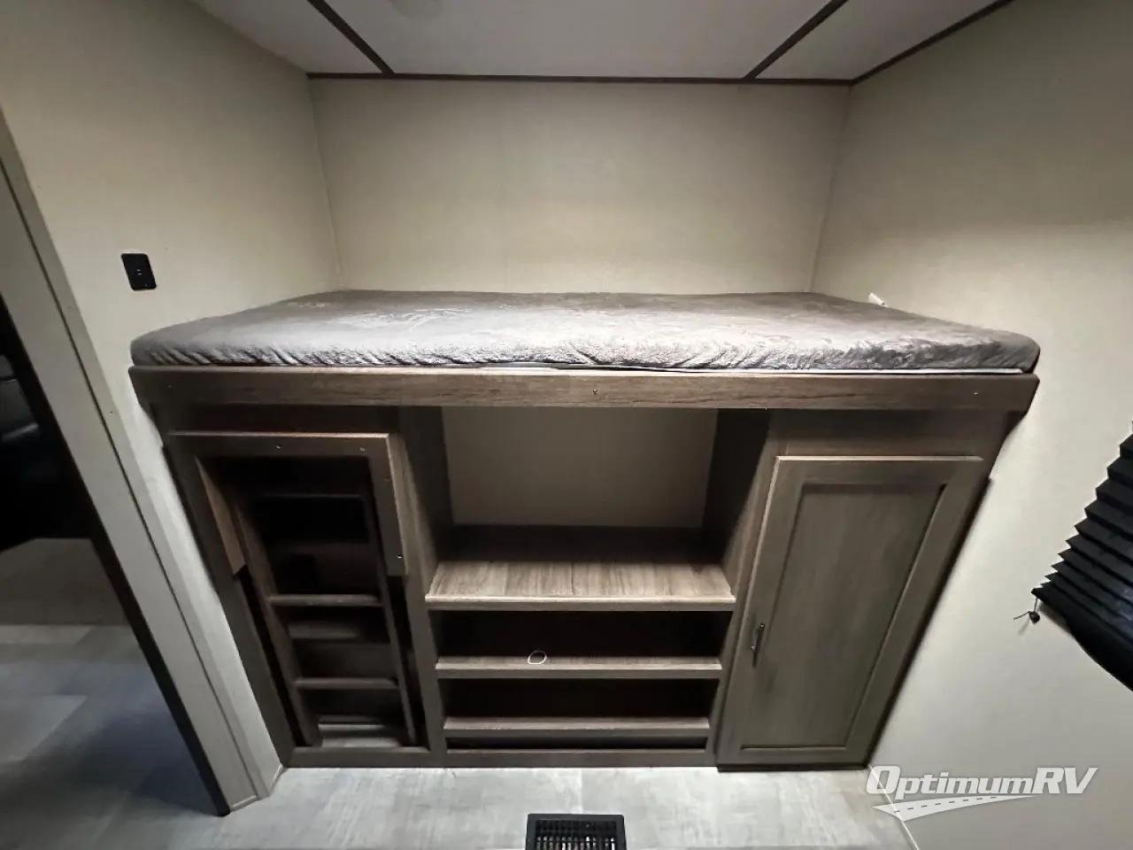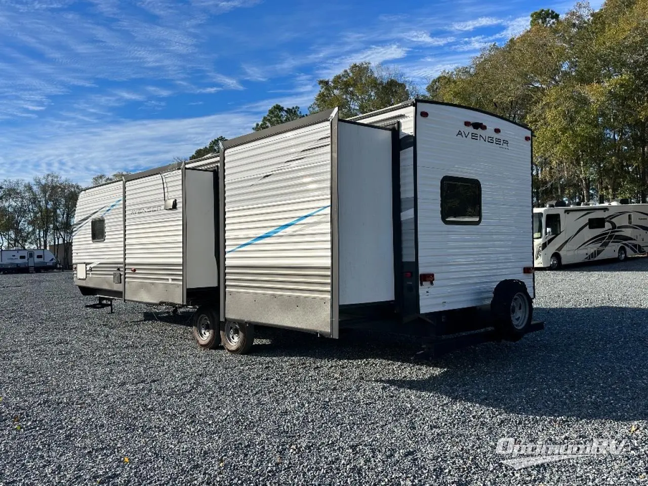 Are you looking for an RV with a private bedroom for yourself and a private bunkhouse for the kids? Then this Avenger travel trailer has everything you've been looking for, plus more! This unit features a jackknife sofa and a large 87" U-shaped dinette so that everyone can fit around it at dinner time. The family chef has the option of cooking inside and serving food on the kitchen island or on the hutch/buffet, or they can take the meal prep outside and use the outdoor kitchen. Camping with family shouldn't feel cramped which is why this trailer has three slides, giving everyone space to move around. This unit also features multiple storage areas, plus a third wardrobe closet in the front bedroom for all your clothes and valuables.