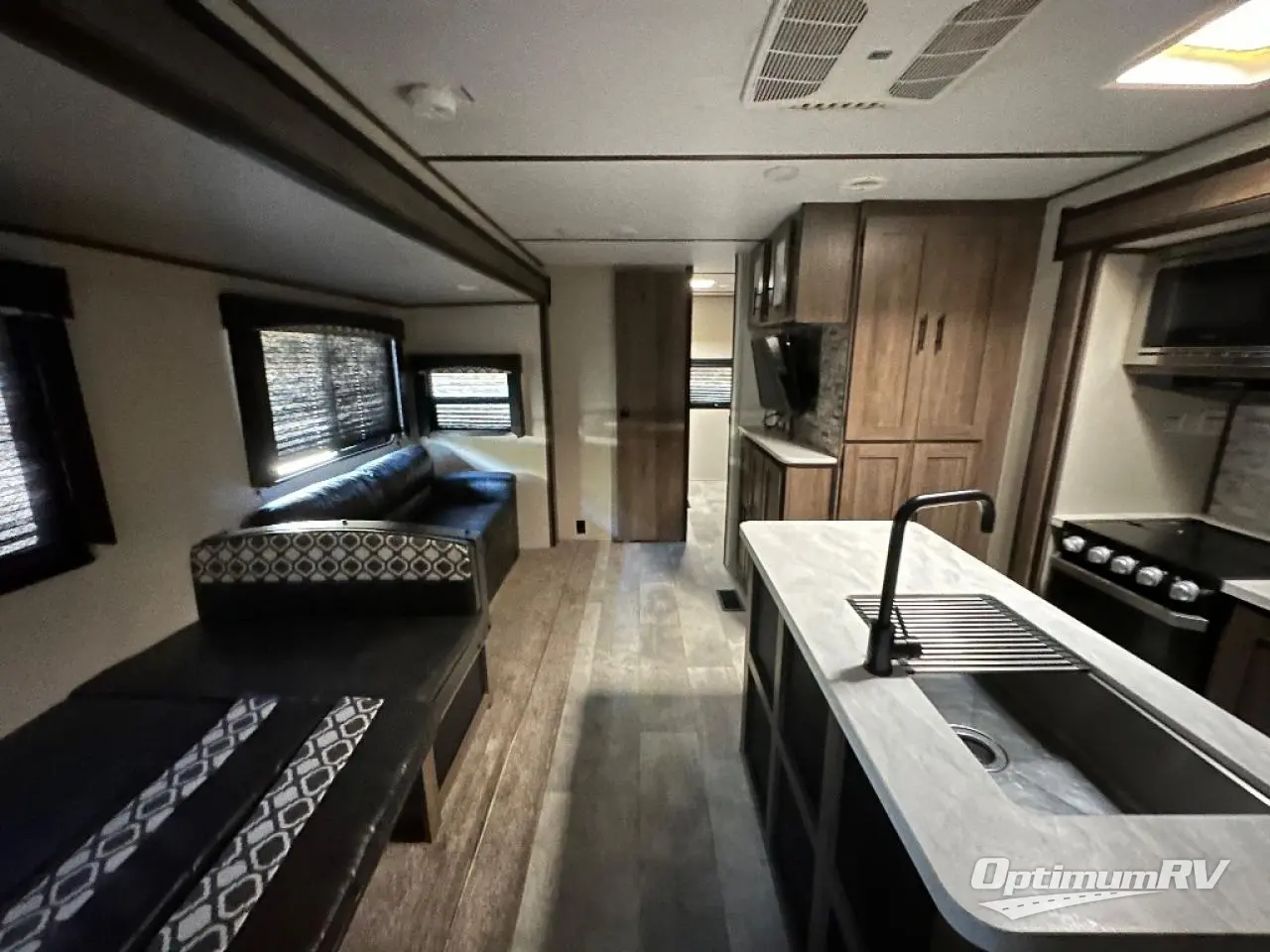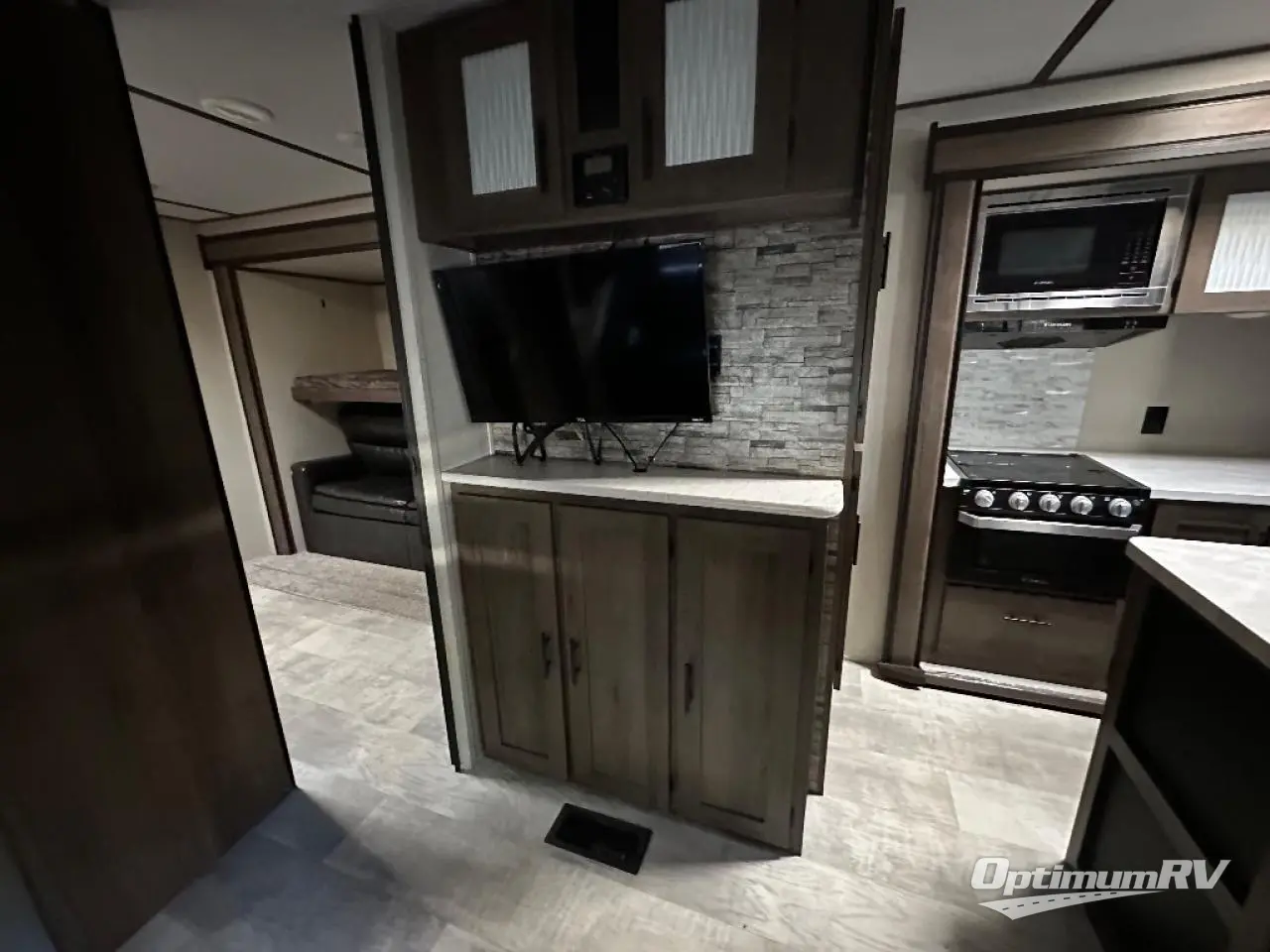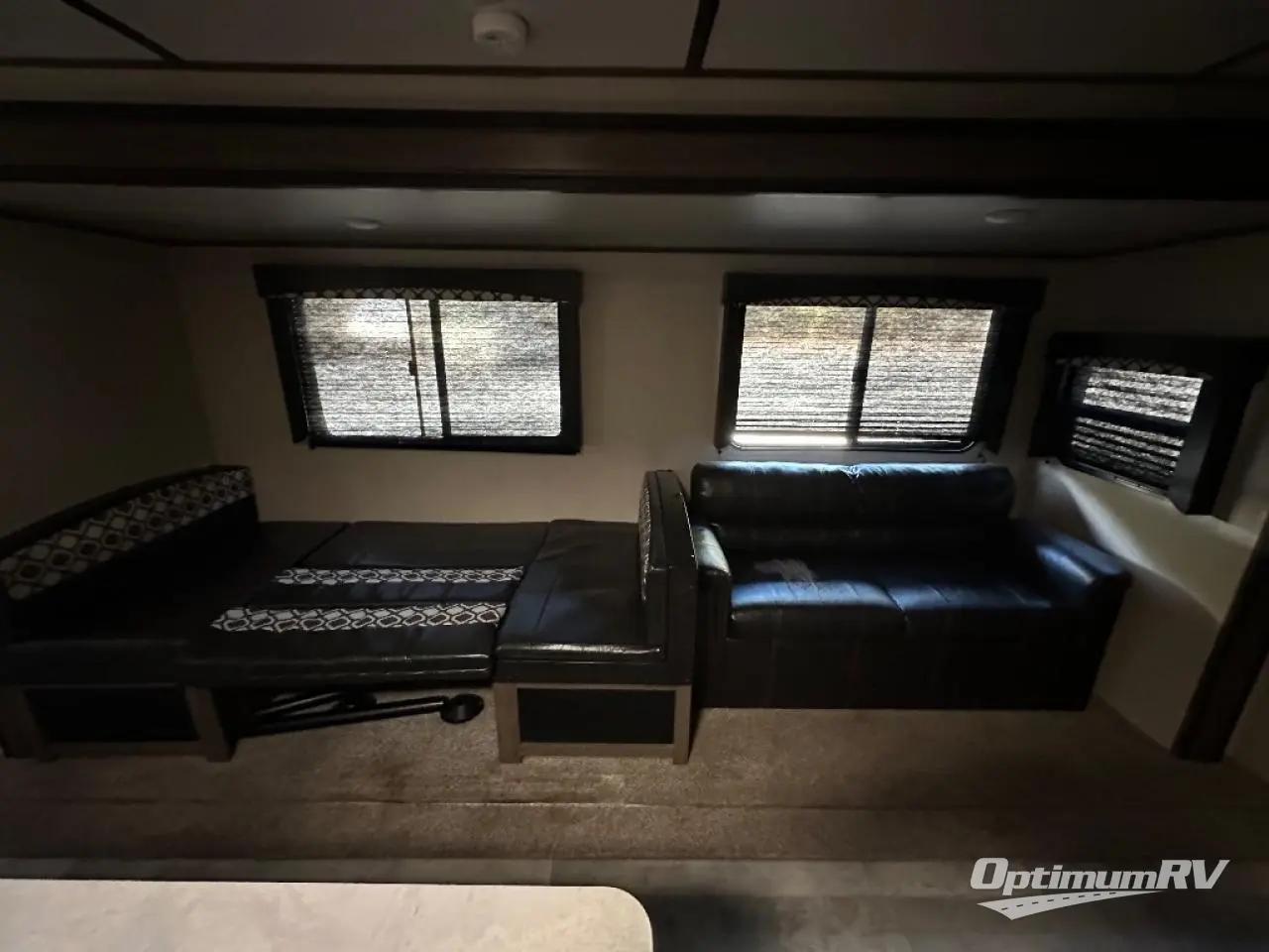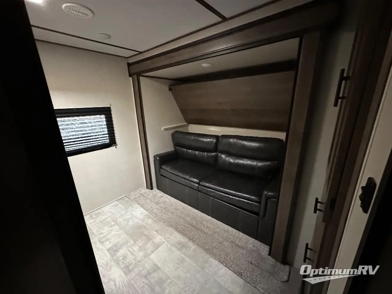Are you looking for an RV with a private bedroom for yourself and a private bunkhouse for the kids? Then this Avenger travel trailer has everything you've been looking for, plus more! This unit features a jackknife sofa and a large 87" U-shaped dinette so that everyone can fit around it at dinner time. The family chef has the option of cooking inside and serving food on the kitchen island or on the hutch/buffet, or they can take the meal prep outside and use the outdoor kitchen. Camping with family shouldn't feel cramped which is why this trailer has three slides, giving everyone space to move around. This unit also features multiple storage areas, plus a third wardrobe closet in the front bedroom for all your clothes and valuables.