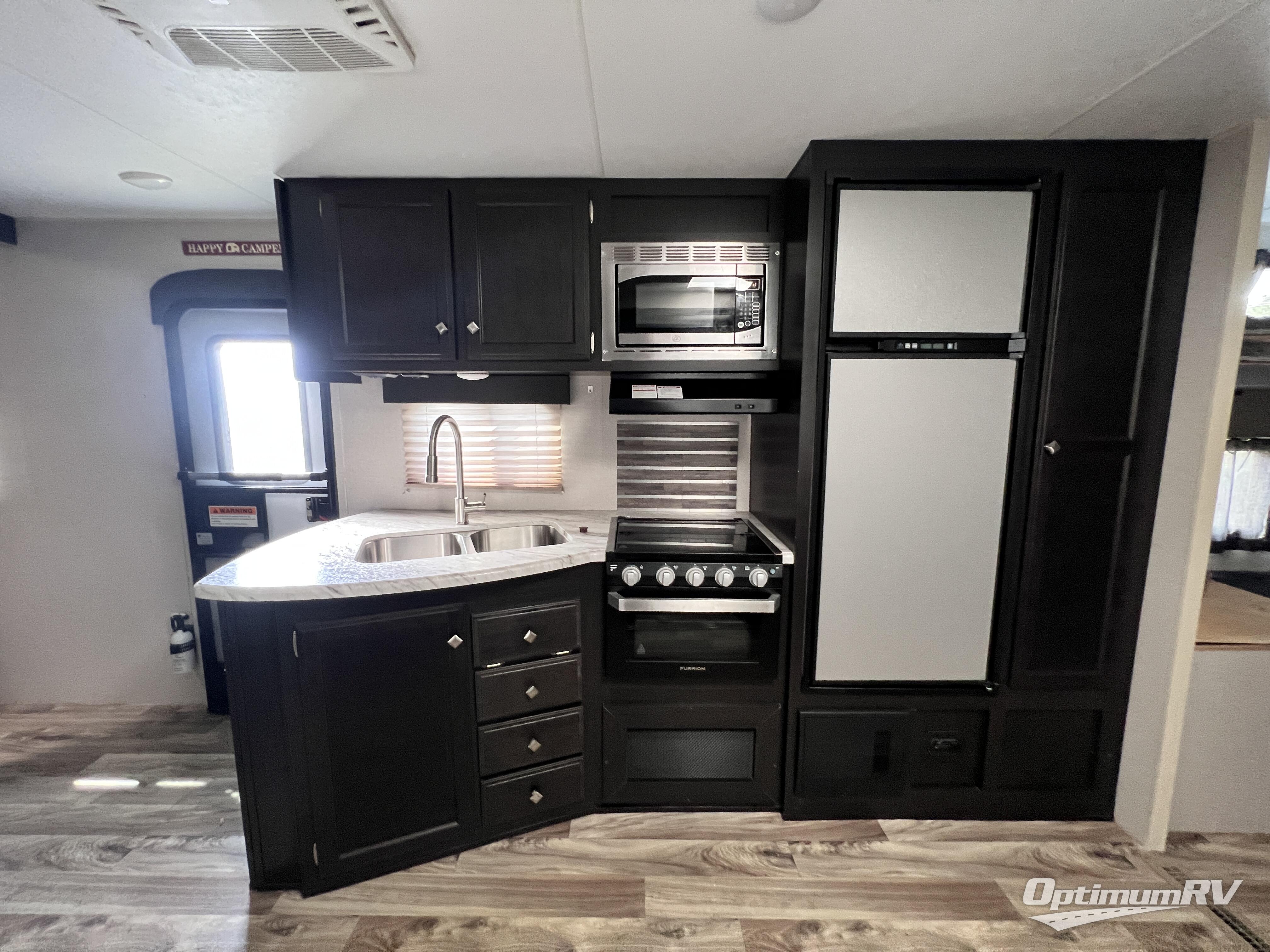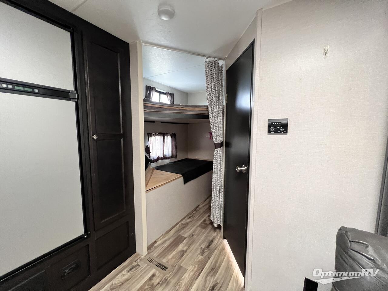 Looking for outdoor fun with comfortable inside accommodations once you are ready to relax? This SportTrek travel trailer allows you to go hiking, biking, and walking around the campground after setting up in your favorite campsite. You can grab your outdoor gear from the pass-through compartment, make a snack at the outside campfire cafe, and rest under the awning. When you are ready for inside comforts, take a seat on the Comfort by Design grand dinette or grab a snack from the refrigerator. The private front bedroom has entry doors on either side of the entertainment center, and the double-size bunks offer the kids their very own space.