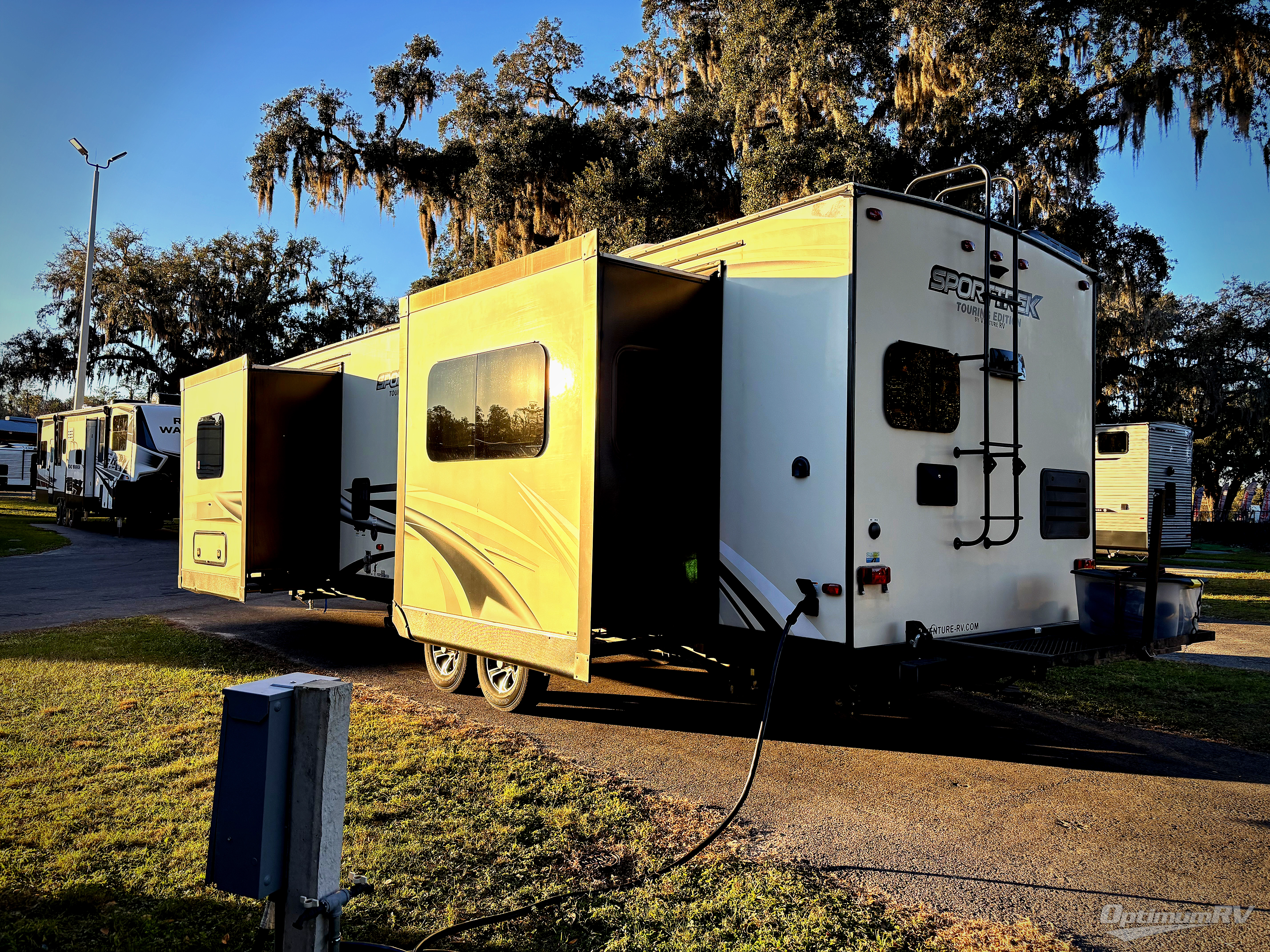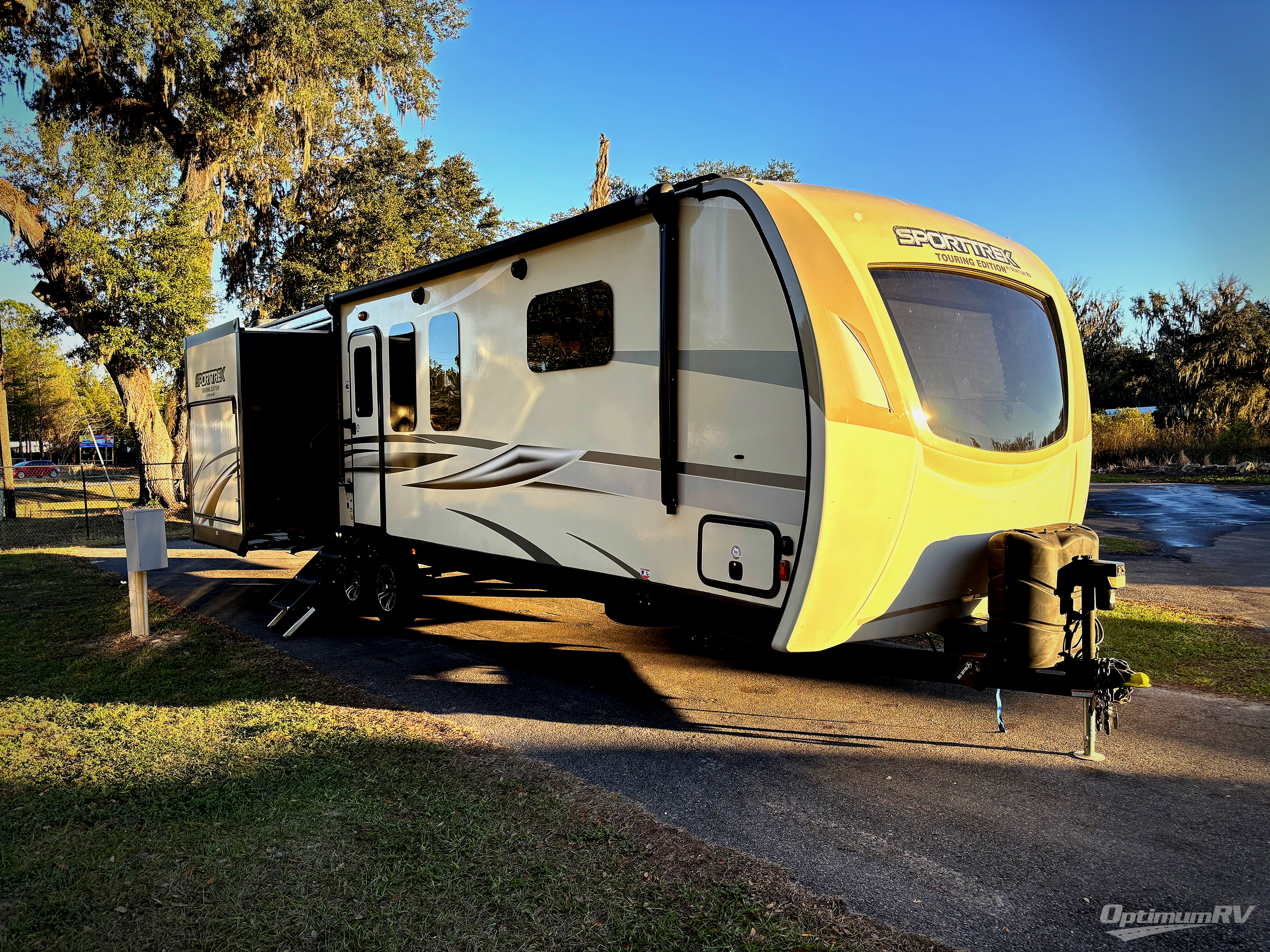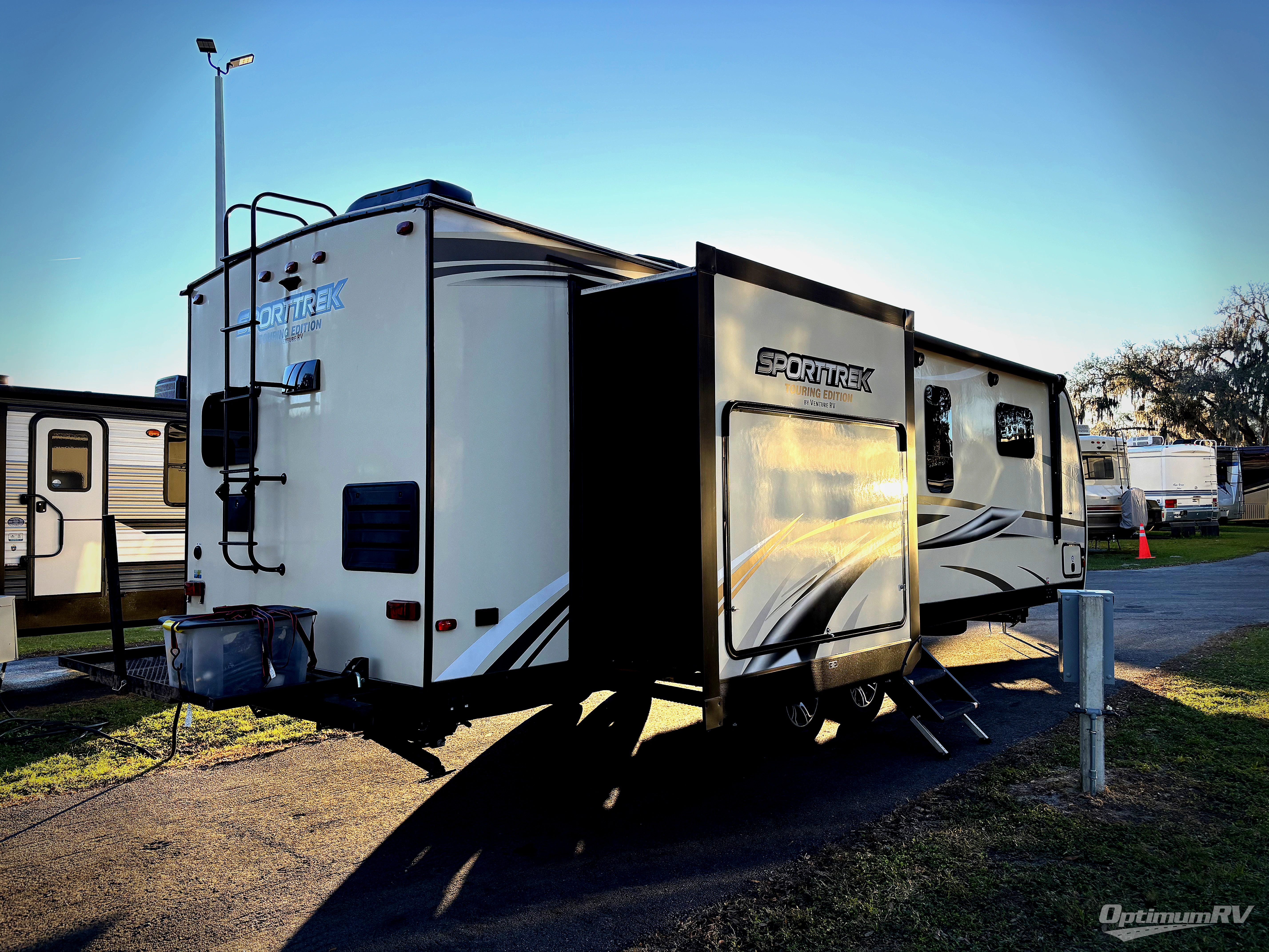 Every SportTrek Touring Edition travel trailer by Venture RV features a pearl infused exterior fiberglass for a luxurious, sleek look and a NXG Frame to provide a lightweight, but sturdy unit. The Exterior Luxury Package includes new features such as a screen shot screen door and a Venture bottle opener and doggie tie down that will come in handy for your furry friends. Each model includes a stainless steel sink and a skylight in the bath, along with solid surface countertops and a stainless steel pull down faucet in the kitchen for easy clean-up. Arriving at your destination will be made easy with the Wide-Trek Axles and self-adjusting brakes, plus you can bring along all your larger camp gear with the lighted pass through storage.