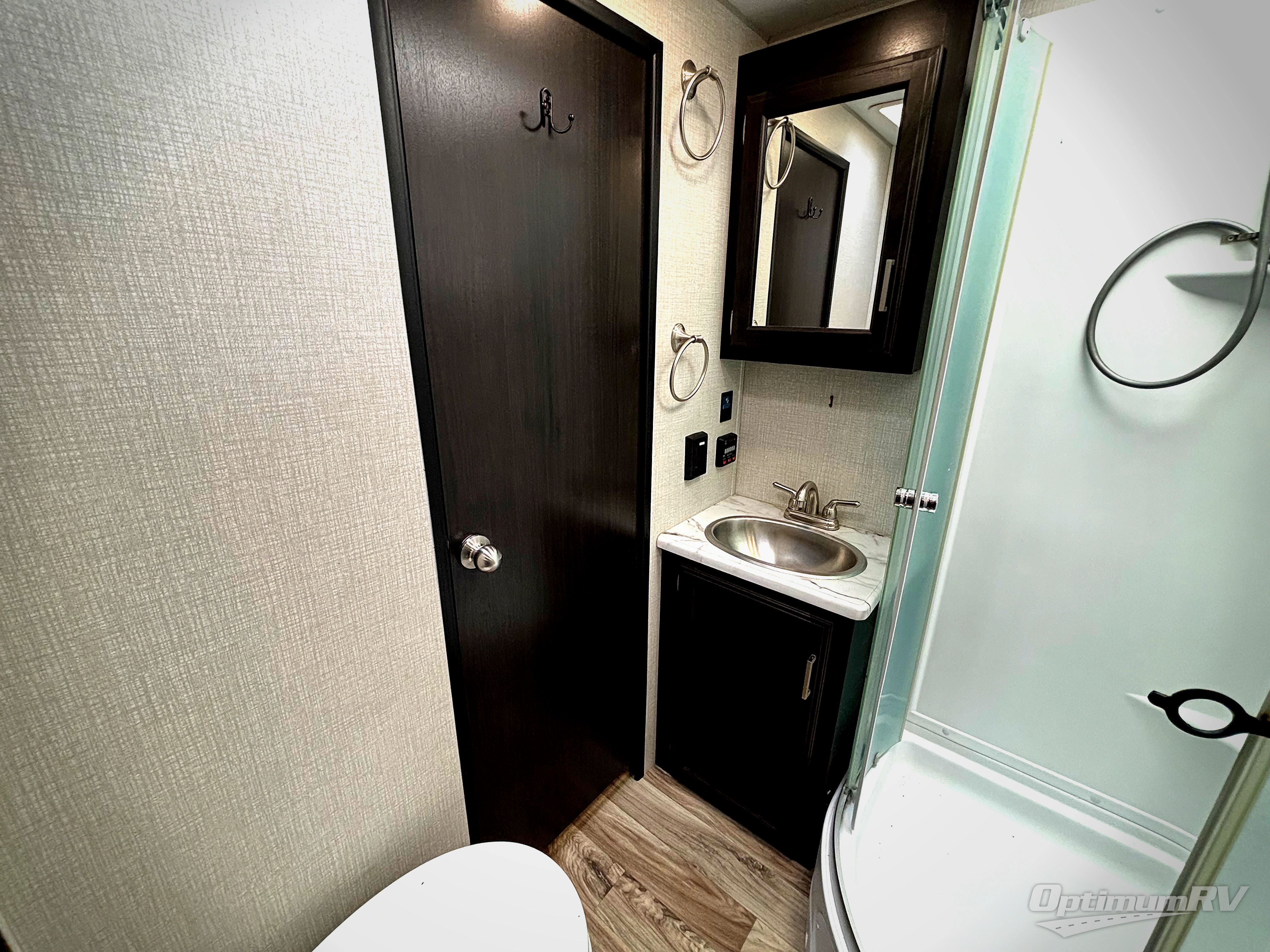 Every SportTrek Touring Edition travel trailer by Venture RV features a pearl infused exterior fiberglass for a luxurious, sleek look and a NXG Frame to provide a lightweight, but sturdy unit. The Exterior Luxury Package includes new features such as a screen shot screen door and a Venture bottle opener and doggie tie down that will come in handy for your furry friends. Each model includes a stainless steel sink and a skylight in the bath, along with solid surface countertops and a stainless steel pull down faucet in the kitchen for easy clean-up. Arriving at your destination will be made easy with the Wide-Trek Axles and self-adjusting brakes, plus you can bring along all your larger camp gear with the lighted pass through storage.