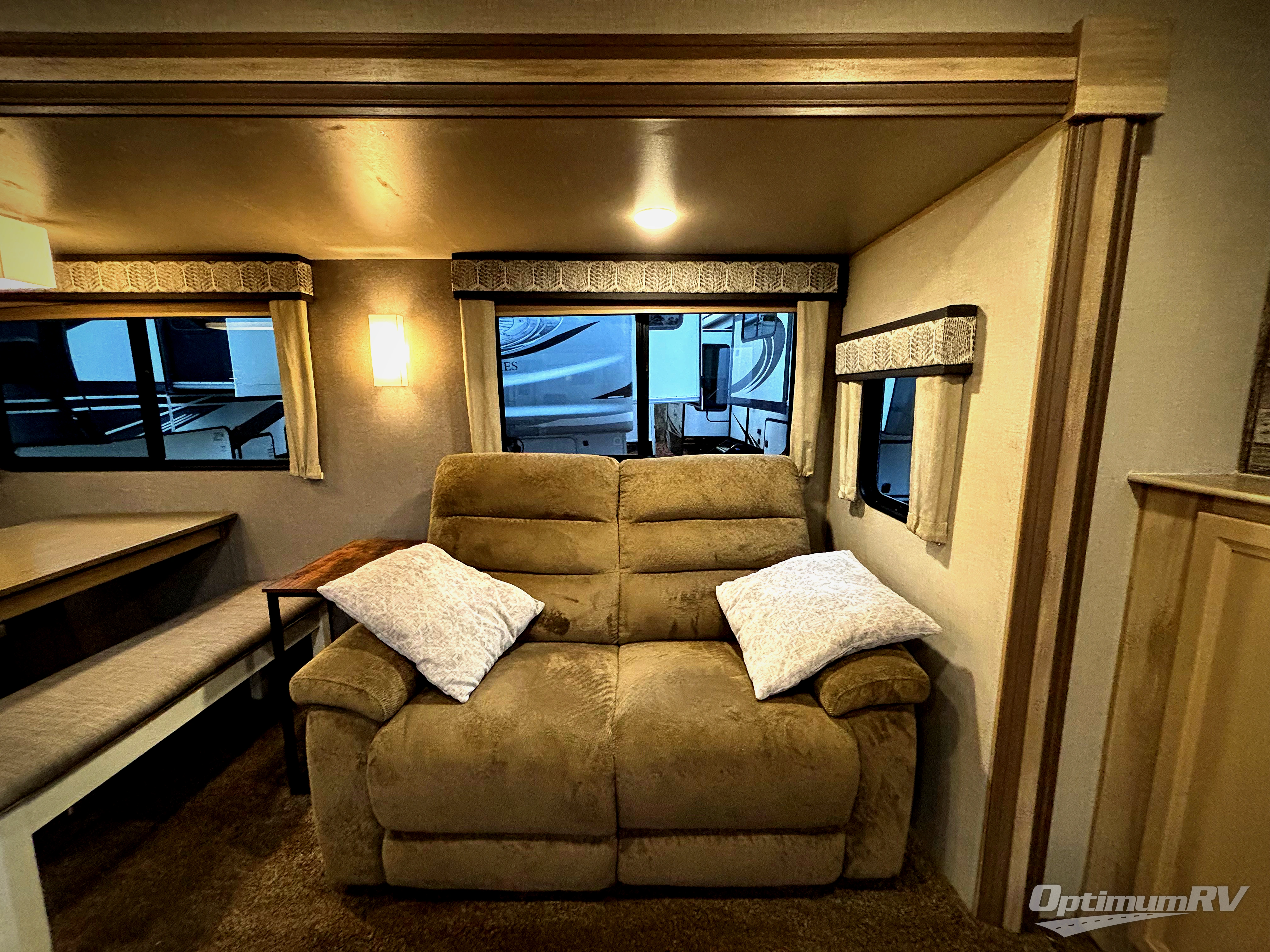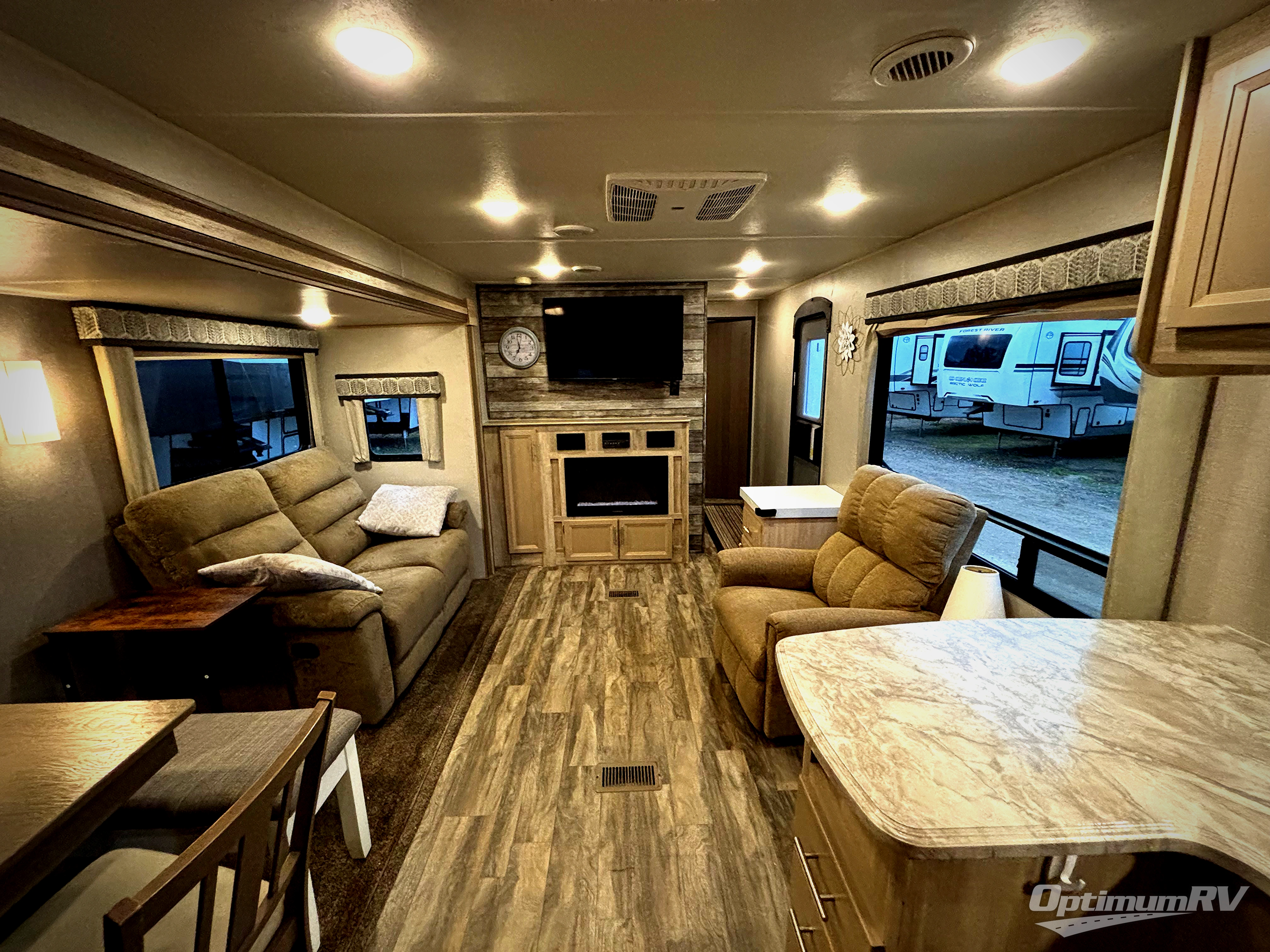 This perfect couples trailer offers dual recliners, a private front bedroom and a rear kitchen layout, yet families are always welcome! The booth dinette and sofa offer sleeping space for two or three kiddos, and the slide out makes the main living and kitchen area spacious and inviting for other RVers to visit. You can even add a washer/dryer option if you plan to stay awhile. The bedroom offers a fireplace and there is a fireplace option in the main area, now that is cozy! And the 18' electric awning offers an outdoor living area protected by the elements and includes choices of color of LED lighting for you to enjoy. There is more to love, start camping!