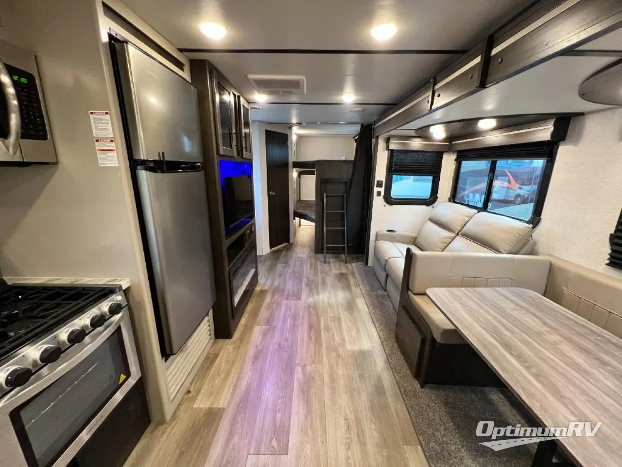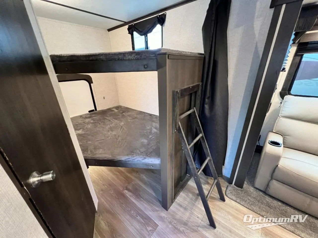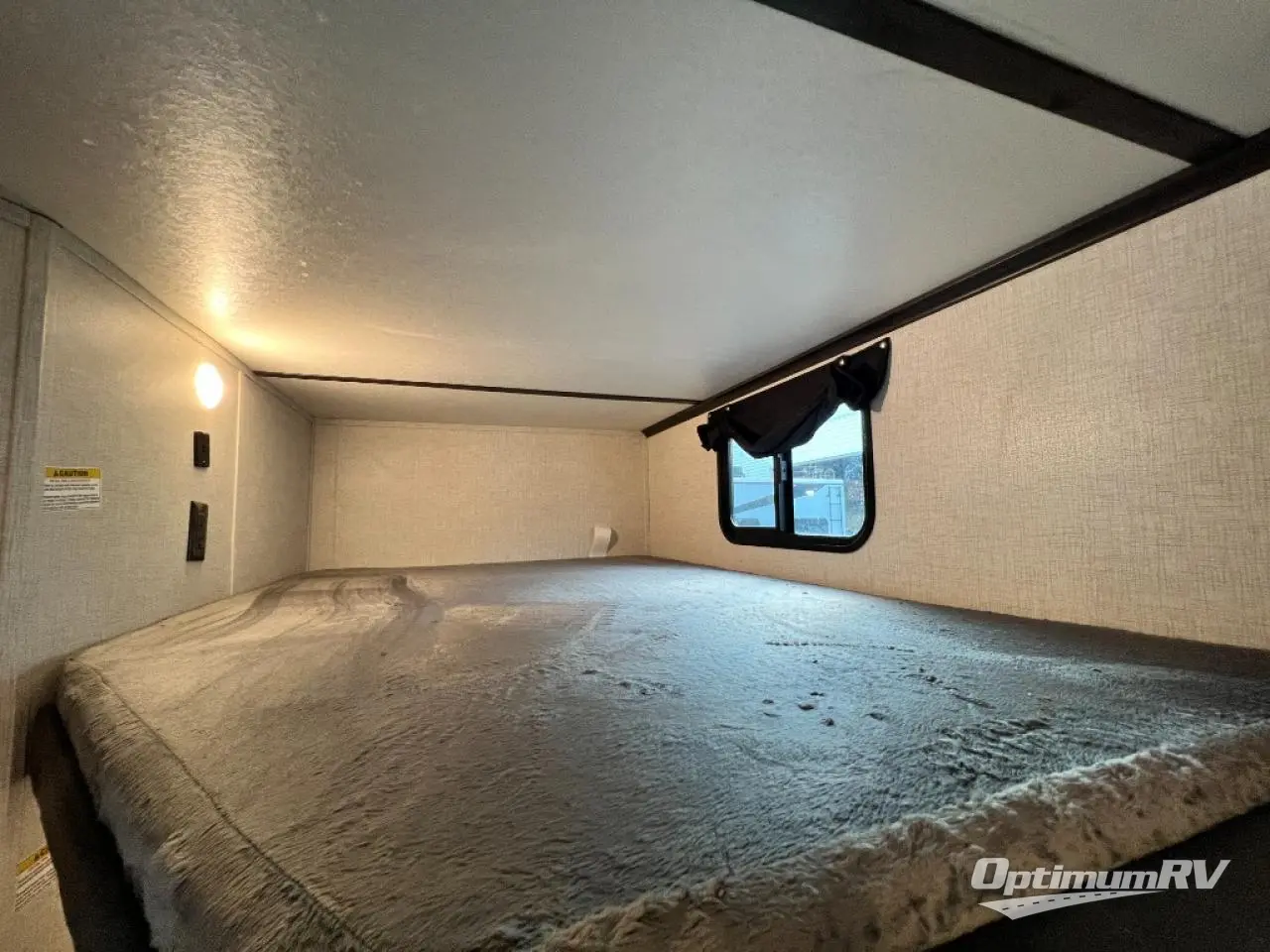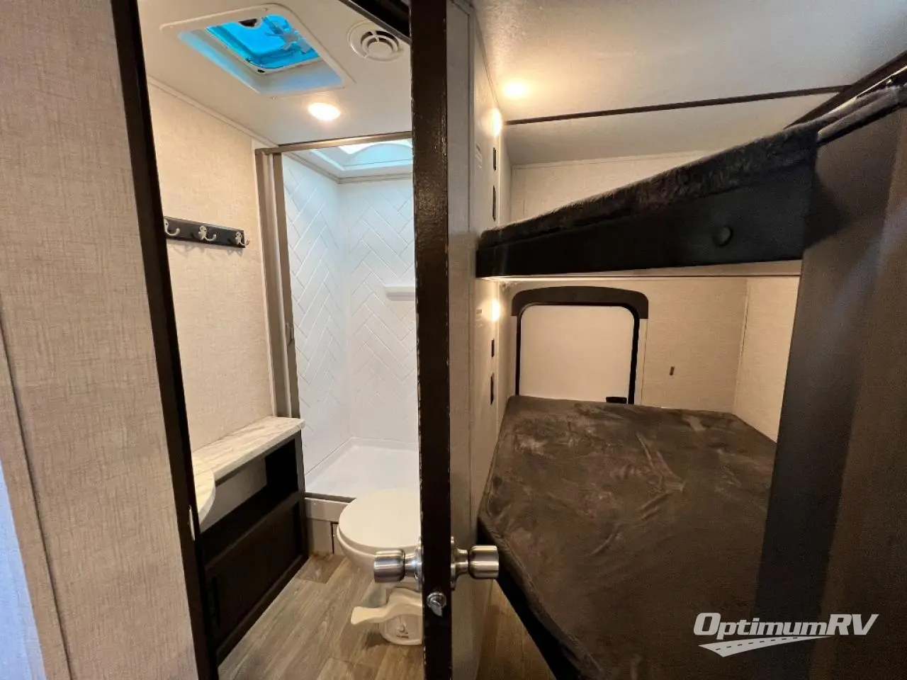 The kids or friends will be begging to go camping every other weekend in this travel trailer that includes double-size bunks. You'll appreciate the door by the bunks and the bottom hinge that will allow you to easily load luggage, coolers, or lawn chairs. Set up the power awning once you arrive at your destination, then prepare lunch on the outside kitchen. You can dine outside on the picnic table, or sit around the U-shaped dinette inside the unit. Mom and dad will love the front private bedroom that includes a king bed for all-around comfort, plus their own exterior entry door for convenience!