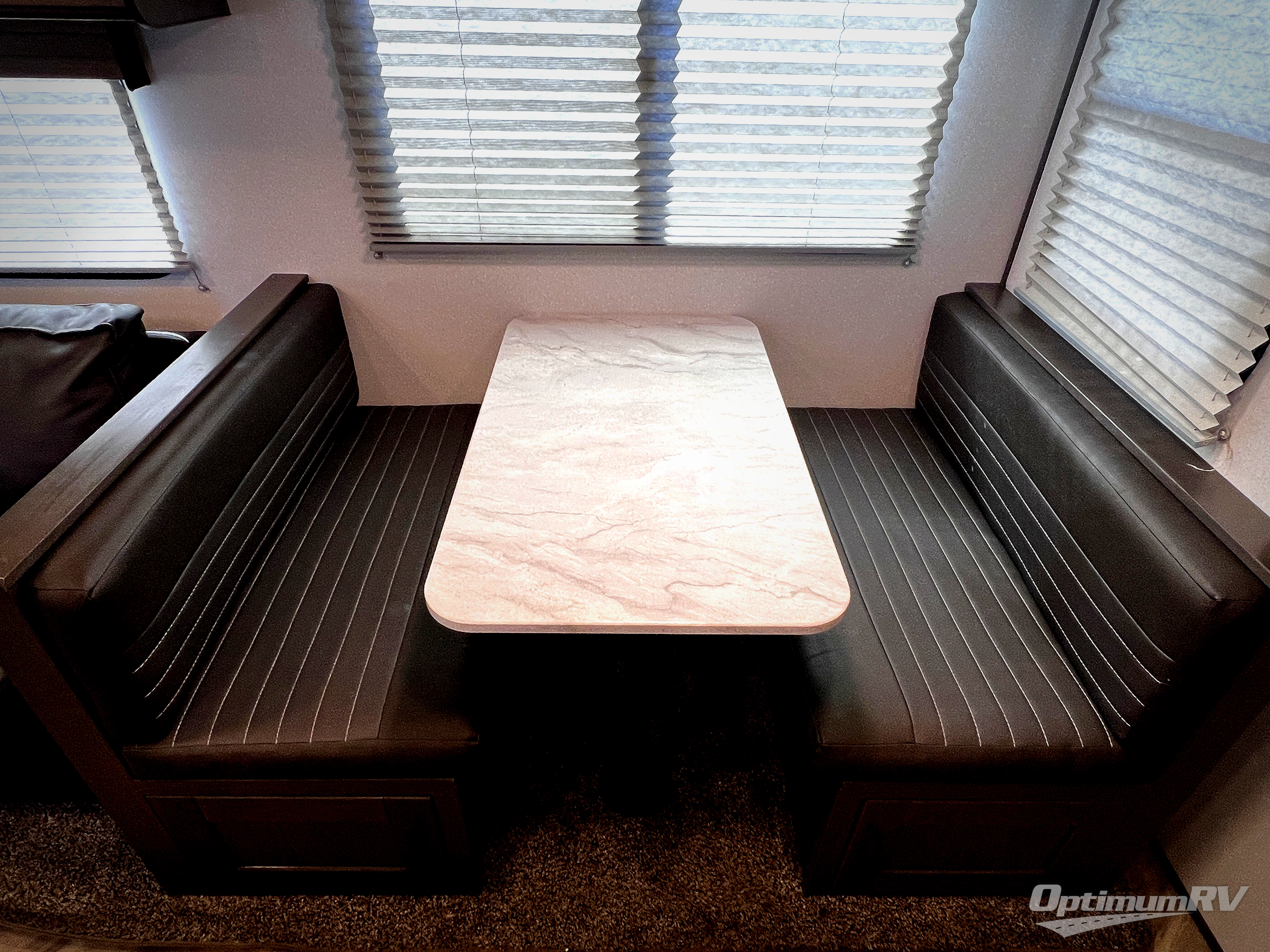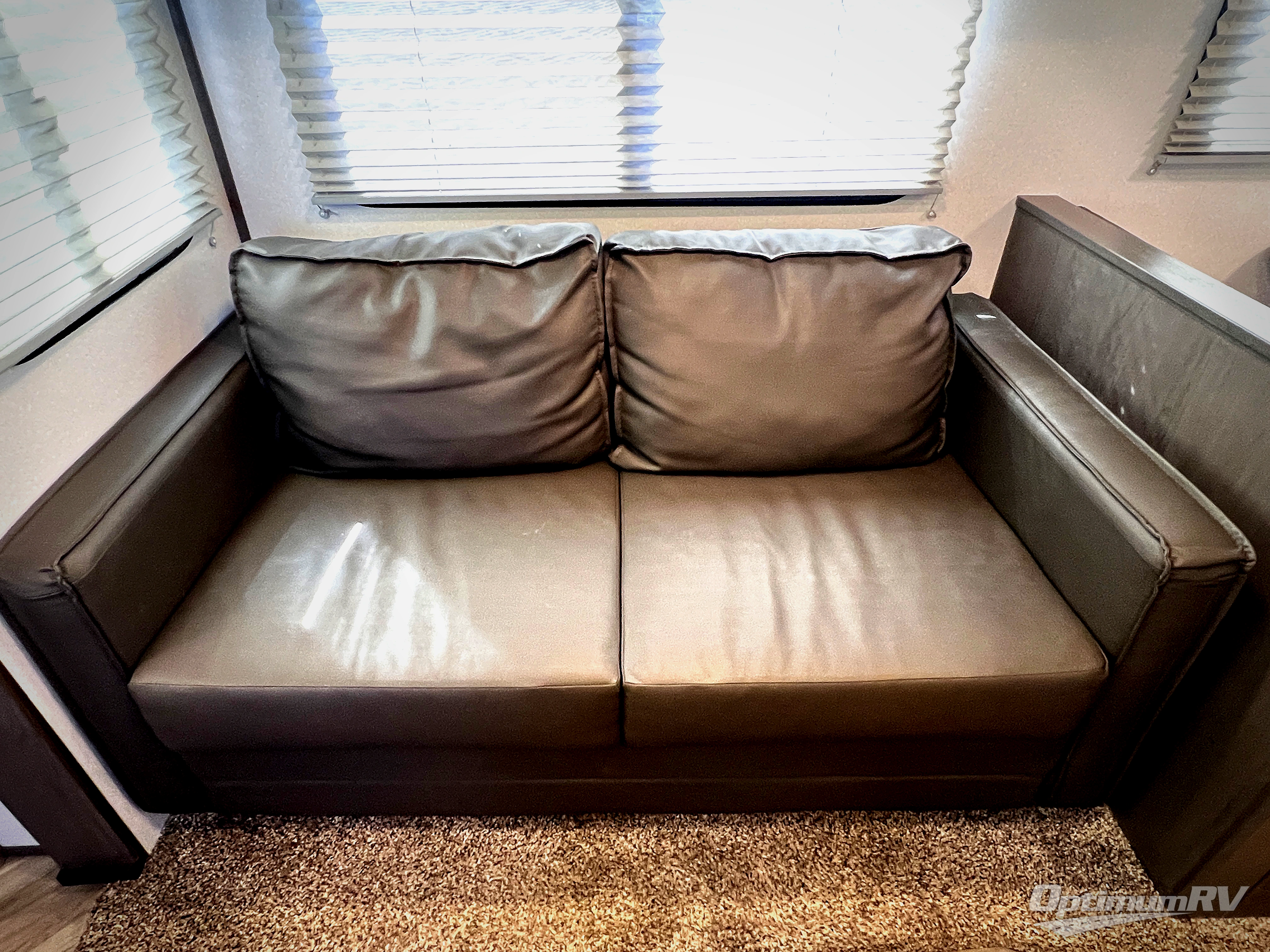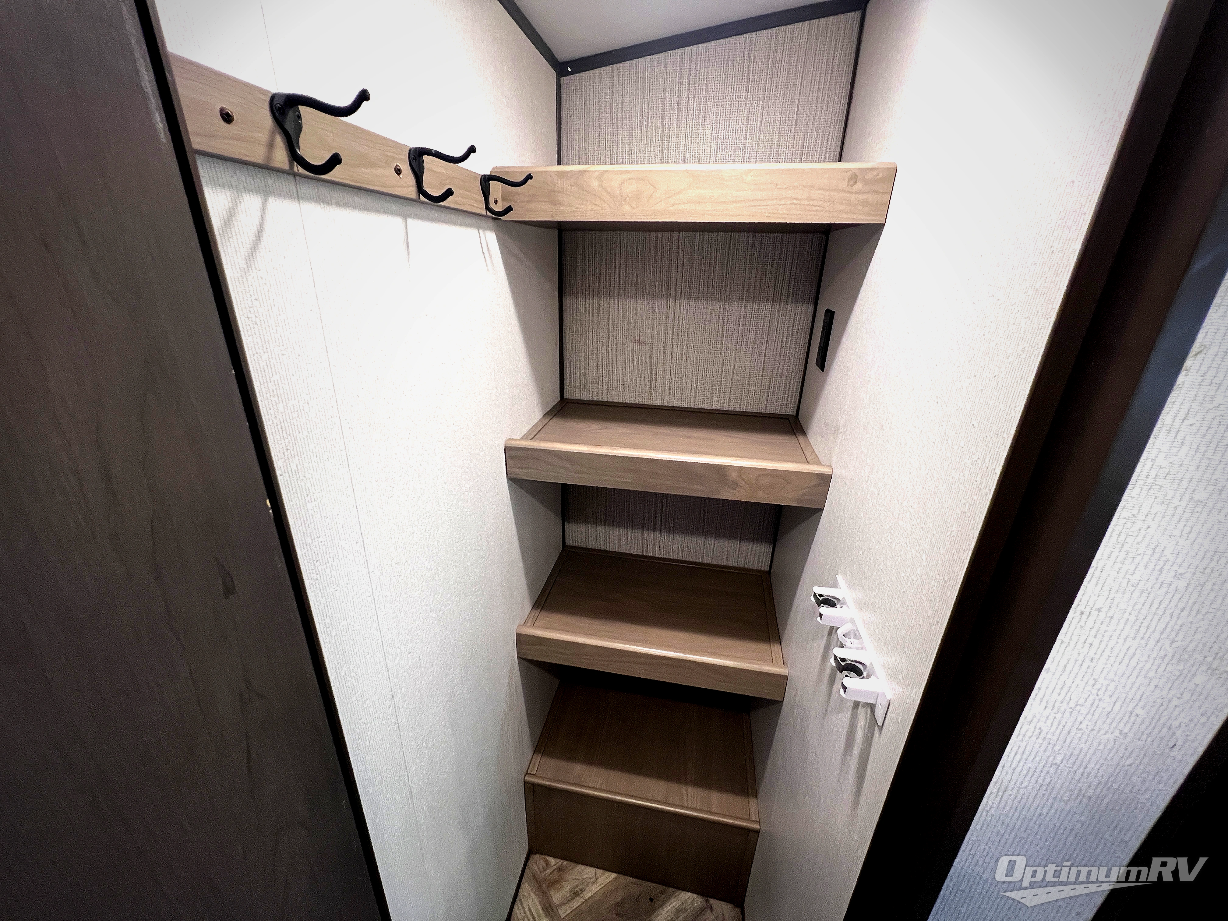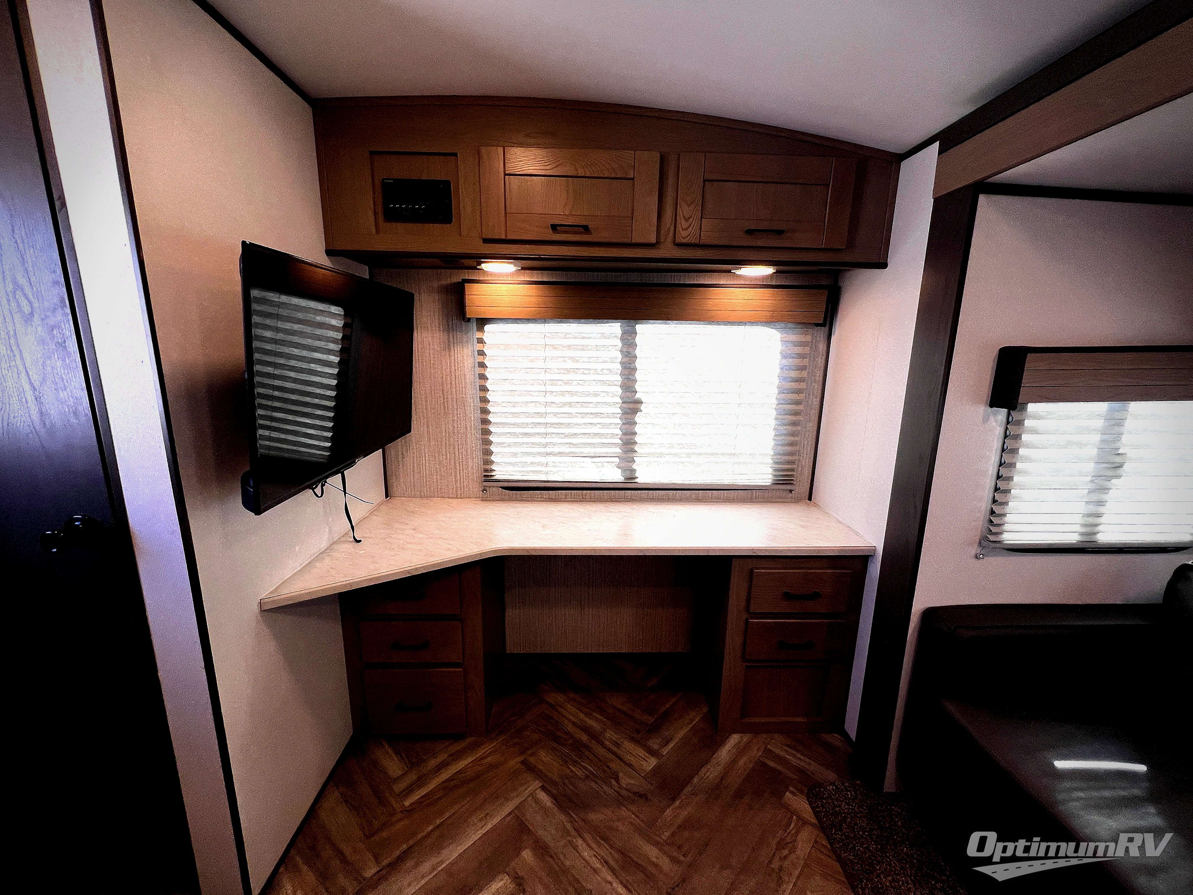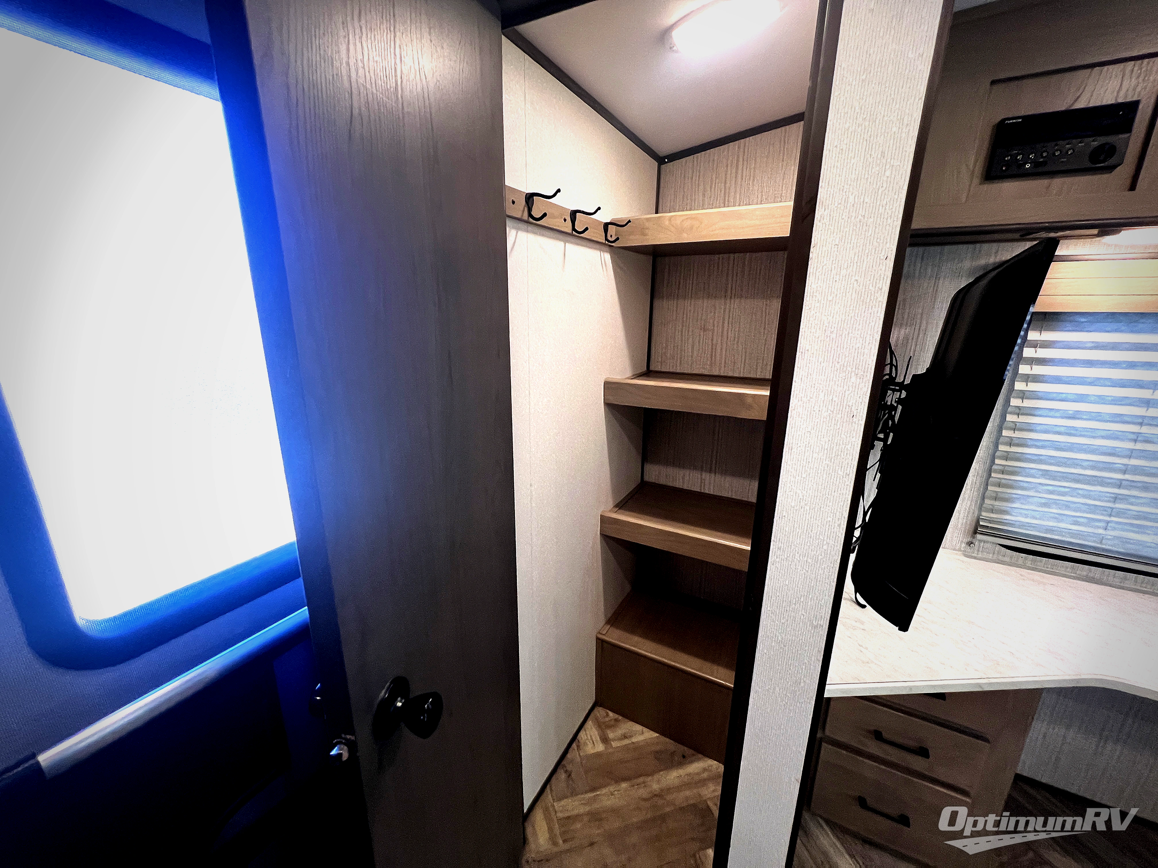 Convenience is found throughout this trailer for you and your spouse, plus your kids or overnight guests. The main entry gives you quick access to the walk-in pantry/wardrobe and living/kitchen area, and the second entry allows you to get into your bedroom and to the walk-through bathroom easily. Once inside you can relax on the sofa and booth dinette, make a meal in the middle kitchen with raised bar, work at the desk with a window for great views, and get clean up in the full bathroom. And you will have a king-size sliding bed at night, two wardrobes to store your clothing, and so much more in this trailer!