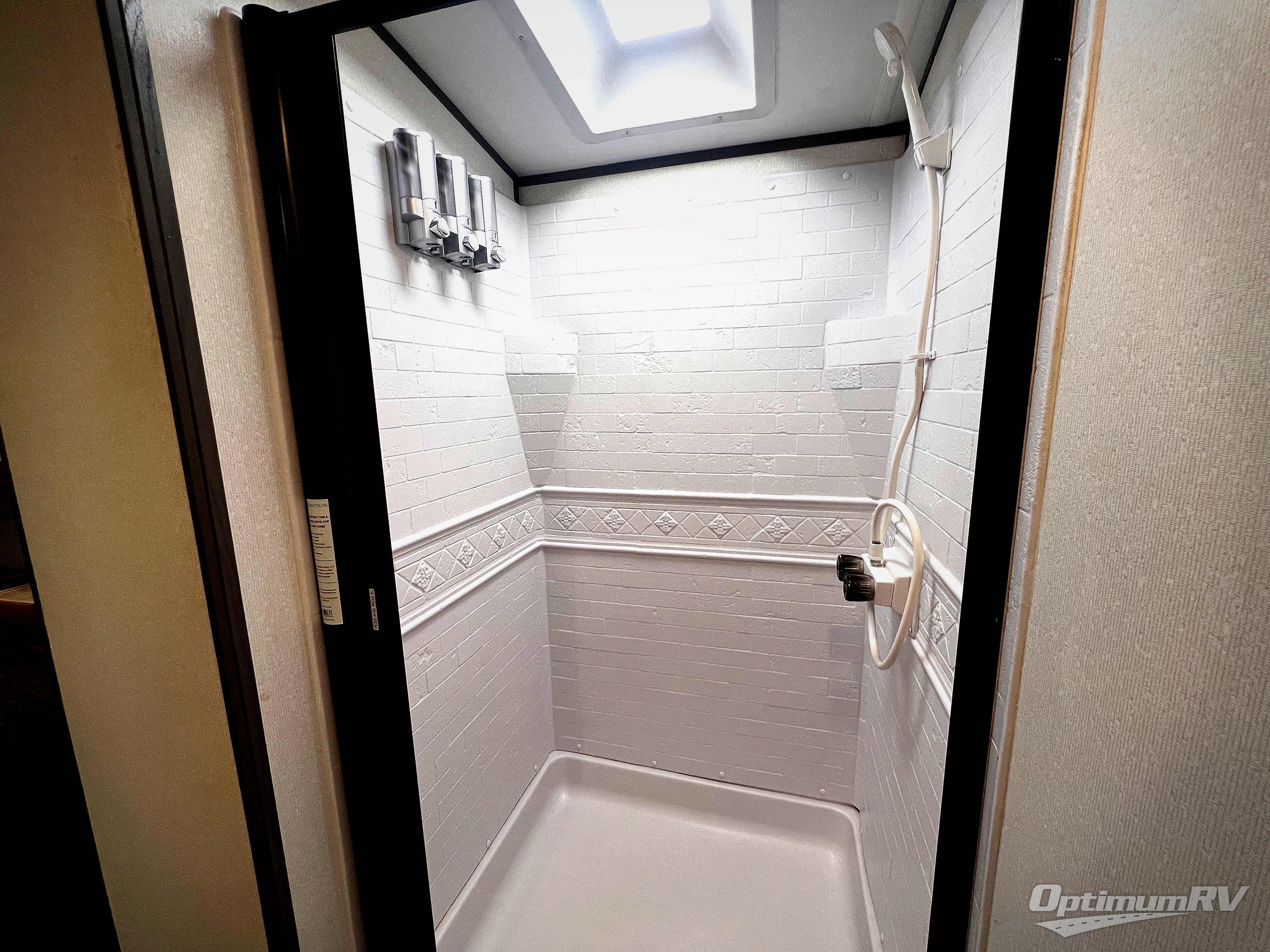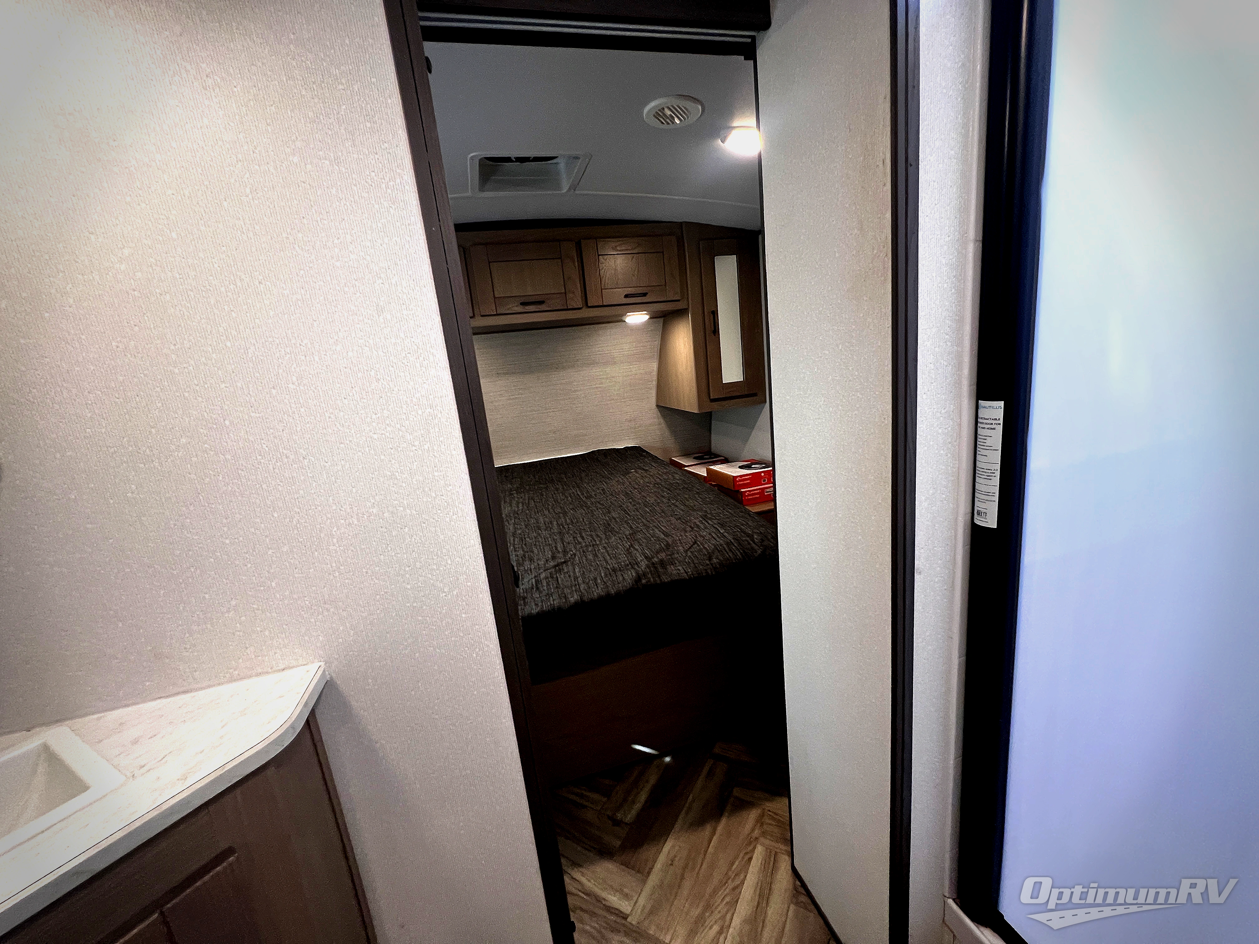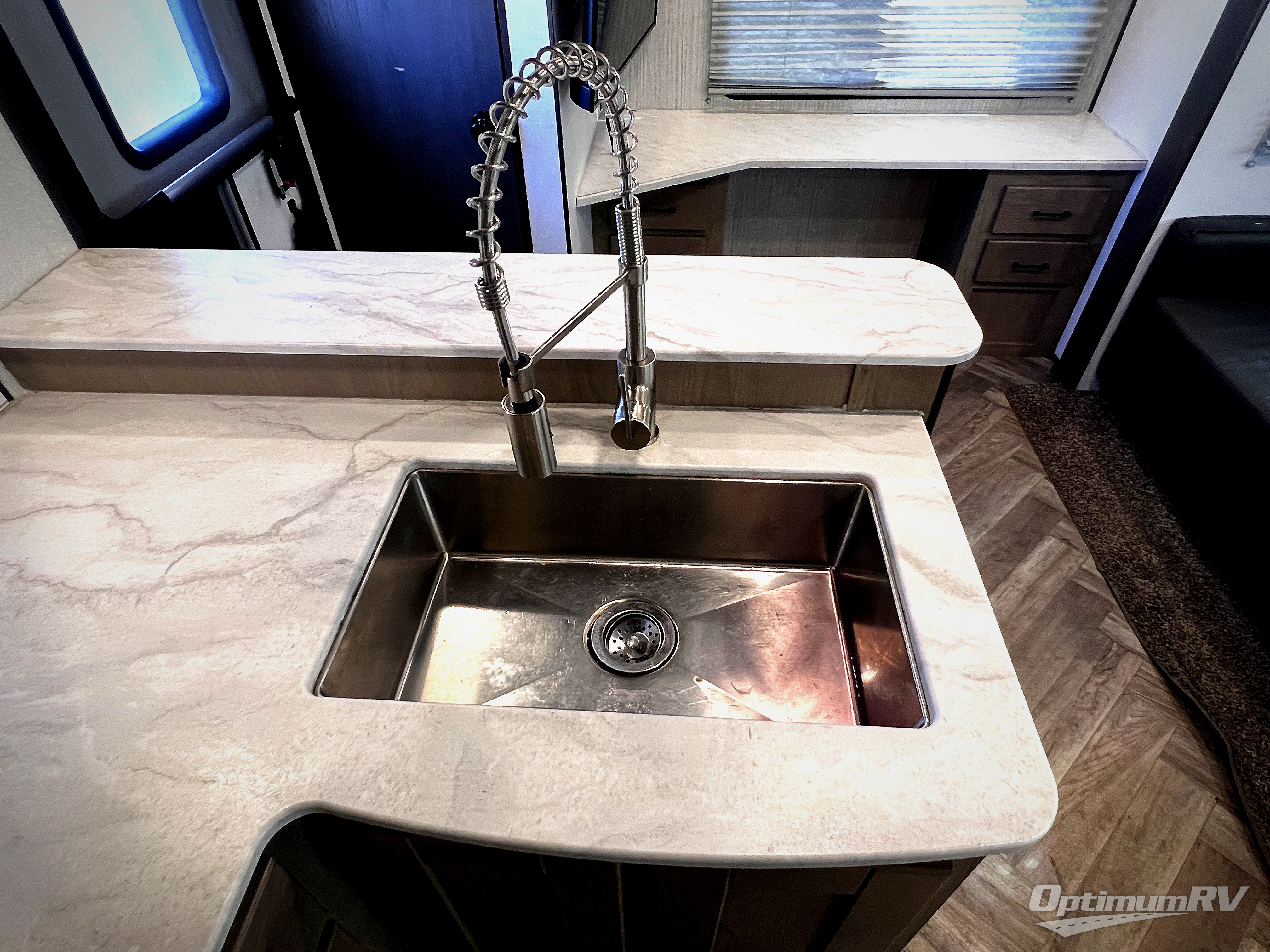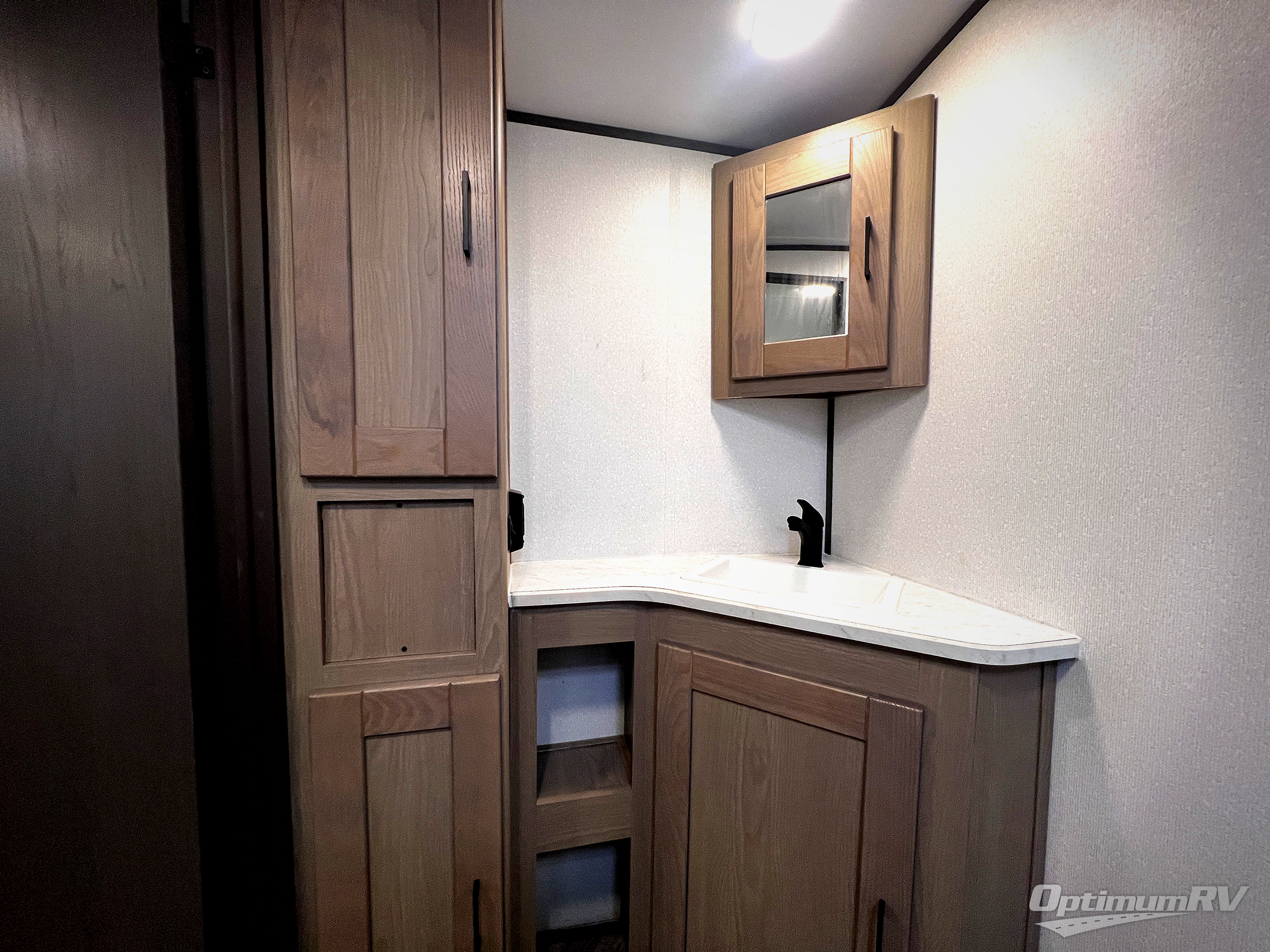 Convenience is found throughout this trailer for you and your spouse, plus your kids or overnight guests. The main entry gives you quick access to the walk-in pantry/wardrobe and living/kitchen area, and the second entry allows you to get into your bedroom and to the walk-through bathroom easily. Once inside you can relax on the sofa and booth dinette, make a meal in the middle kitchen with raised bar, work at the desk with a window for great views, and get clean up in the full bathroom. And you will have a king-size sliding bed at night, two wardrobes to store your clothing, and so much more in this trailer!