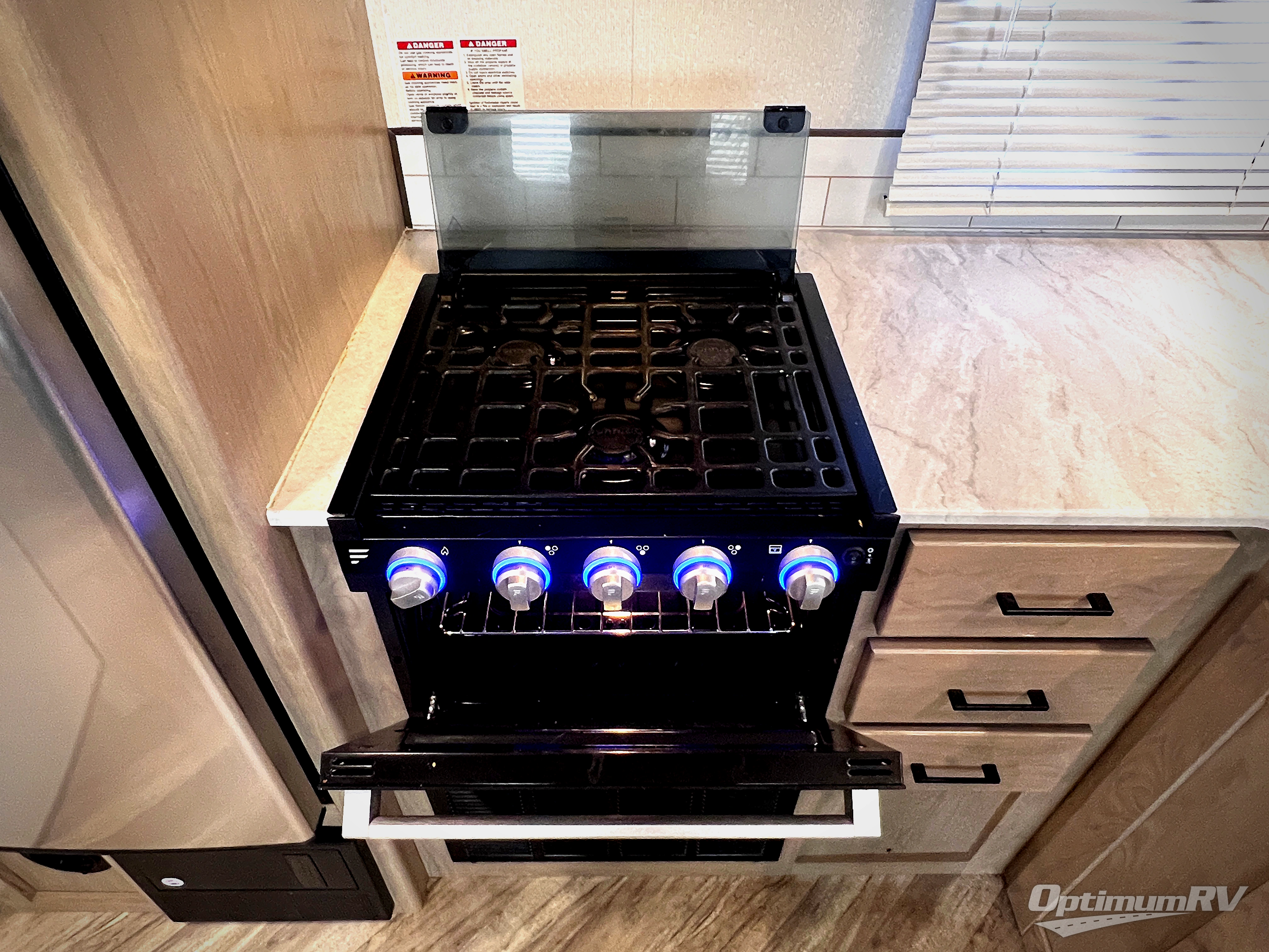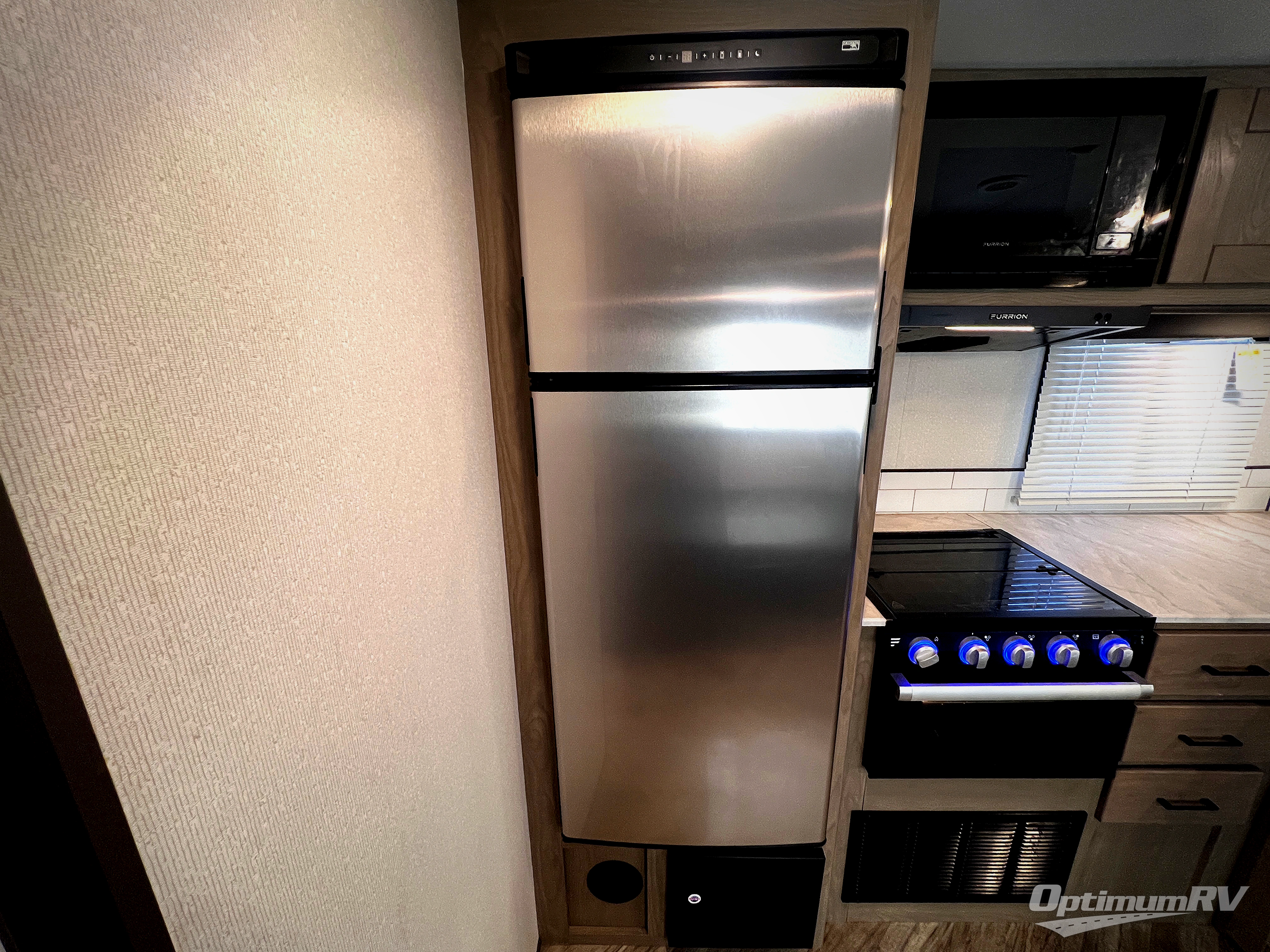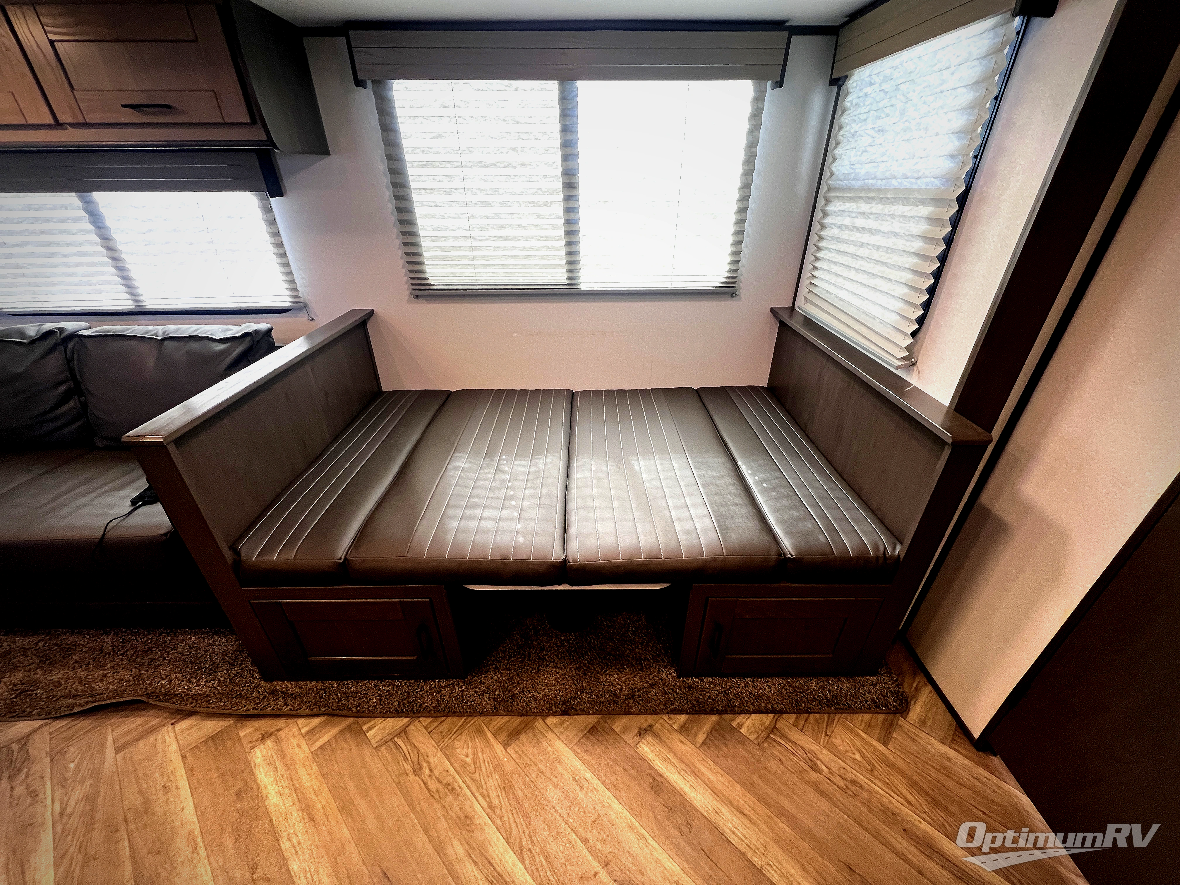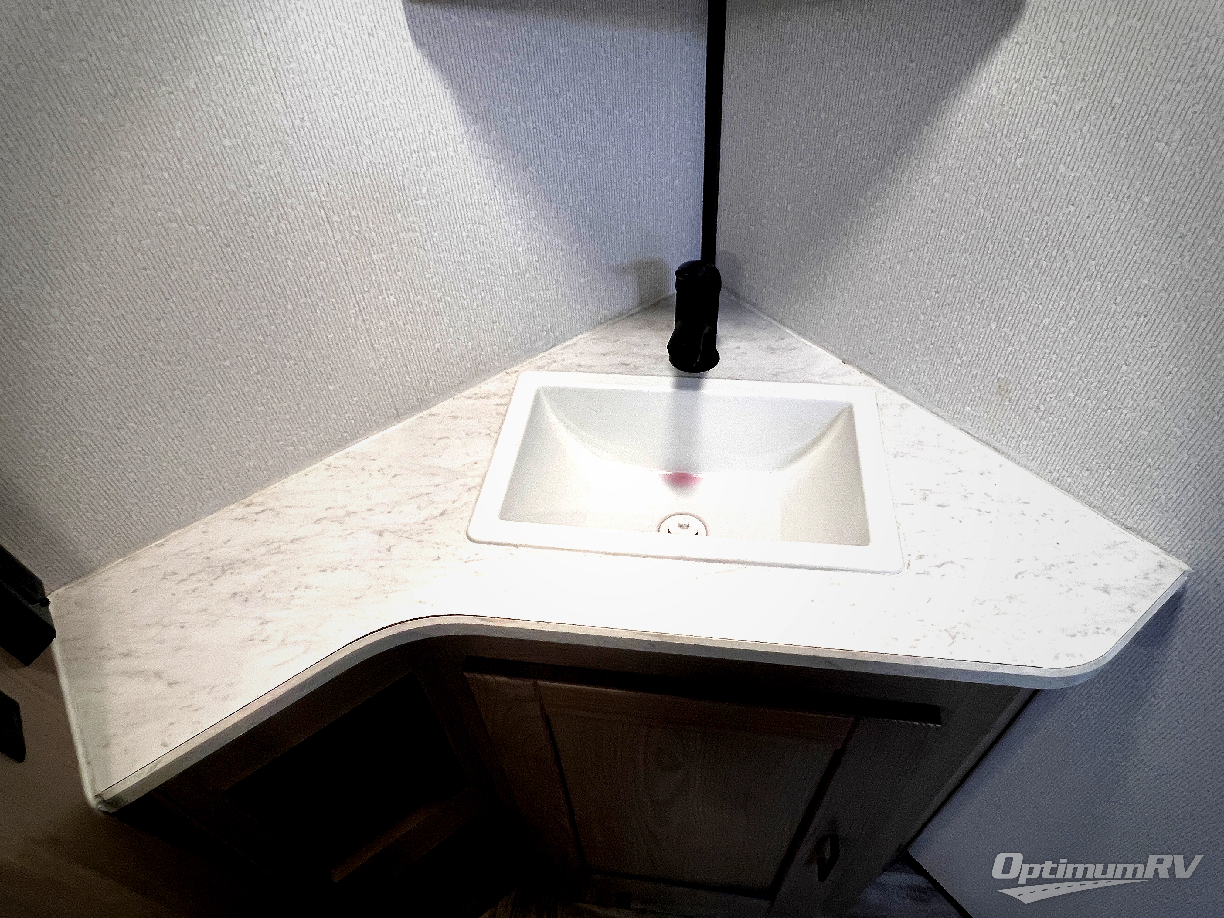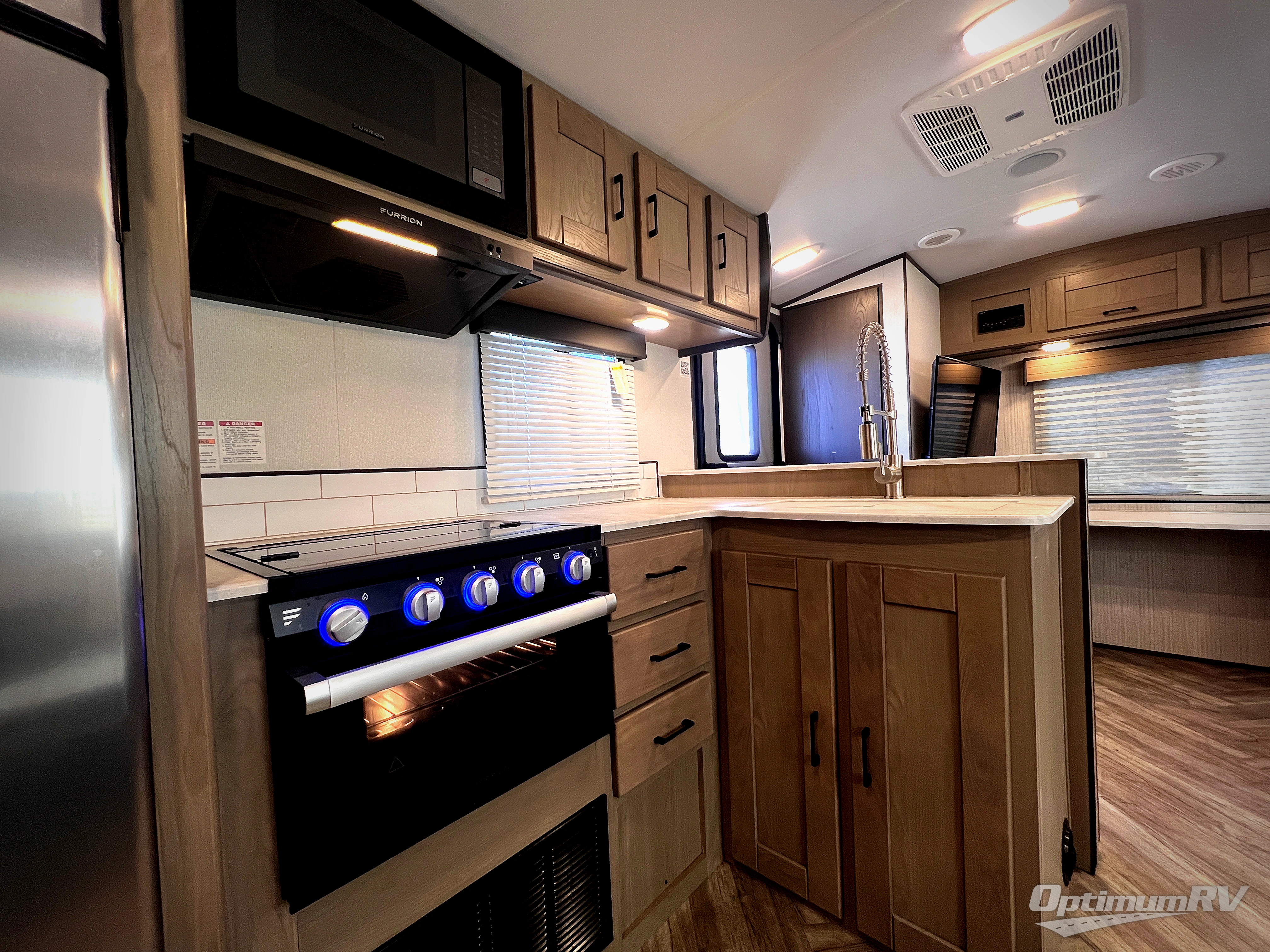 Convenience is found throughout this trailer for you and your spouse, plus your kids or overnight guests. The main entry gives you quick access to the walk-in pantry/wardrobe and living/kitchen area, and the second entry allows you to get into your bedroom and to the walk-through bathroom easily. Once inside you can relax on the sofa and booth dinette, make a meal in the middle kitchen with raised bar, work at the desk with a window for great views, and get clean up in the full bathroom. And you will have a king-size sliding bed at night, two wardrobes to store your clothing, and so much more in this trailer!