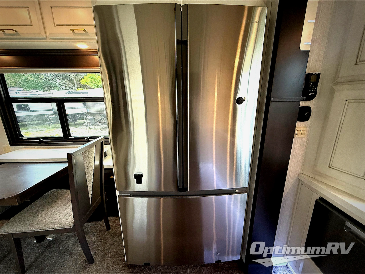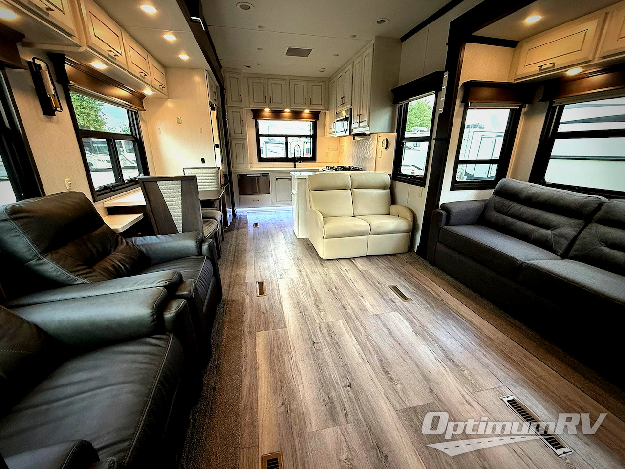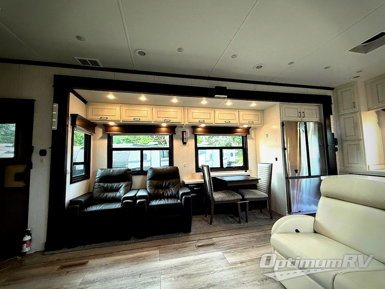 Imagine your own rear gourmet kitchen with high polished solid surface countertops, a stainless steel residential dishwasher, a convection/microwave, and a residential stainless steel French door refrigerator to enjoy making meals for your spouse and your family when they visit. The lighted pantry and kitchen/bathroom toe kicks are an added luxury you will surely appreciate especially at night. The separate living area offers dual residential recliners to relax and unwind, a fireplace, and two sofas. There is a handy half bathroom for your guests only steps away, and you can enjoy your own full front bath after walking through your master bedroom with a king bed. The spacious bathroom offers a dual sink vanity, a walk-in closet, and a space to add a washer/dryer option.