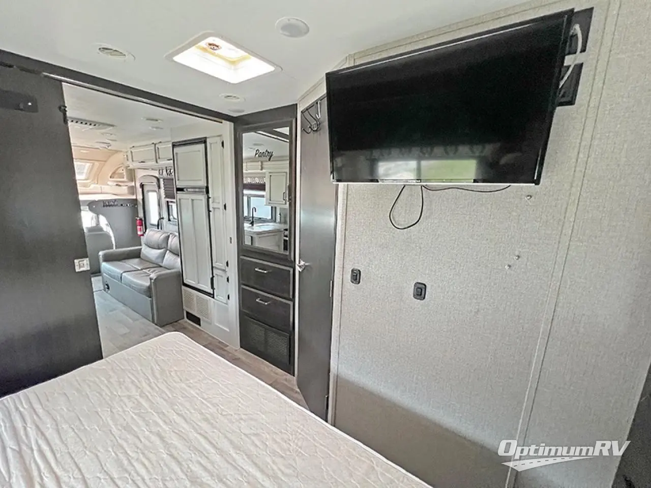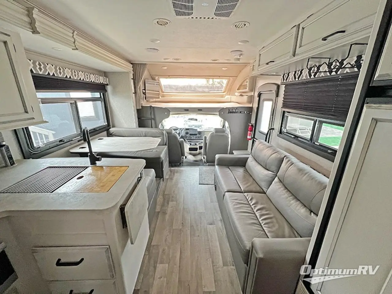 You will sleep like royalty in this motorhome with the 70" x 76" king bed which also has a TV prep area across from it in the private bedroom! Start each morning feeling clean and fresh after showering in the 30" x 36" shower. The kitchen has everything you need to prepare a delicious breakfast including a countertop extension and a 8 cu. ft. refrigerator to keep your creamer cold for your coffee. The booth dinette is not only great for enjoying your meals, but also for playing games and transforming into an extra sleeping space. The sofa and the cab-over bunk also offer sleeping space for more guests!