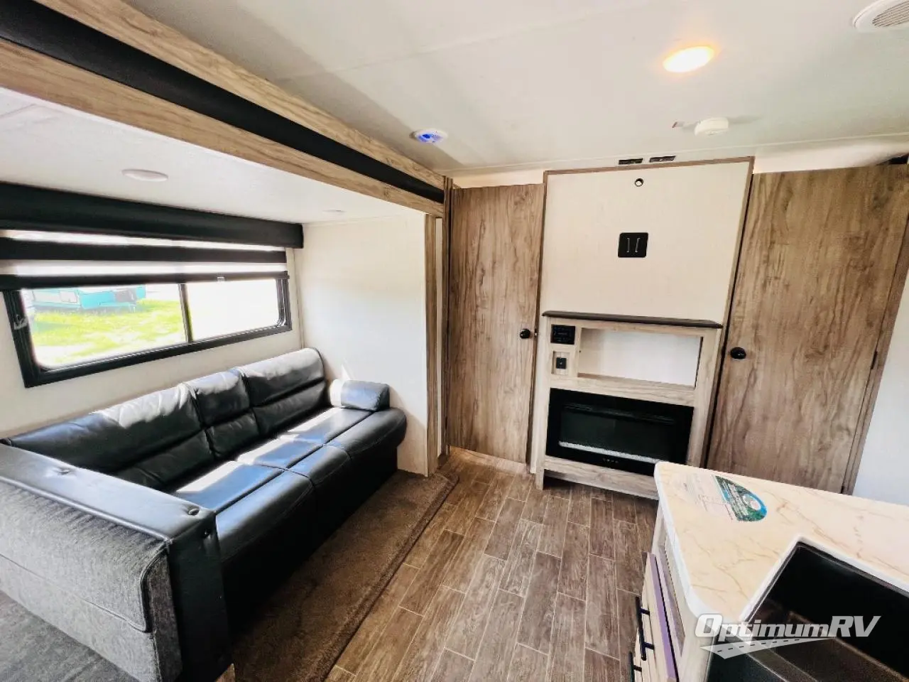 Spend your weekends with the whole family in the most popular multi-sleeper with this travel trailer! The dual entry doors make for a smooth flow of traffic in and out of the unit, plus one of the doors leads directly into the rear corner bathroom so you can get back to playing outdoors fast. The oversized U-shaped dinette is big enough for everyone to gather around at meal times and to play games. If mother nature is raining on your parade then you can relax on the jackknife sofa and enjoy the electric fireplace, just grab a snack from the large pantry and a drink from the 12V residential refrigerator.. If you're feeling brave then you can head outdoors and watch the rain poor down as you stay protected underneath the oversized 20' awning, plus there is a deluxe outside kitchen for you to cook while you watch the kids play when the sun is shining!