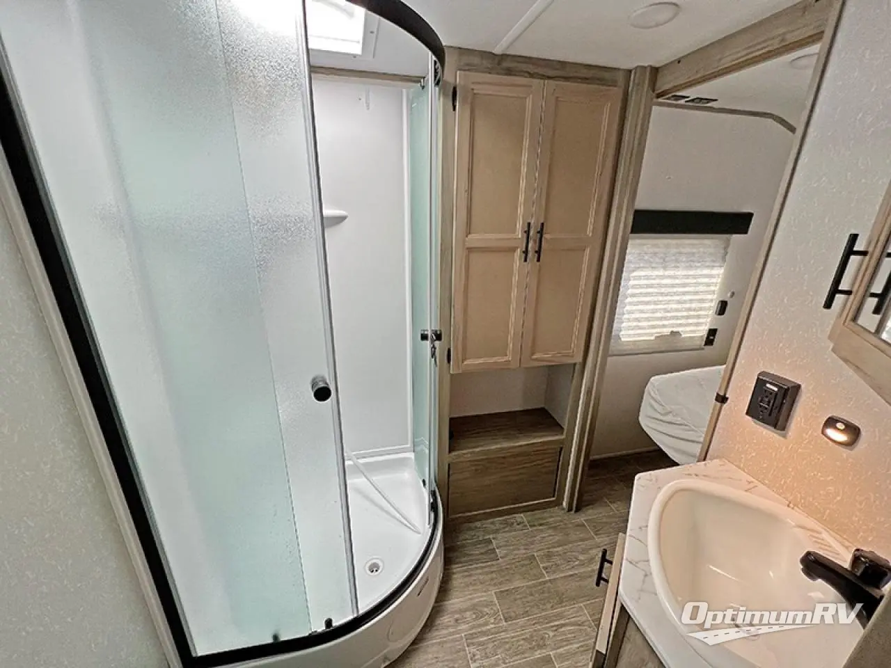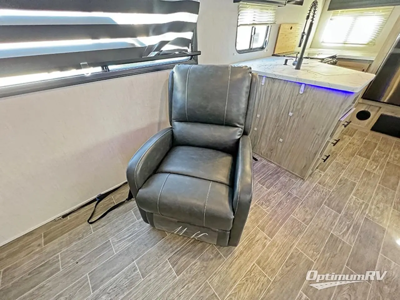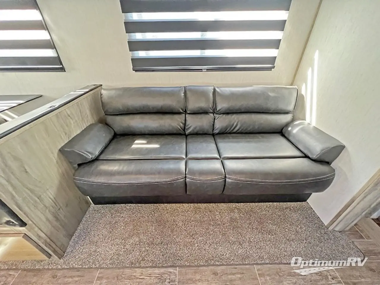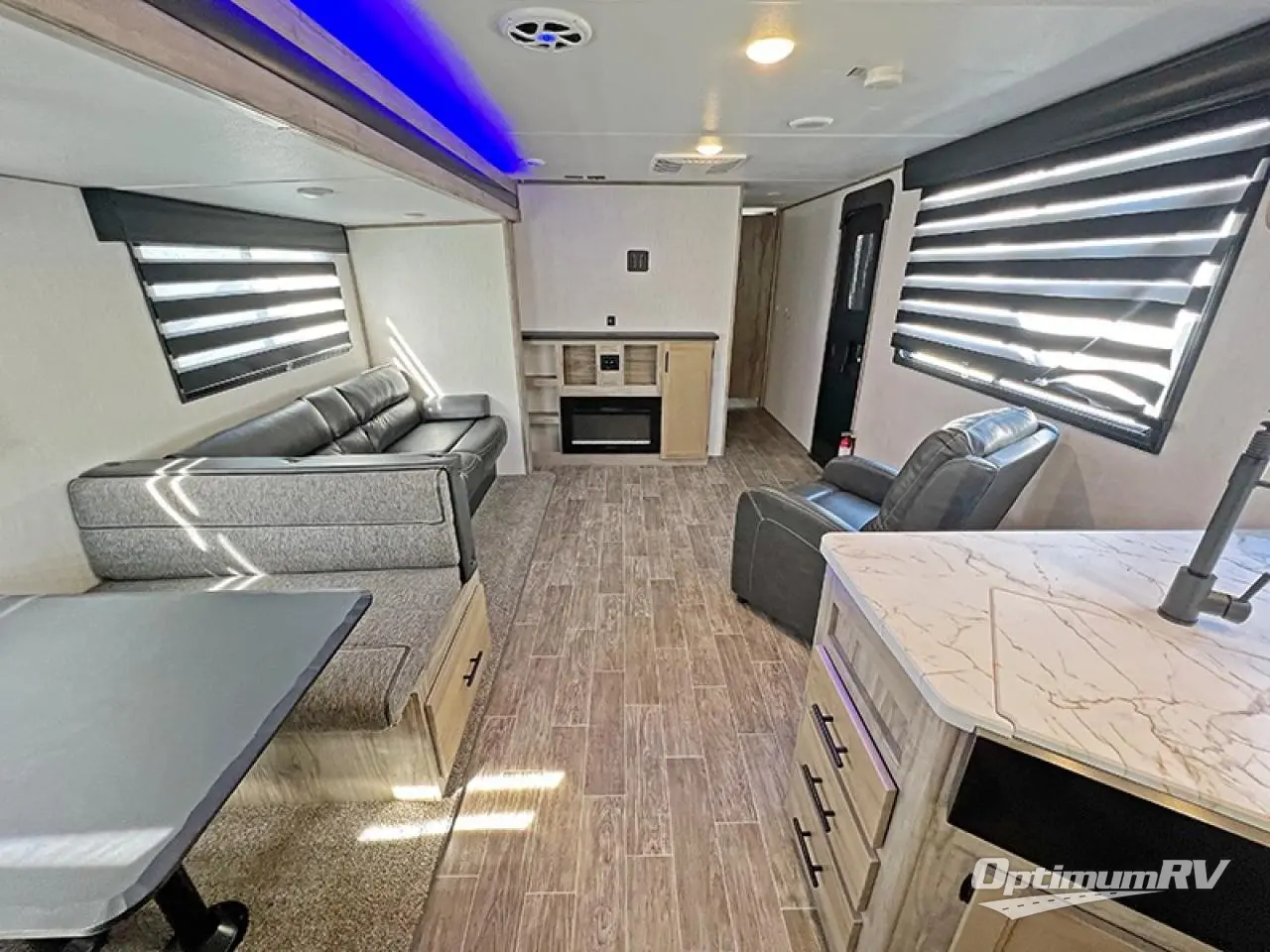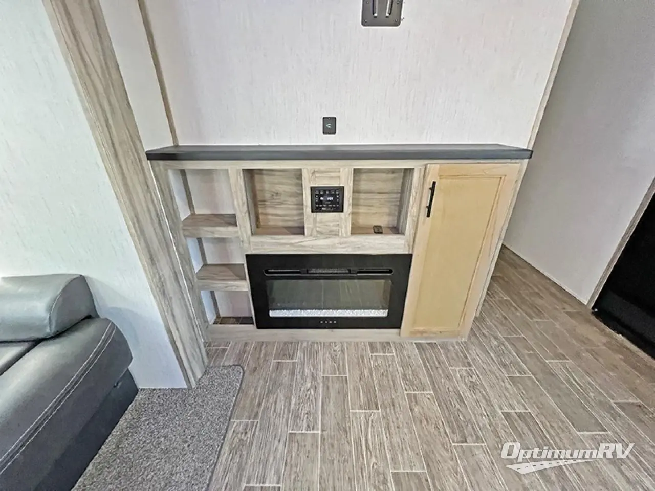 You and your spouse will love all of the interior storage throughout and the cross conversational seating area with a great view of your scenery in this travel trailer! The deluxe recliner seating and jackknife sofa allows you to relax in true comfort by the electric fireplace. The rear kitchen makes it easy for you to move around and prepare a delicious meal, plus the walk-in pantry is big enough to hold all of your favorite snacks. If you wish to breathe in some fresh air while cooking then you can head to the deluxe outside kitchen. The dual entry bathroom is easy for everyone to access especially those sleeping in the front private bedroom on the comfortable queen bed with nightstands and shirt closets on either side of it. You can also store all of your camping gear in the exterior full pass-through storage area!
