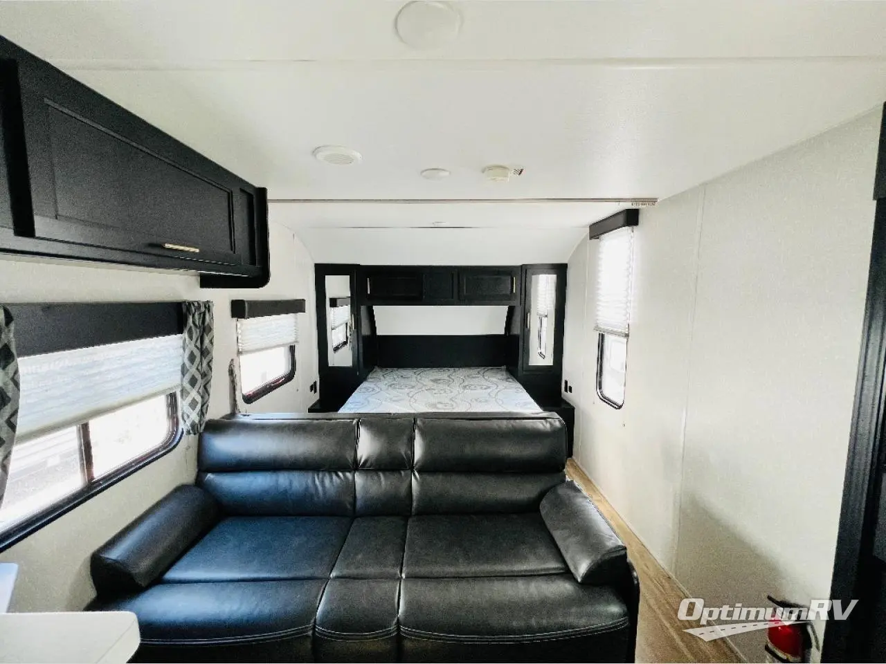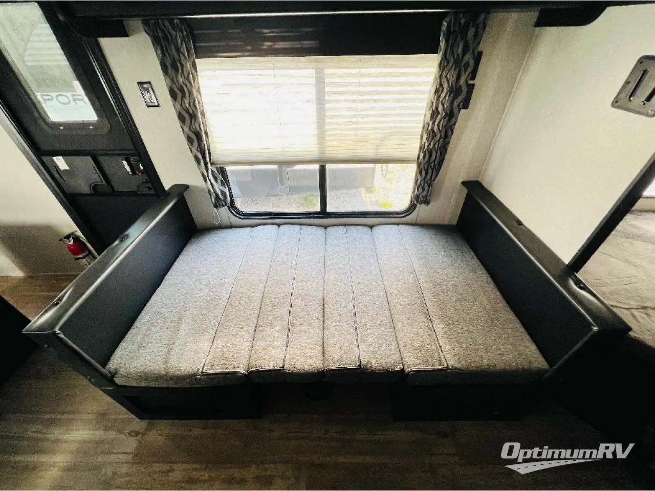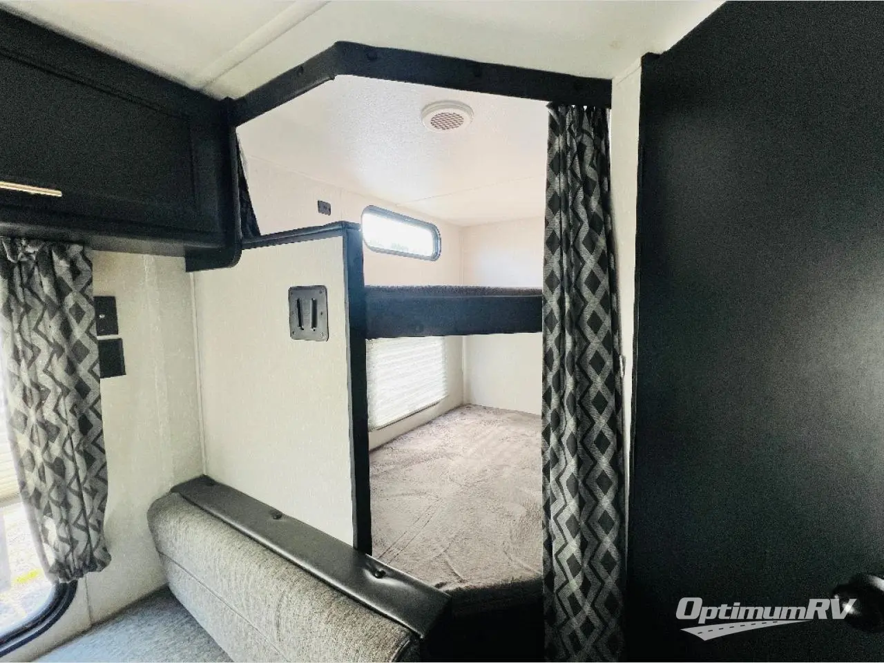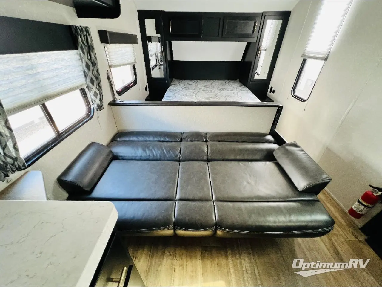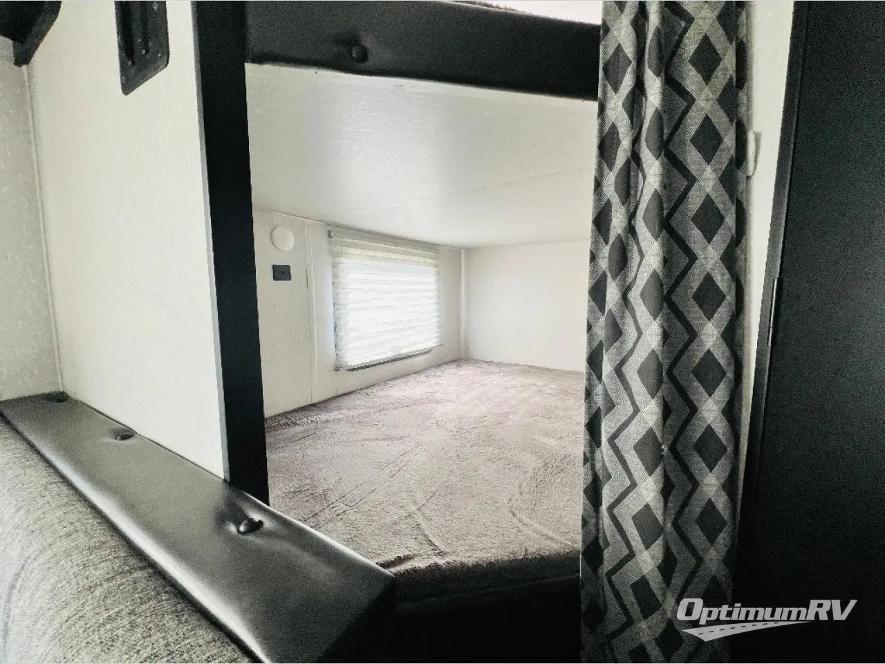 Enjoy cooking for your family of nine in this Cherokee Grey Wolf travel trailer. With a three-burner cooktop, an overhead microwave, and an oven, you can easily cook just like home. The residential farm-style stainless steel sink makes cleaning your larger pots and pans quite simple, and the large overhead cabinets make storage an easy task as well. There is plenty of seating for the whole gang with the sofa and the booth dinette to play a game or two after you have enjoyed your delicious meal. Your kiddos are sure to love having their own set of double-size bunks conveniently located next to the rear bath, and you will love having your own front semi-private bedroom when you close the privacy curtain. You can also create some outdoor living space beneath the 15' power awning so that you can enjoy the great outdoors whether rain or shine!