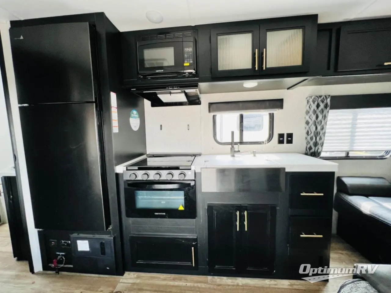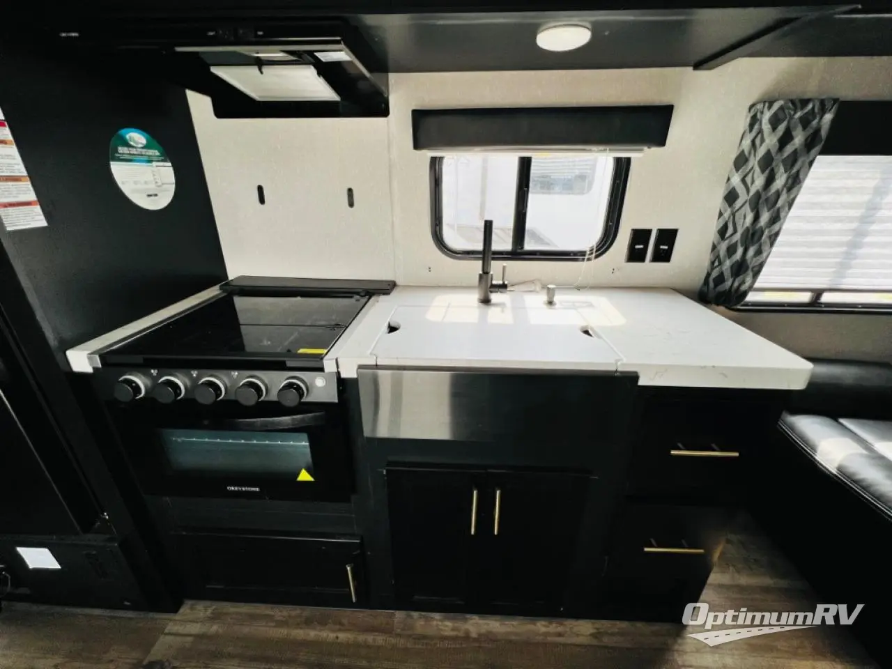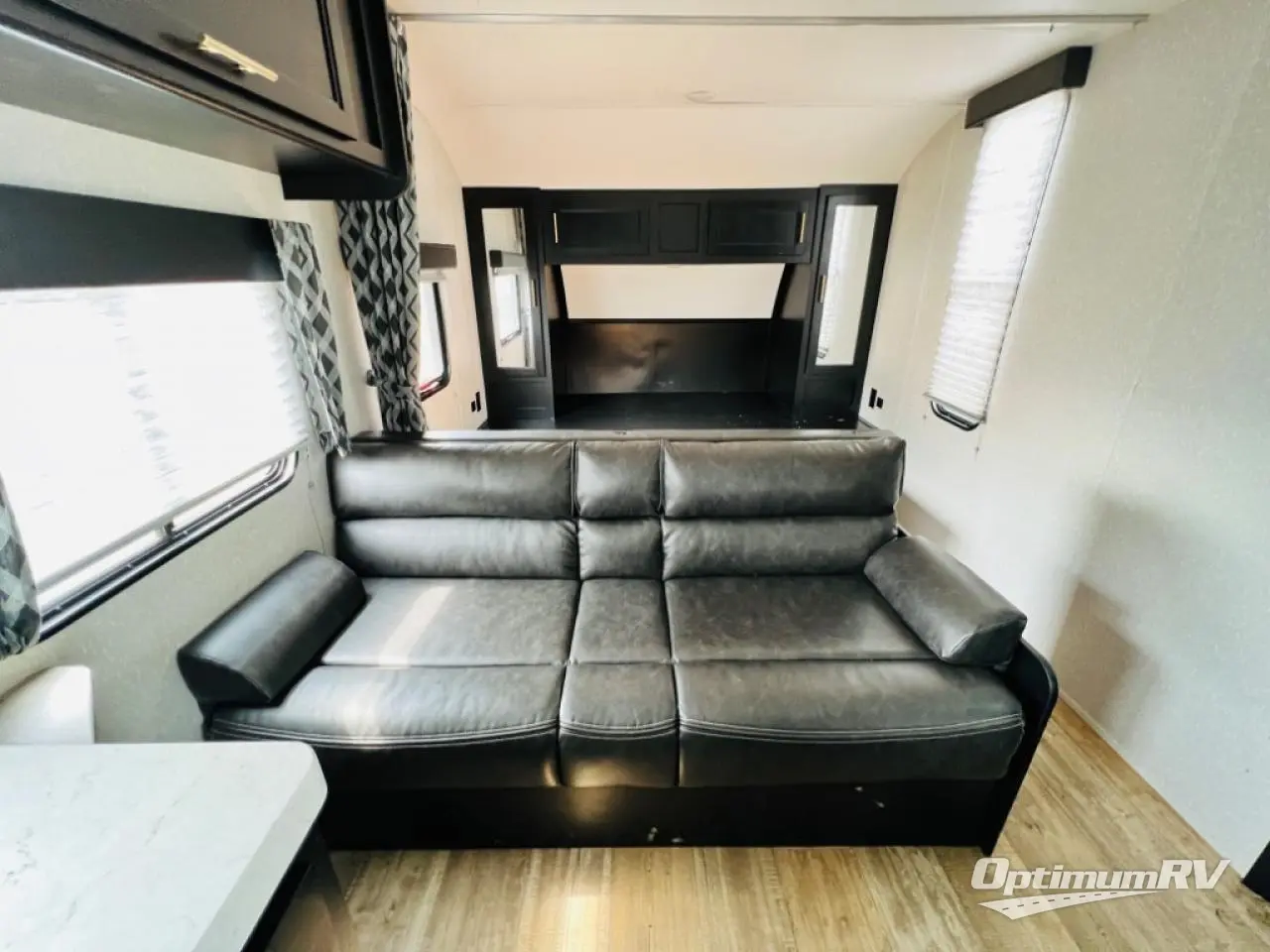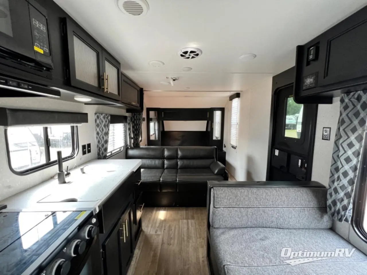 Enjoy cooking for your family of nine in this Cherokee Grey Wolf travel trailer. With a three-burner cooktop, an overhead microwave, and an oven, you can easily cook just like home. The residential farm-style stainless steel sink makes cleaning your larger pots and pans quite simple, and the large overhead cabinets make storage an easy task as well. There is plenty of seating for the whole gang with the sofa and the booth dinette to play a game or two after you have enjoyed your delicious meal. Your kiddos are sure to love having their own set of double-size bunks conveniently located next to the rear bath, and you will love having your own front semi-private bedroom when you close the privacy curtain. You can also create some outdoor living space beneath the 15' power awning so that you can enjoy the great outdoors whether rain or shine!