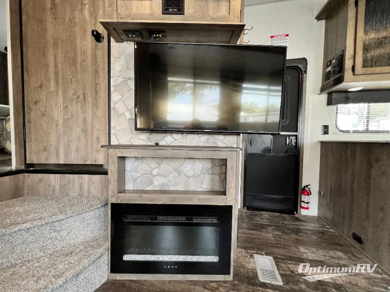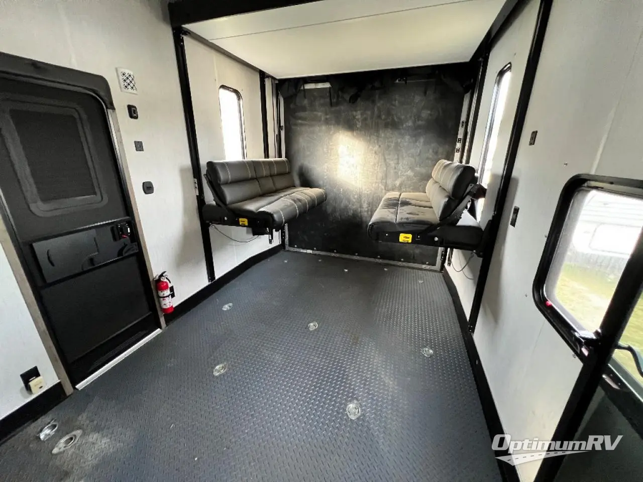 Enjoy space to relax and have fun in this toy hauler fifth wheel that can easily be converted into a bunkhouse model. Once you unload your four wheeler or dirt bikes from the 12' garage, set up the ramp door "party patio" for extra fun. The kids can enjoy lunch on the removable dinette table, or sit at the booth dinette in the main living area. There are dual entry doors for added convenience, and a large slide out so you won't trip over the napping dog. The chef of the family can prepare meals in the spacious kitchen, and the fireplace right across from the jack knife sofa will make it feel more like home. You and your spouse will love the front master bedroom that includes a Wolf Pack king bed, three wardrobes, plus your own private entrance into the dual entry bath!