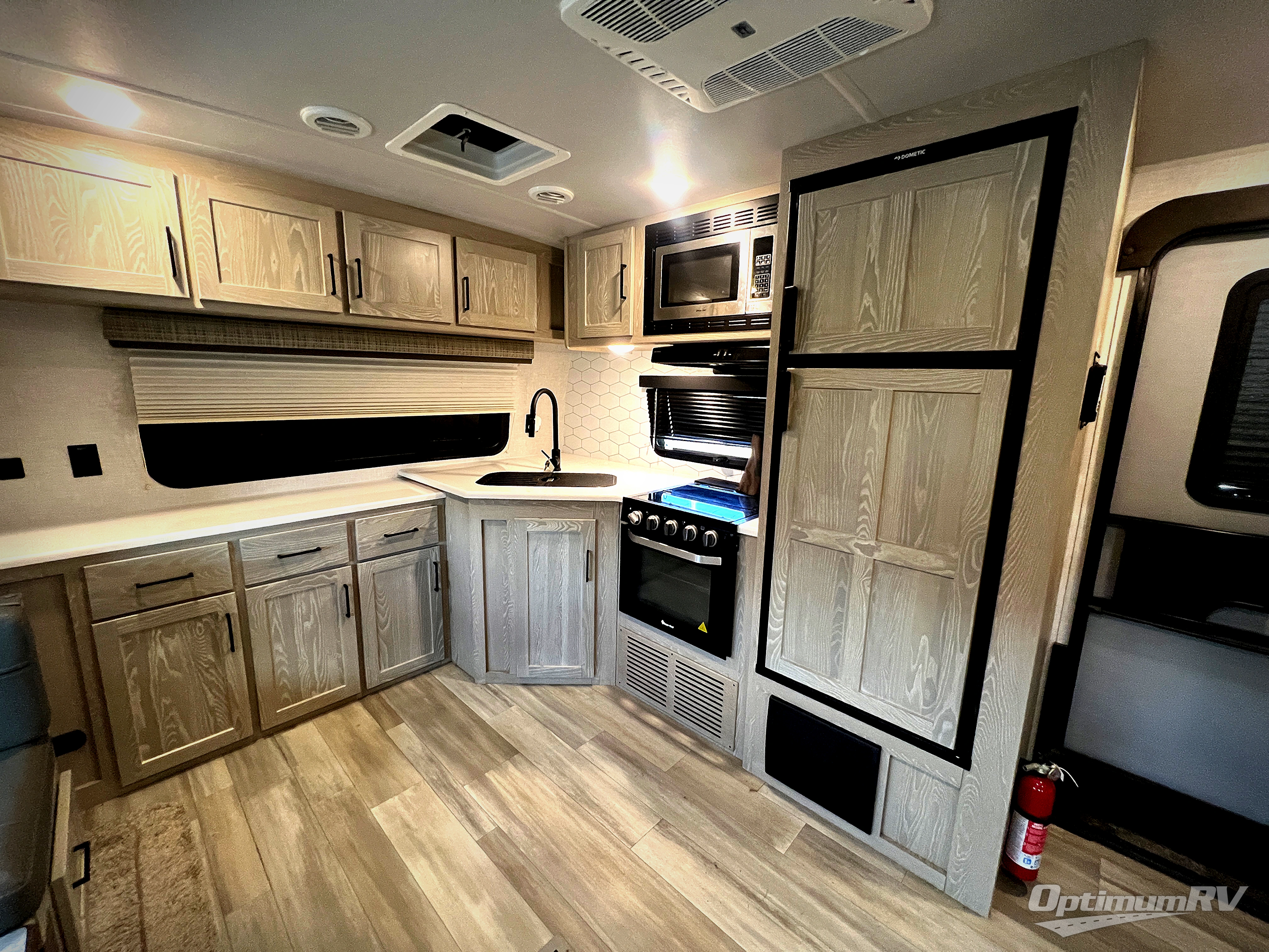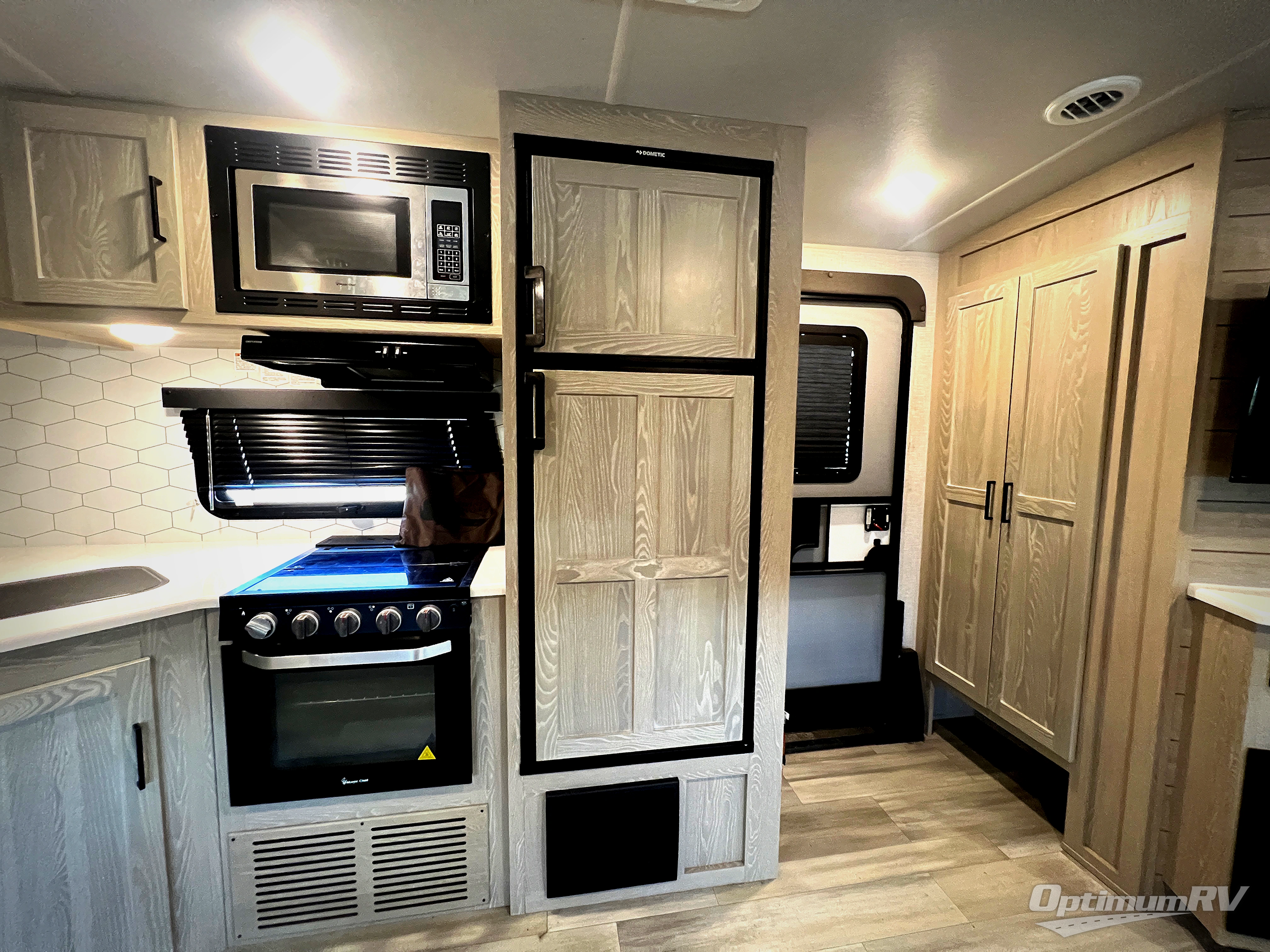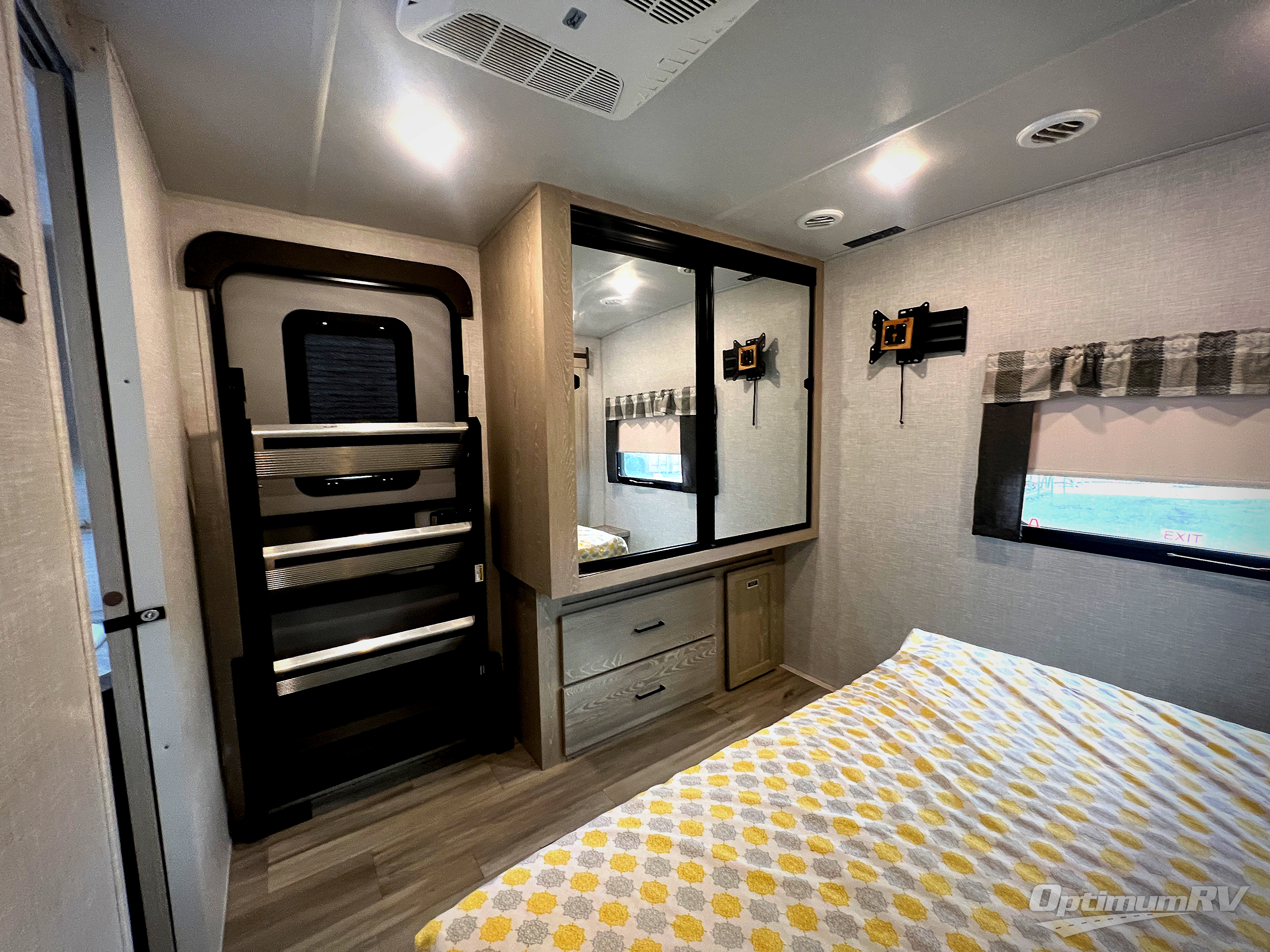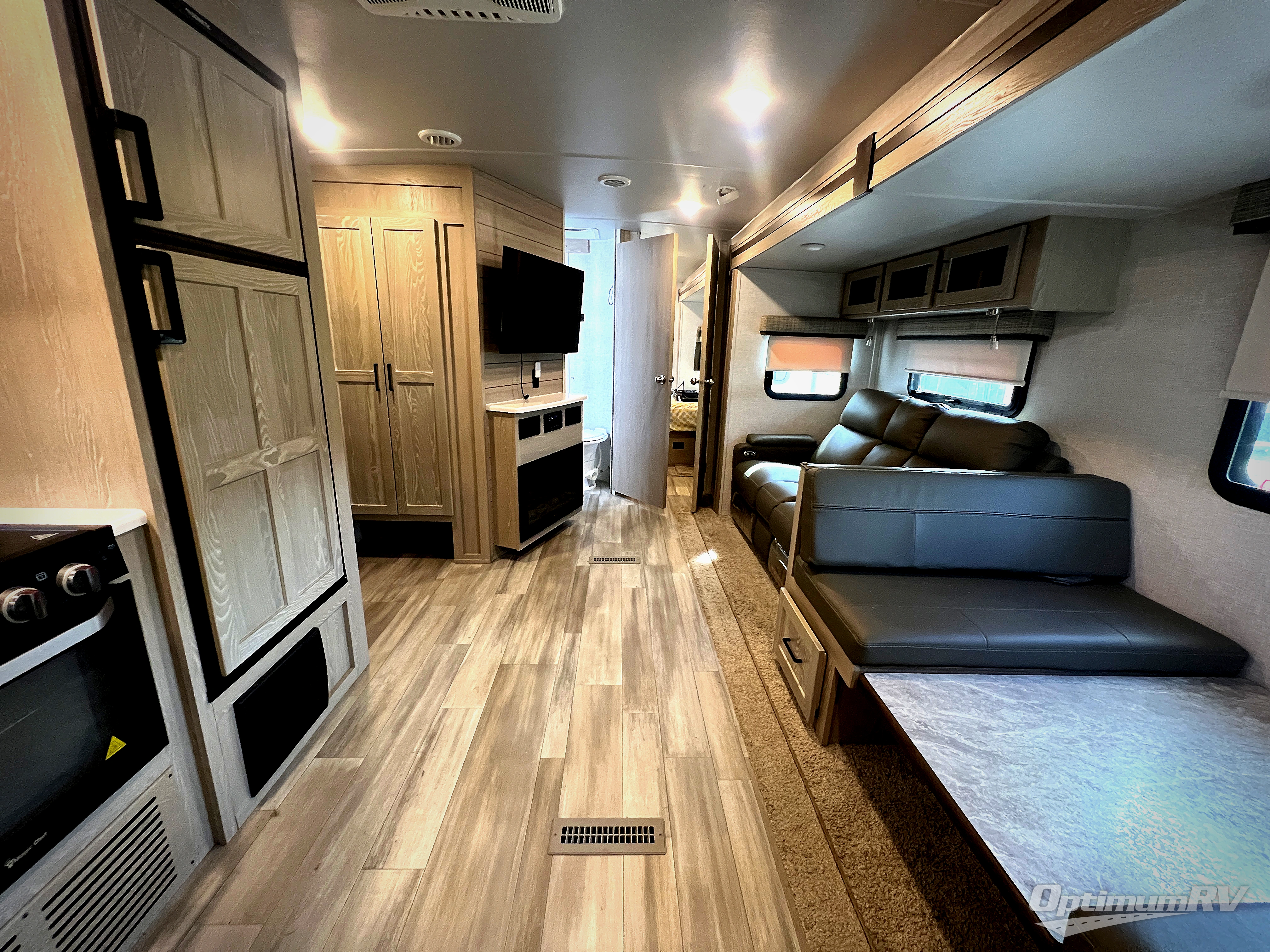 This trailer allows you to enjoy privacy in the rear bedroom with your own queen bed, nightstands, and plenty of wardrobe space next to the second entry/exit door. The two entry doors make for a smooth flow of traffic in and out of the unit whether you are in the bedroom or main living area. The best way to wind down your night is by grabbing a drink and lying back on the 67" hide-a-bed sofa in front of the cozy fireplace. If you want to experience the outdoors to its fullest, then get a camp chair and sit back underneath the 21' power awning with an LED light strip!
