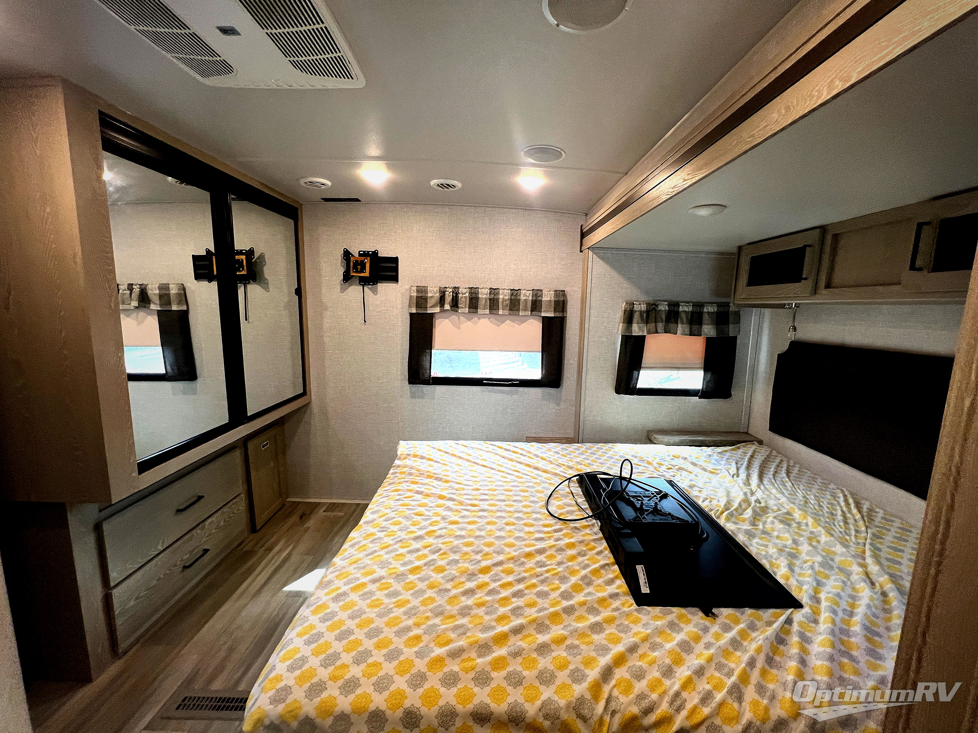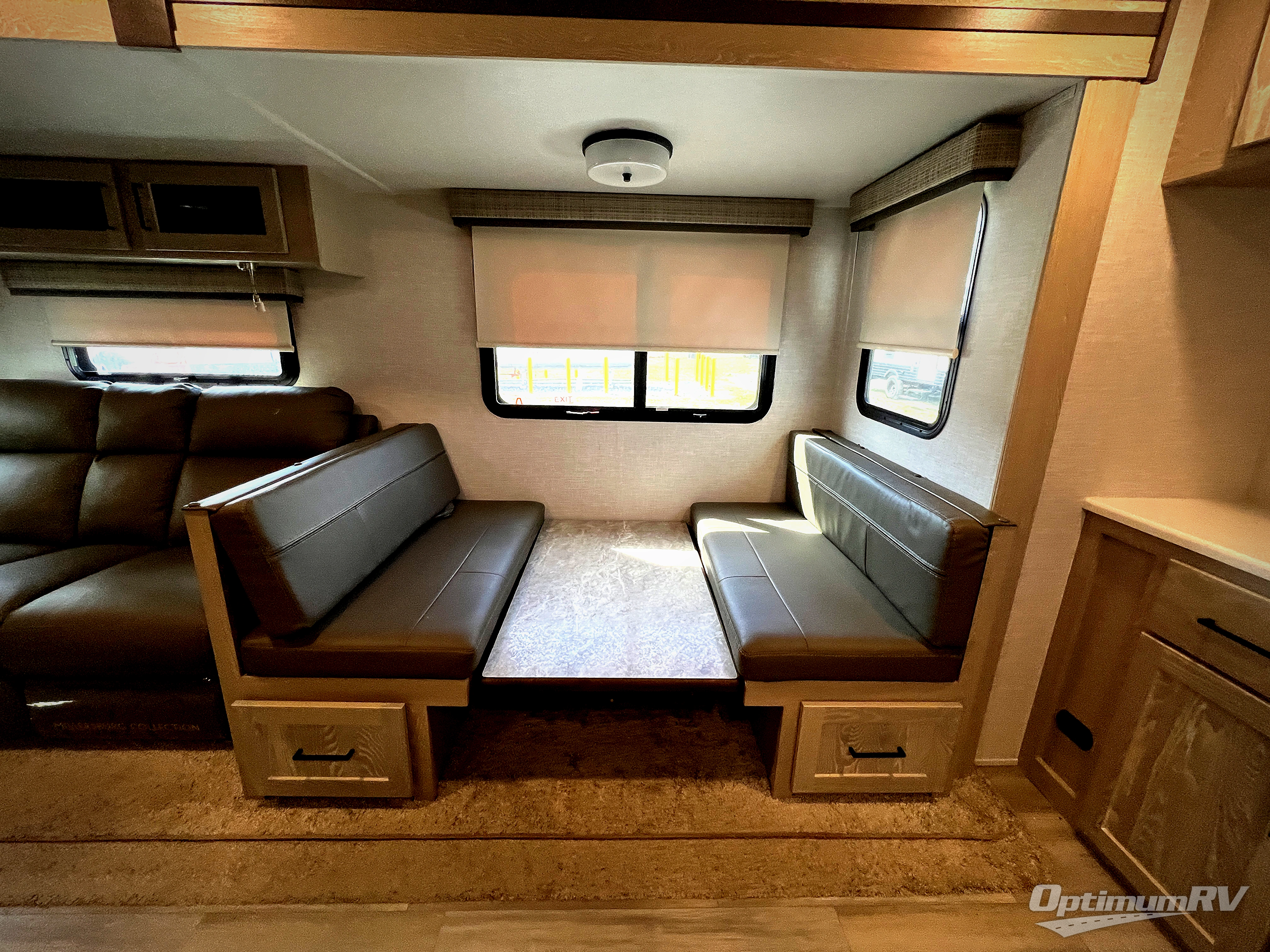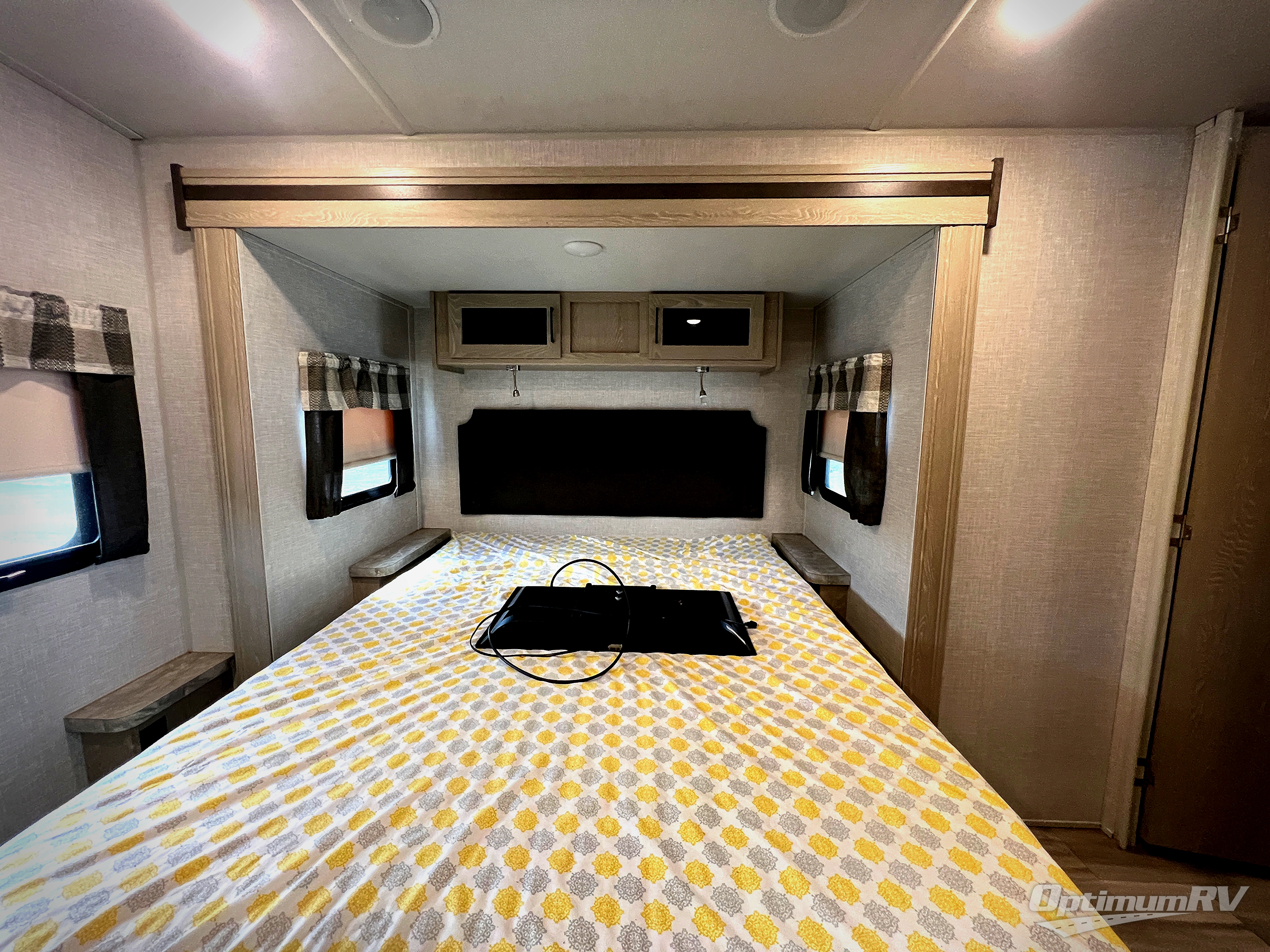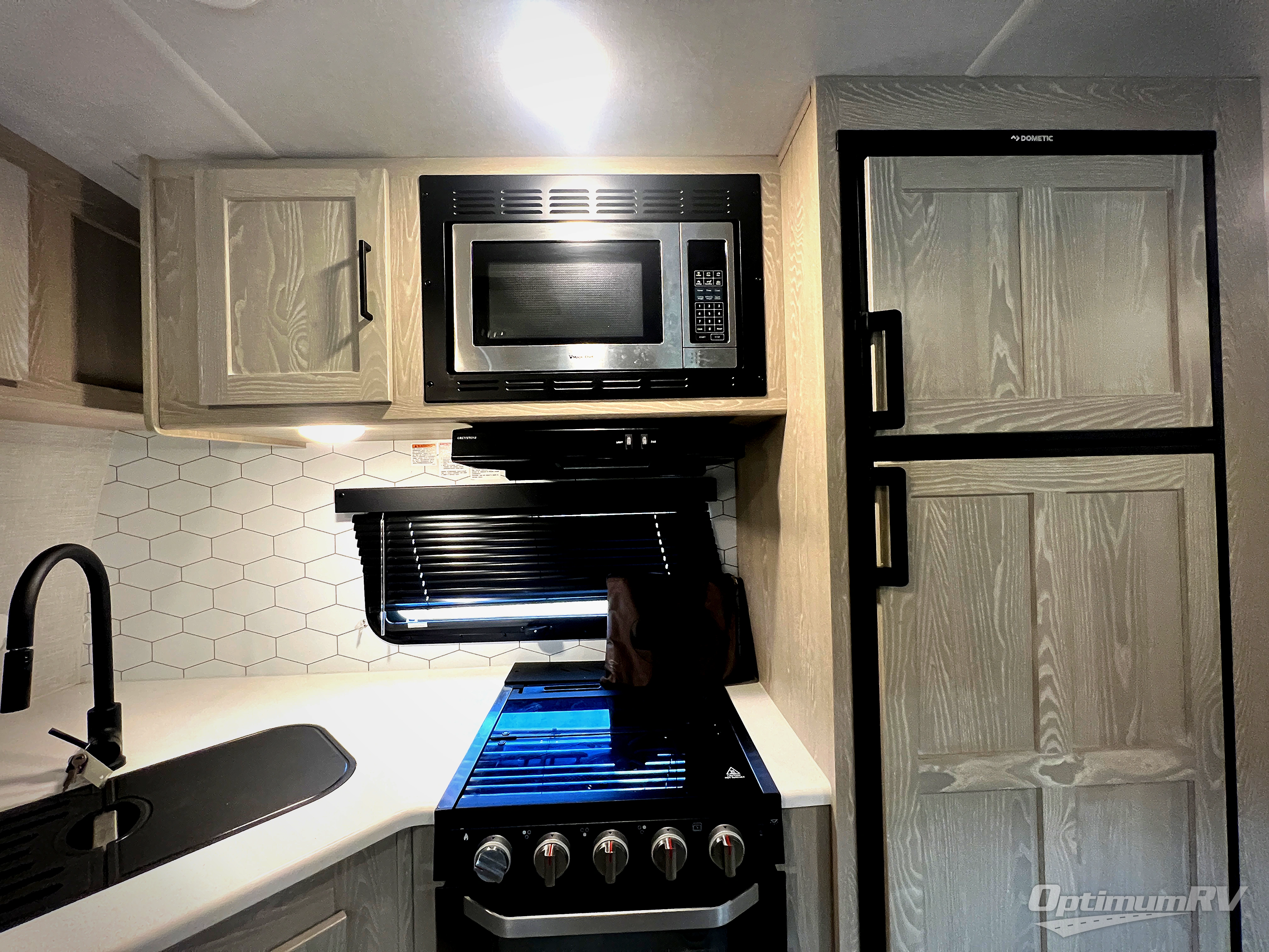 This trailer allows you to enjoy privacy in the rear bedroom with your own queen bed, nightstands, and plenty of wardrobe space next to the second entry/exit door. The two entry doors make for a smooth flow of traffic in and out of the unit whether you are in the bedroom or main living area. The best way to wind down your night is by grabbing a drink and lying back on the 67" hide-a-bed sofa in front of the cozy fireplace. If you want to experience the outdoors to its fullest, then get a camp chair and sit back underneath the 21' power awning with an LED light strip!