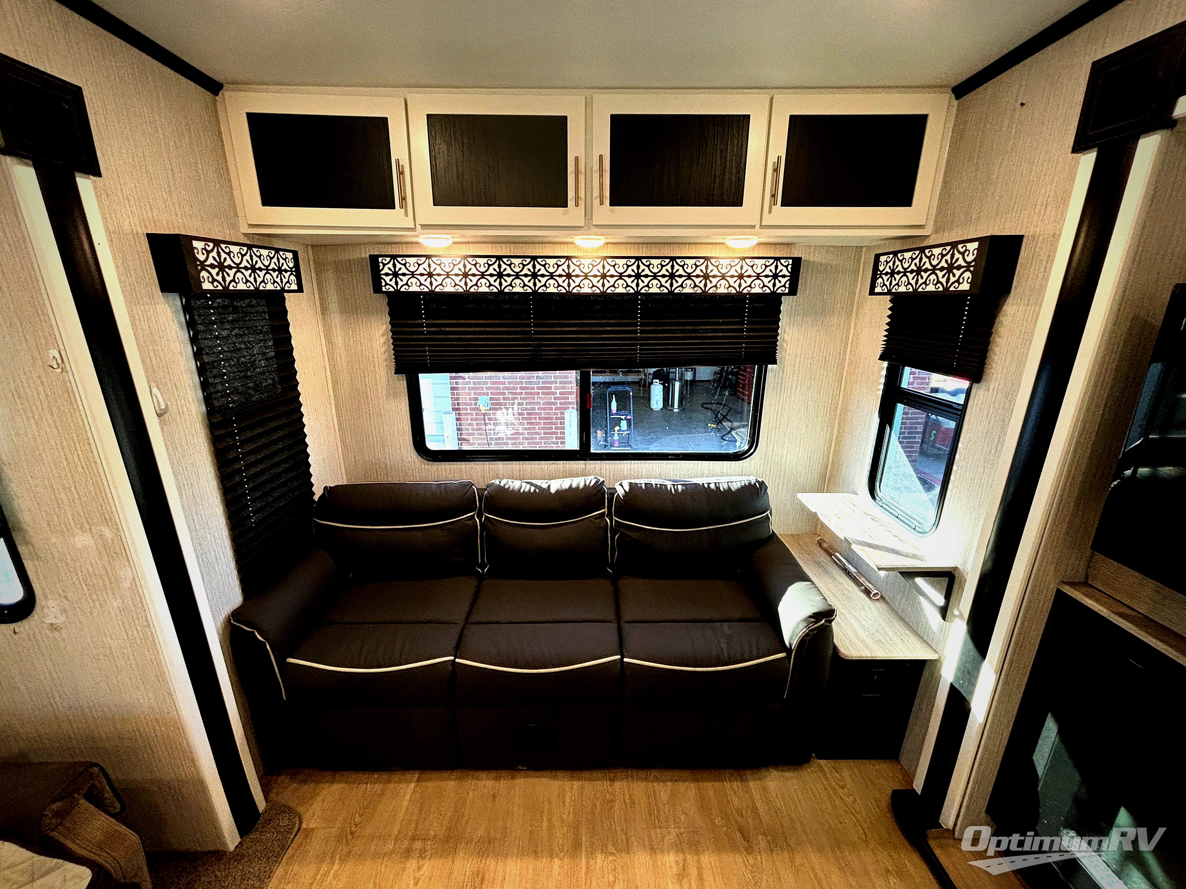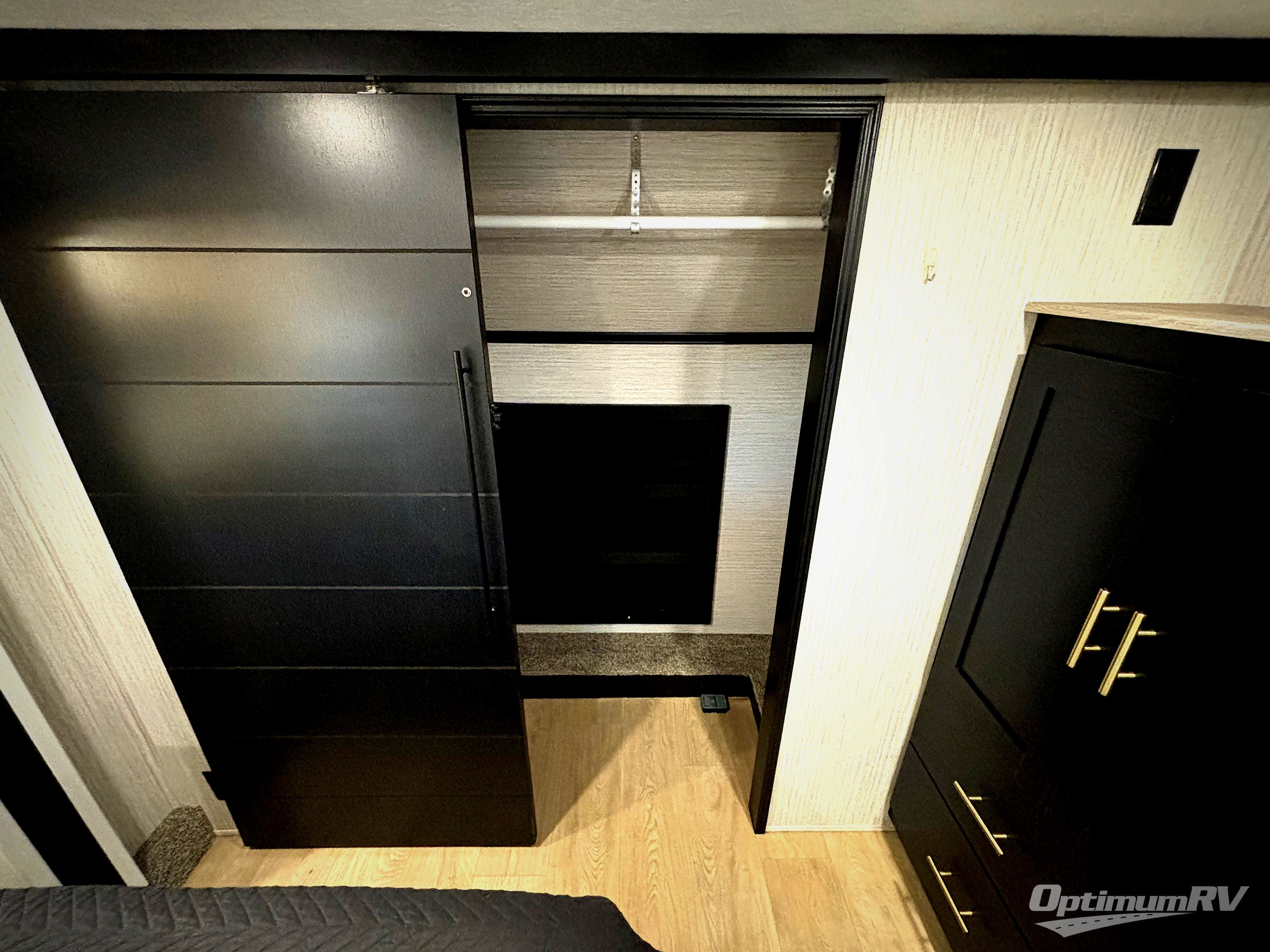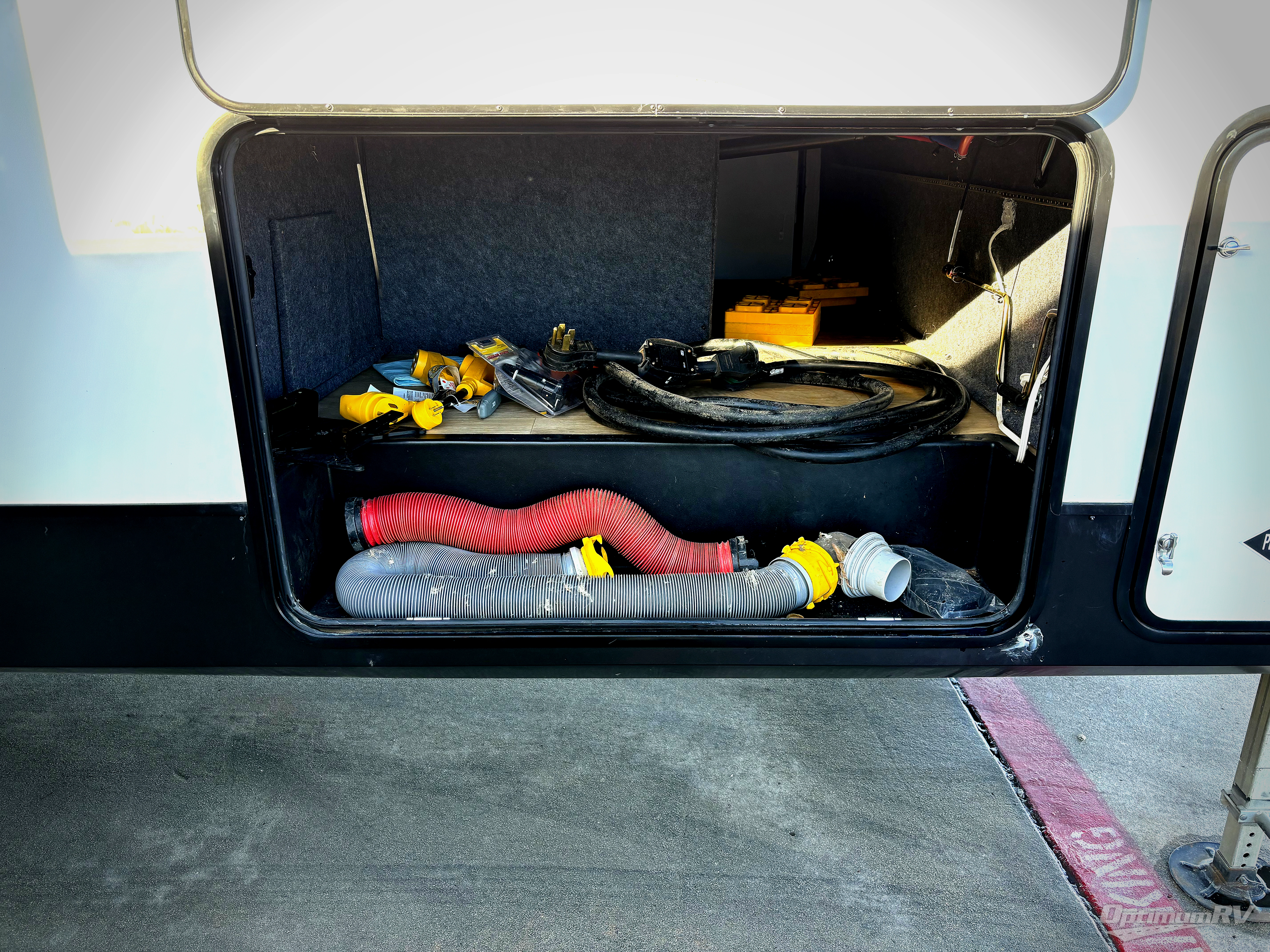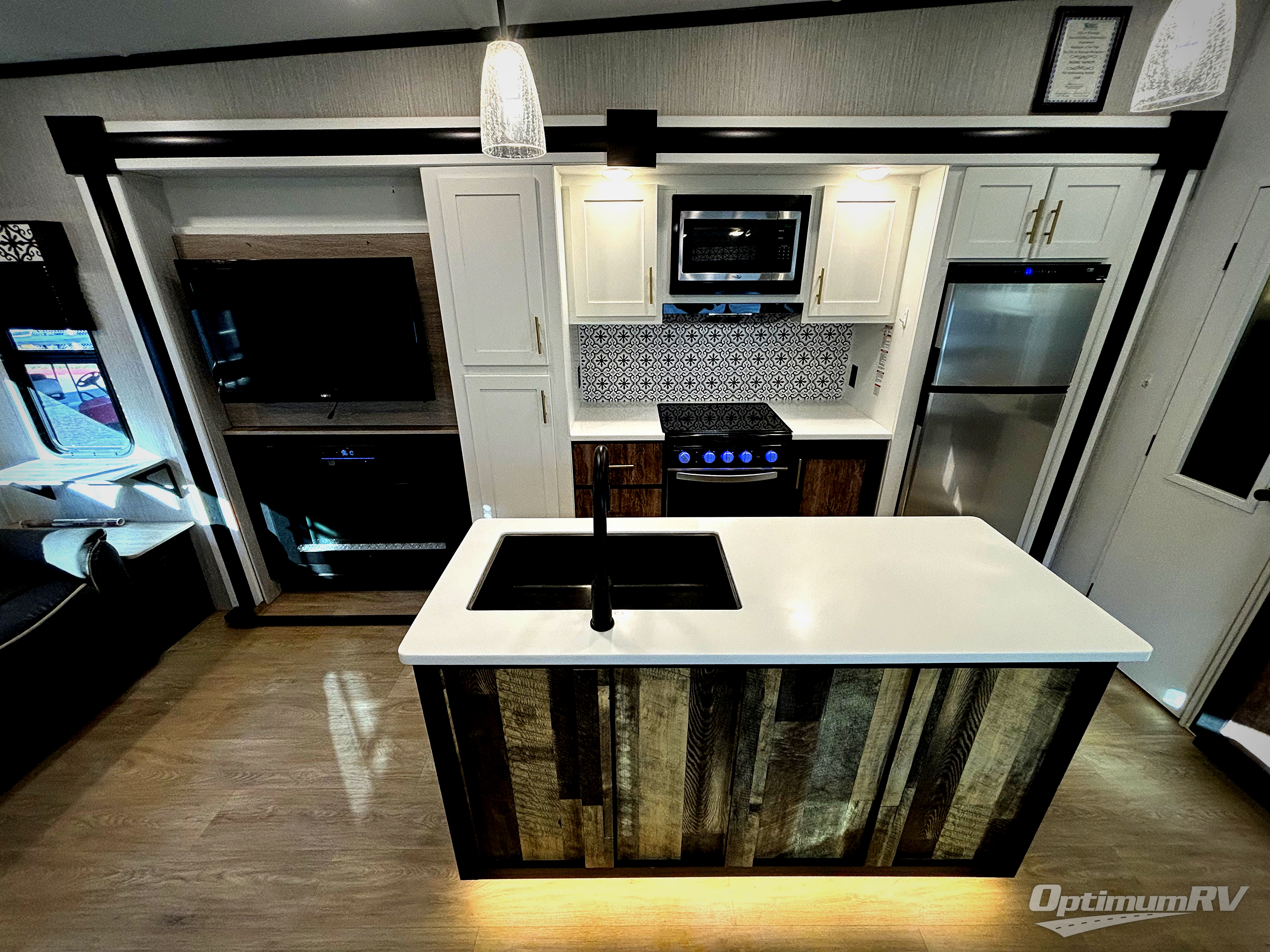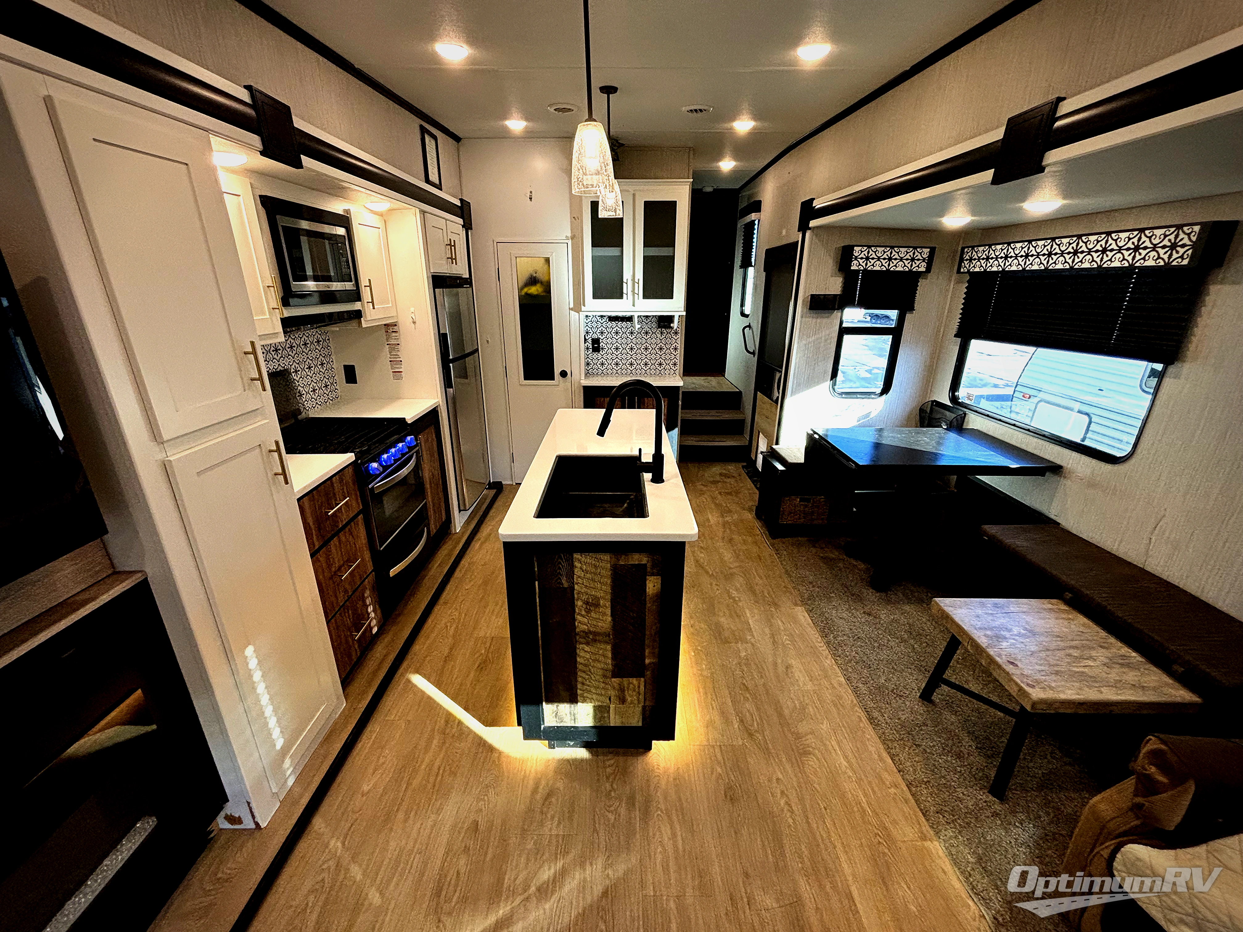 Experience the camping lifestyle in complete comfort with this fifth wheel in tow! Once you step foot inside you will be met with a spacious living space, residential features, and comfortable furniture arrangements. There are many convenient features such as a walk-in pantry, a large kitchen island, pus tons of overhead space for your dishes and kitchen knickknacks. After a day outdoors, head to the rear living area to relax on the 80" hide-a-bed sofa or the 60" theater seating. When it's time to call it a night, the front private bedroom will be your own oasis away from it all. Here, you'll find a slide out king bed, plus a large wardrobe that includes convenient shoe storage and a space to add an optional washer and dryer!