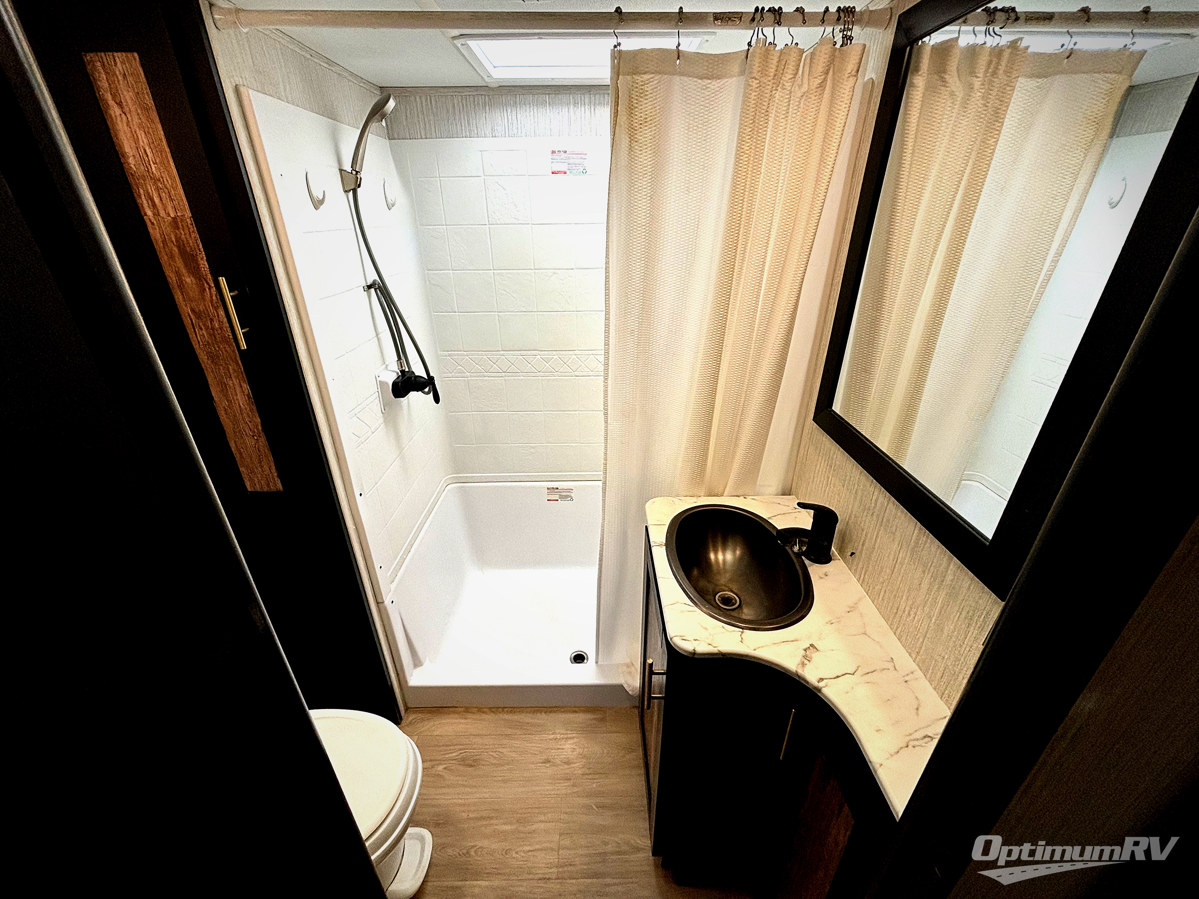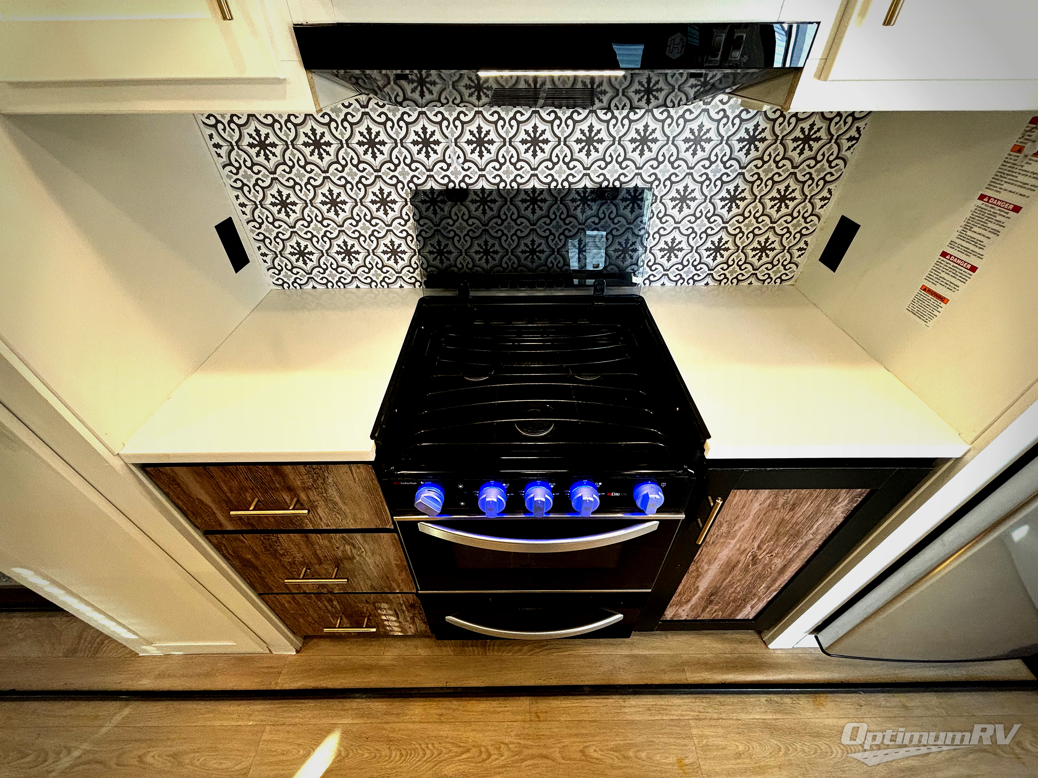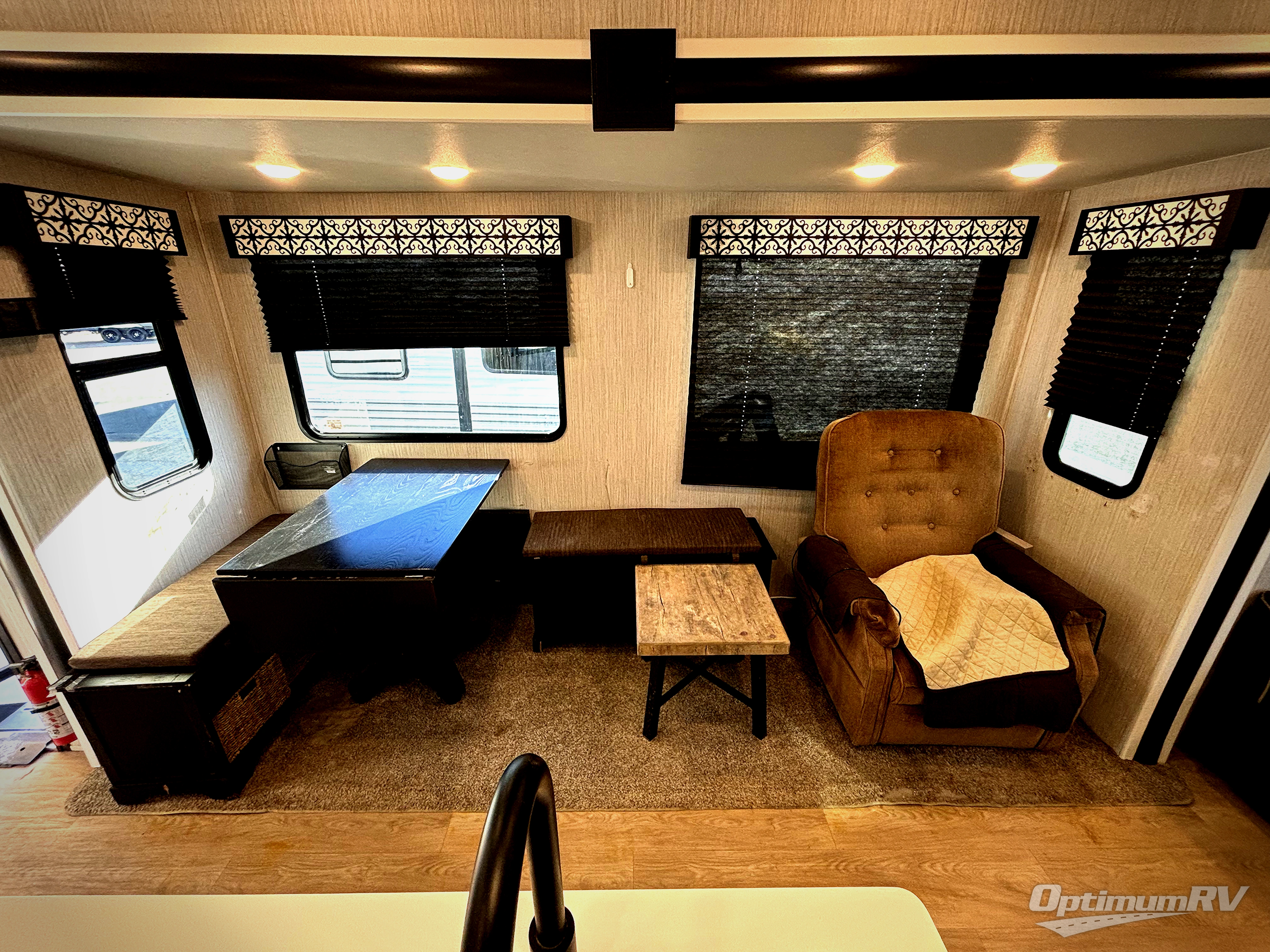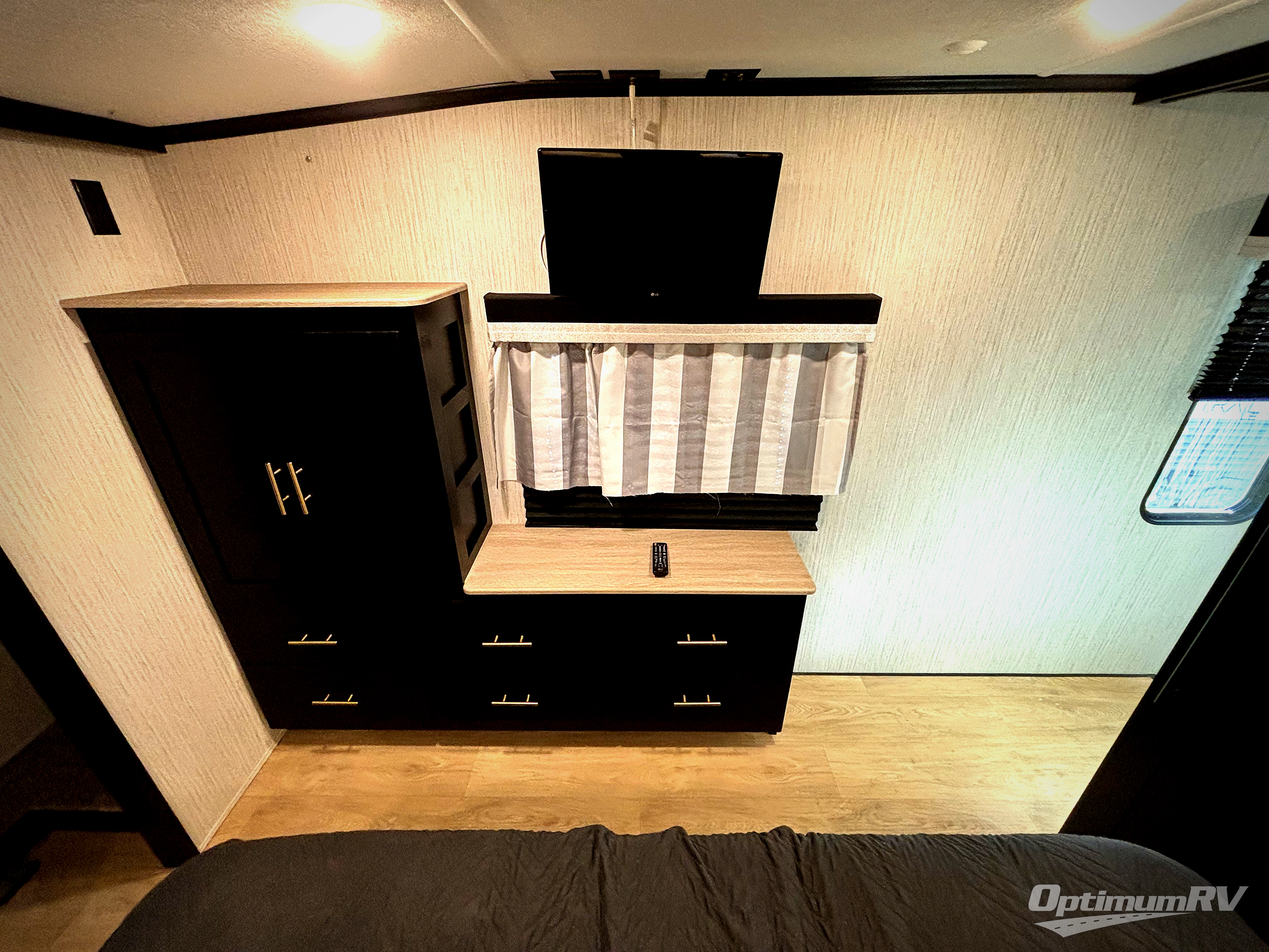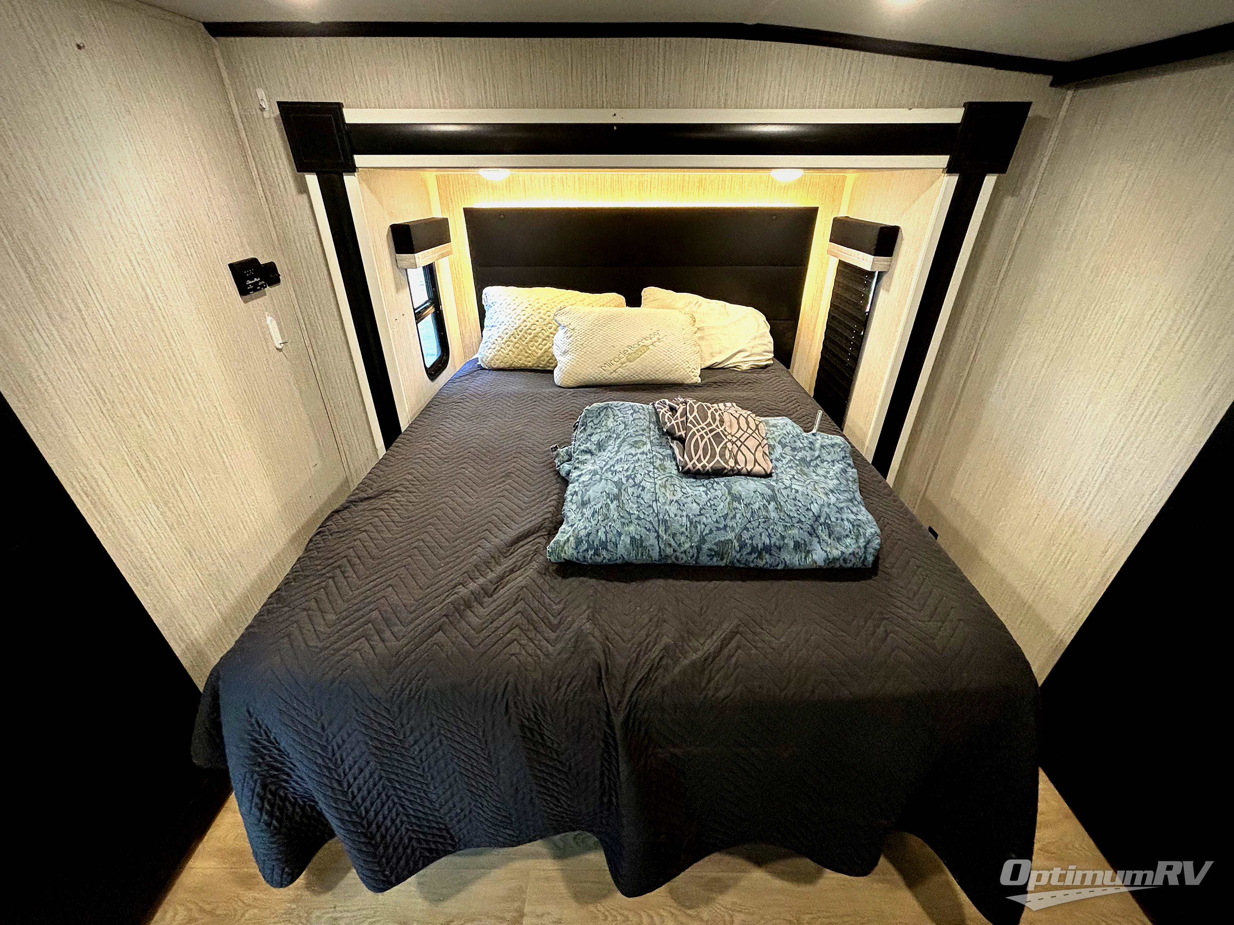 Experience the camping lifestyle in complete comfort with this fifth wheel in tow! Once you step foot inside you will be met with a spacious living space, residential features, and comfortable furniture arrangements. There are many convenient features such as a walk-in pantry, a large kitchen island, pus tons of overhead space for your dishes and kitchen knickknacks. After a day outdoors, head to the rear living area to relax on the 80" hide-a-bed sofa or the 60" theater seating. When it's time to call it a night, the front private bedroom will be your own oasis away from it all. Here, you'll find a slide out king bed, plus a large wardrobe that includes convenient shoe storage and a space to add an optional washer and dryer!