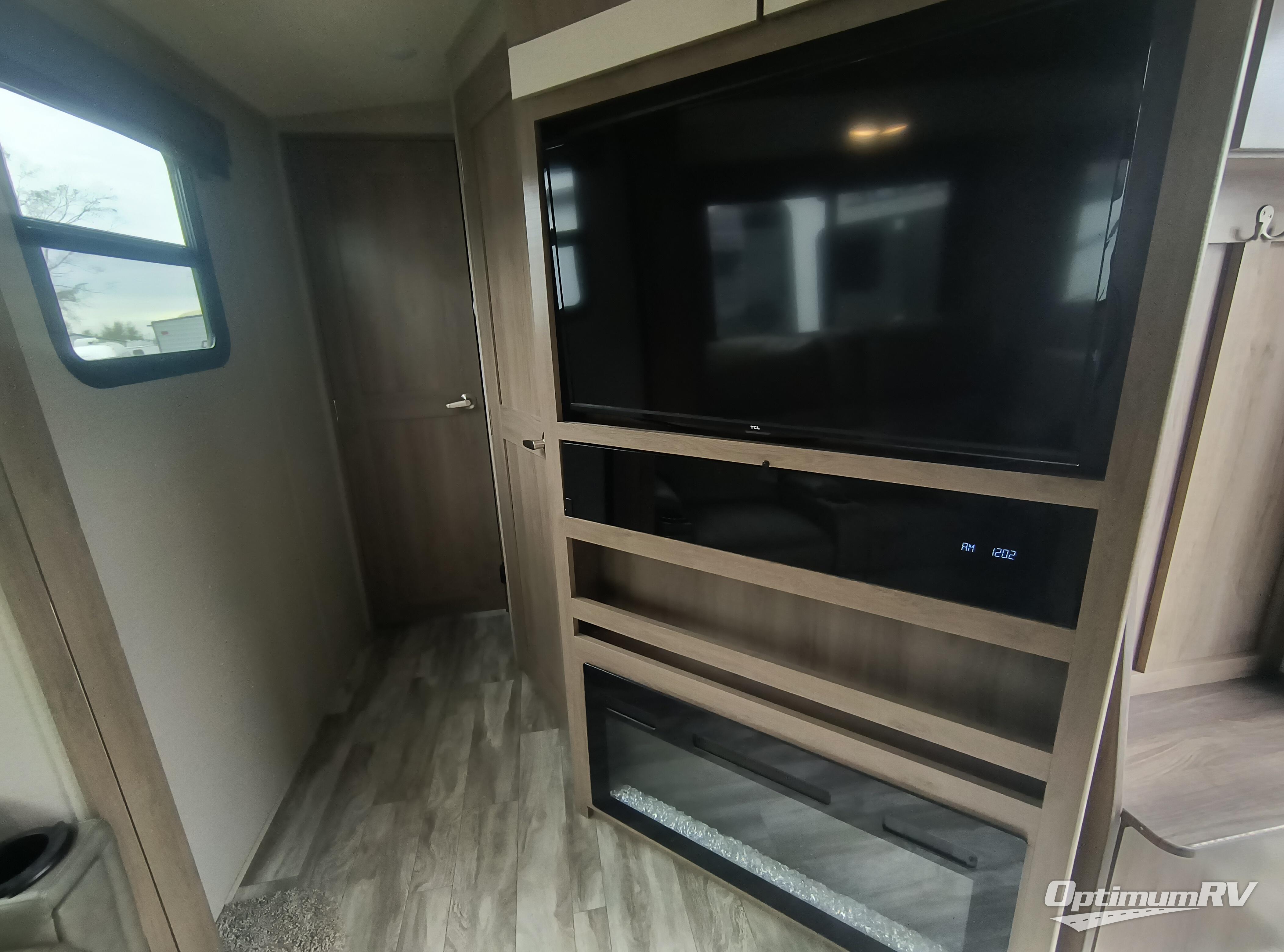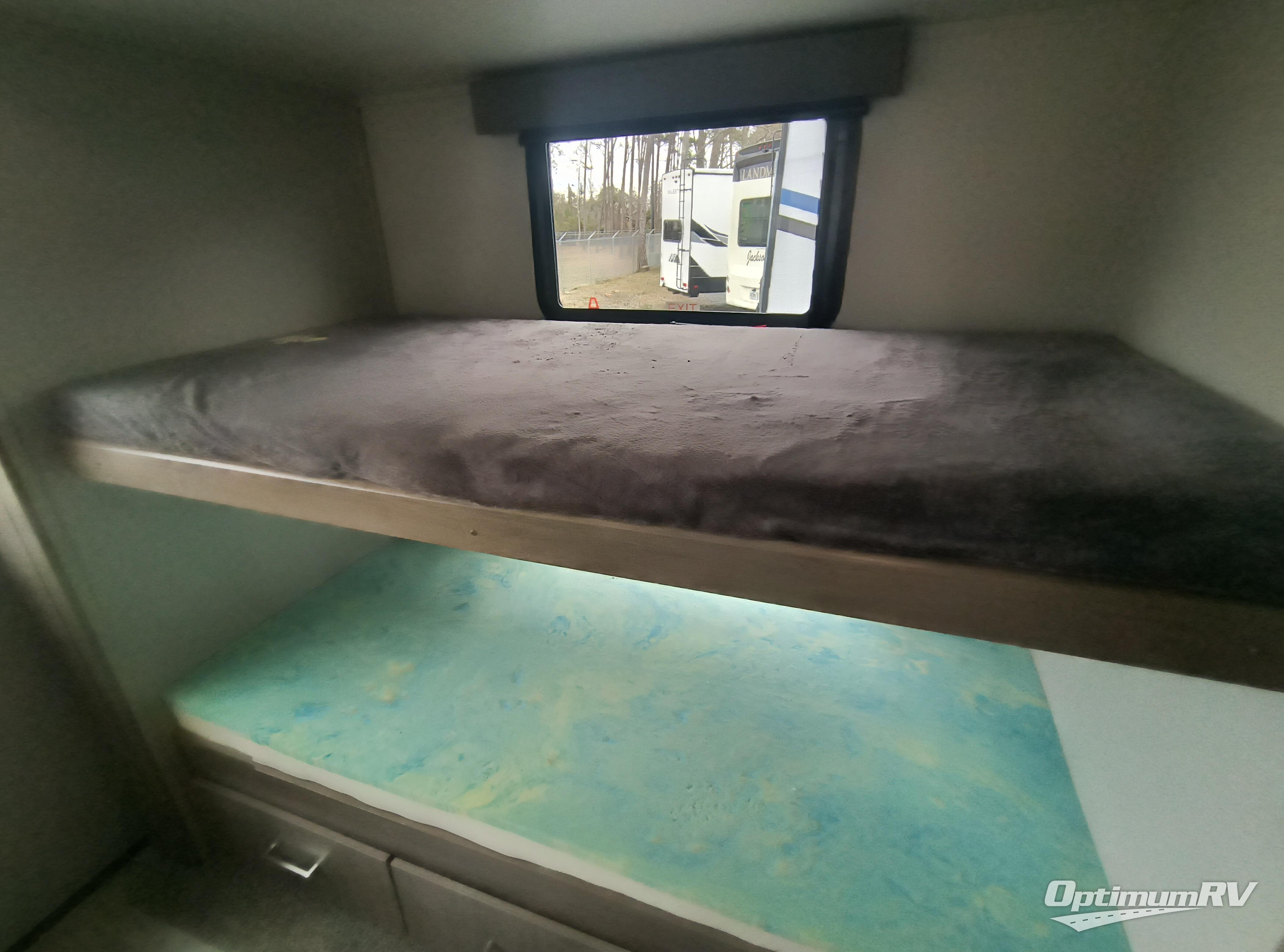 Invite the cousins to join you on your next camping trip in this spacious travel trailer that offers a bunkhouse with four bunk beds, a slide out, a wardrobe and a great view out the back window. There are drawers as well for everyone's belongings. You can also offer sleeping space on the booth dinette and the tri-fold sofa in the main living area, and the kitchen appliances including the island are on the opposite side. You might choose to add the optional free standing table and/or the theatre seating option if you don't need the additional sleeping space. The cook will love the inside kitchen space, the pantry, and the easy access outside to the outdoor kitchen and the 21' power adjustable awning. And the exterior pass through storage allows you to bring along the fishing poles, firewood, and larger camping gear.