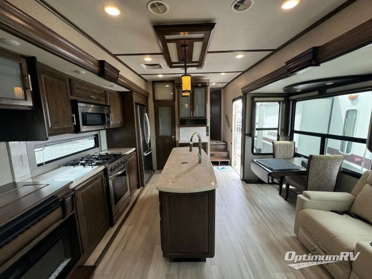 If you are on the search for a livable fifth wheel for those month-long trips, this Solitude might be the one! Just imagine cooking on a professional-grade stainless steel cooktop and inside a built-in oven or microwave. The cook can prepare the meals on the kitchen island and store leftovers in the stainless steel residential refrigerator. When you and your spouse aren't outside, the LED Smart TV in the living area can keep you entertained while staying warm by the fireplace. There is plenty of storage throughout for your shoes under the steps, dry goods in the large pantry with shelves, linens, and your wardrobe in the front bedroom with a rod and shelving. You might even like to choose a few options such as adding a stackable washer and dryer, a dishwasher, a king-size bed, or even a pull-out kitchen outside.