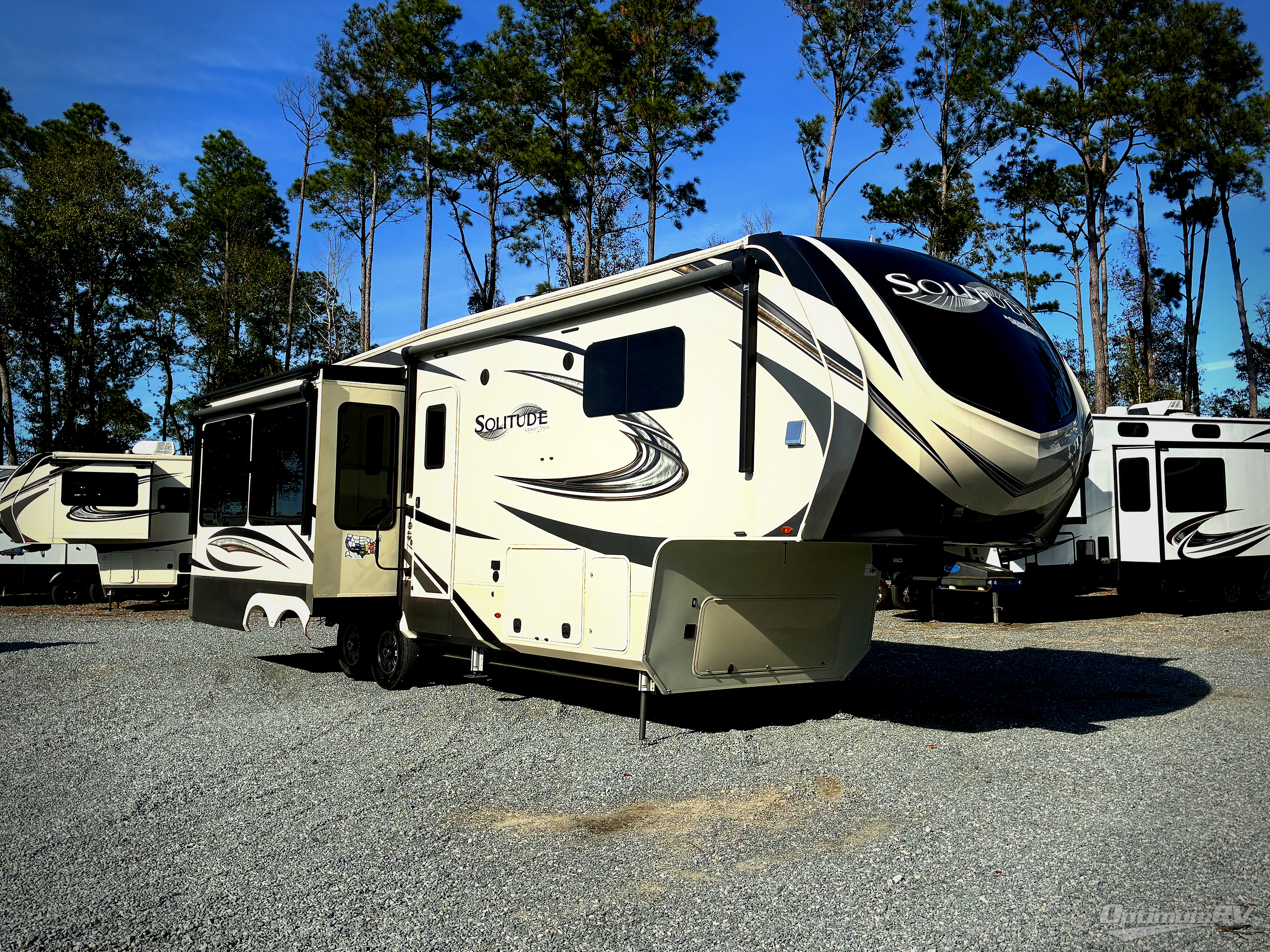 With each Solitude fifth wheel by Grand Design, you will have an exclusive superchassis, a wide rail design on heavy duty l-beam main rails providing a more stable jack stance, and maximum insulation from the thermal roof design and the exclusive full laminated walls to the insulated gooseneck and baggage doors. More features offered to help with traveling include the MORryde rubber pin box, the Tire Linc TPMS system, and the 6-point hydraulic system. And the 40,000 BTU of heating power, the heated underbelly and heated storage bay, the Evenflow heating system, and the Stealth A/C system with racetrack ducting, allow you to camp all year long! You will also find maximum storage solutions, residential features and so much more!