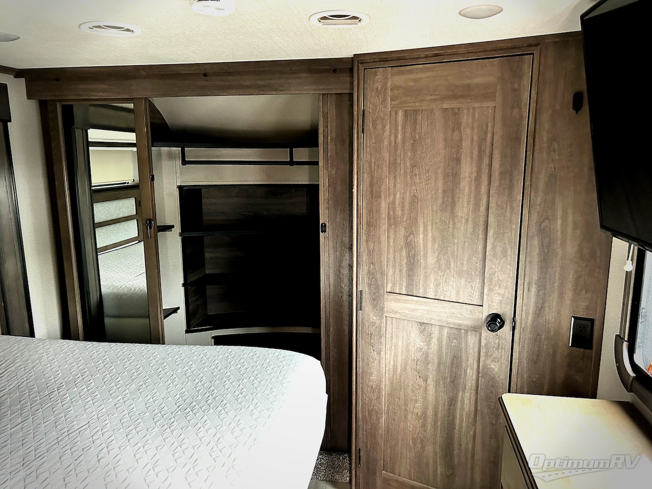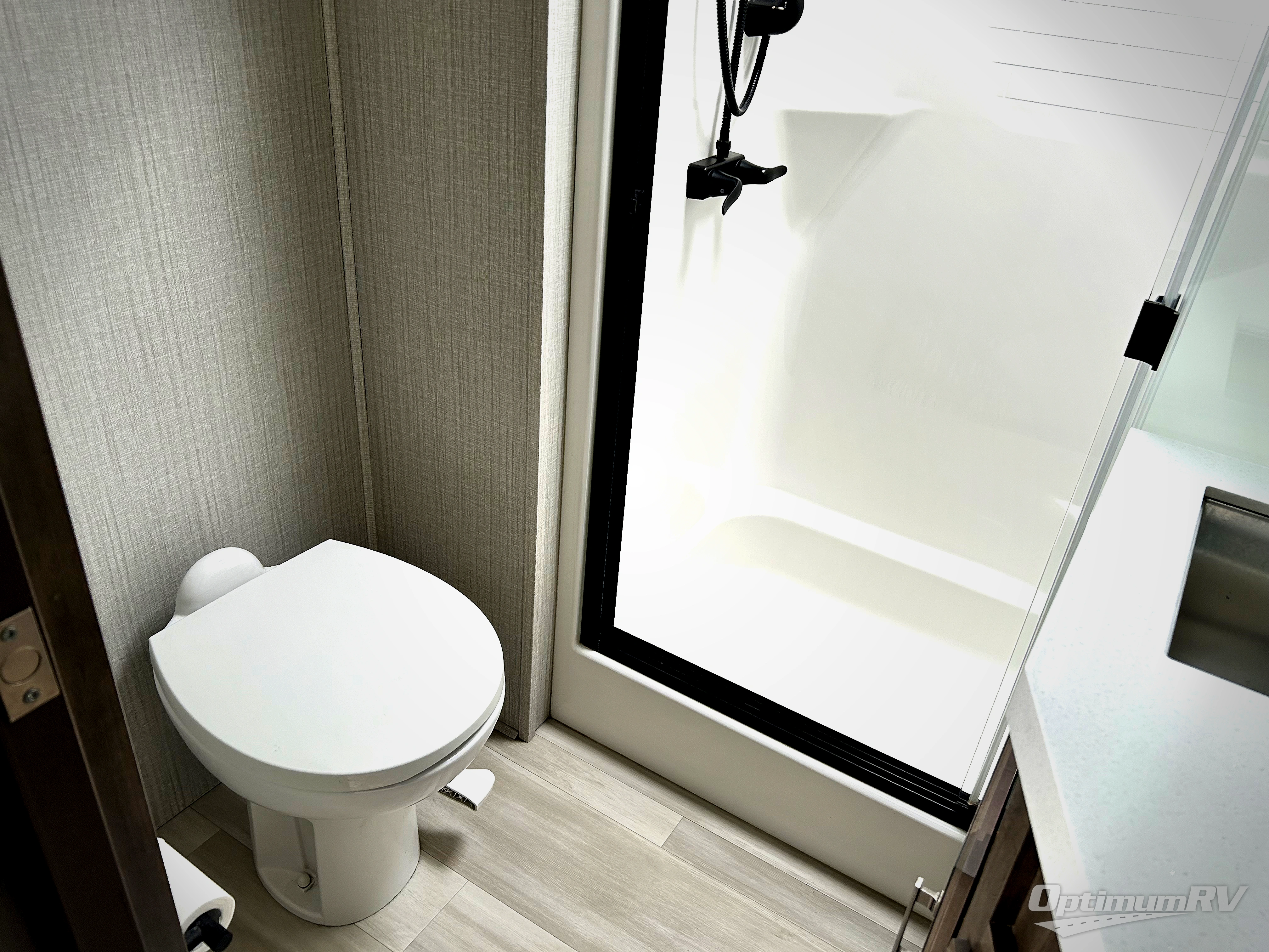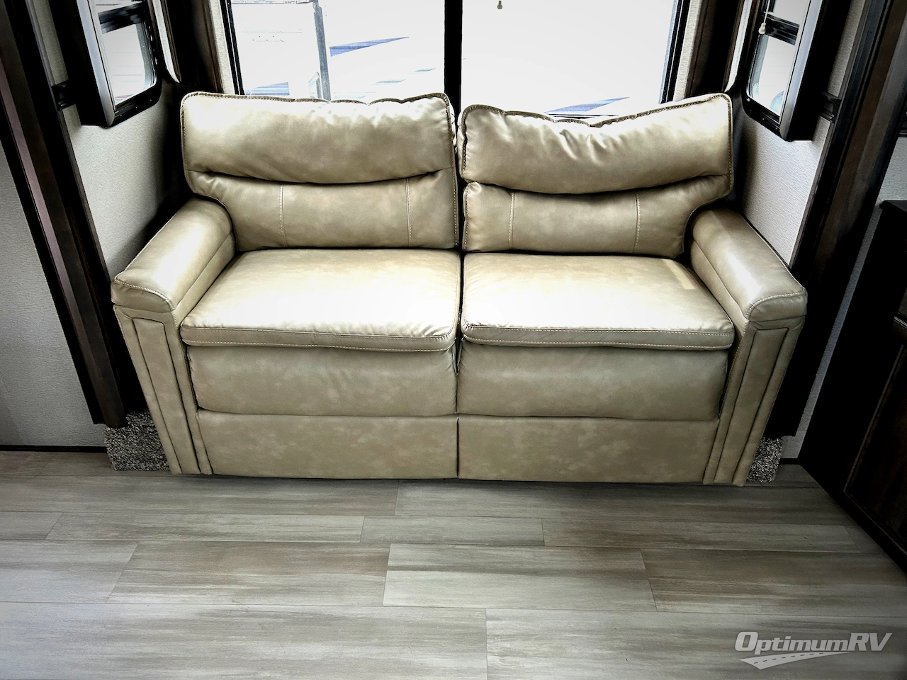 No worries about leaving anything behind with all the storage found throughout the interior and the exterior of this fifth wheel! From the bedroom closet and flip-up dresser, plus the overhead cabinets in the kitchen and separate living area to the exterior rear storage with a sliding tray and side access, there is a place for everything. Everyone can visit in the rear living area with an entertainment center, an LED TV, a fireplace and a window for great views while sitting on the dual tri-fold sofa slides and the theater seating. The buffet area can be utilized many ways, and the free-standing dinette offers a place to dine and play games. The kitchen offers full amenities including a hutch and oversized pantry. And you can stay refreshed with the full bathroom and get a good night's sleep on the queen bed slide or choose a king option.