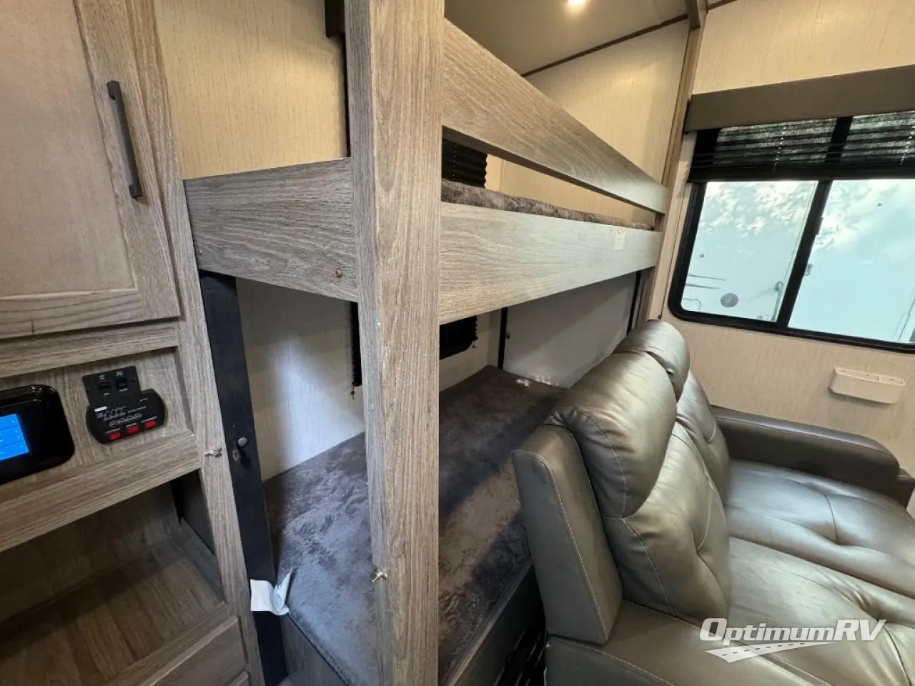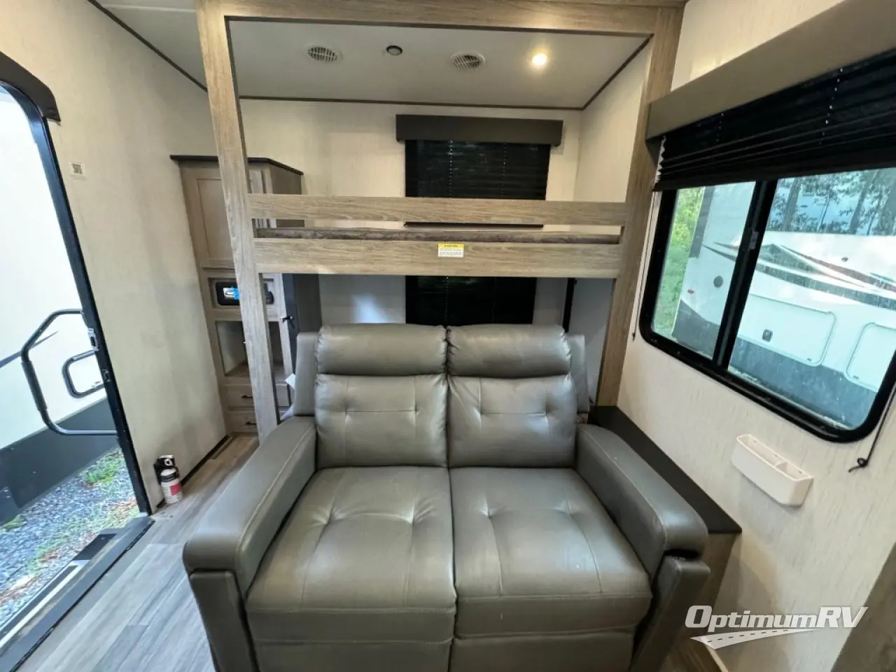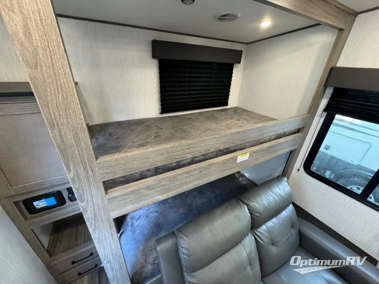 This Milestone M-One fifth wheel will catch your eye because it has an outdoor kitchen that you can use to cook up a meal worth sharing! You can pull out the 14' awning so that you have some shade while you cook, or you can simply head inside to do some extra preparations on the three-burner range. The farm sink will make it an easy job to do dishes afterwards, and the large pantry is an excellent place to store your midnight snacks. In the back of this unit is a set of bunk beds that rest behind the theater seating. There is also a ladder that leads up to the top bunk and a wardrobe to the side of the bunks for storage. The U-shaped dinette is a useful piece of furniture that allows you to sit down with a hot meal, and you can also transform the dinette into an additional bed at night.