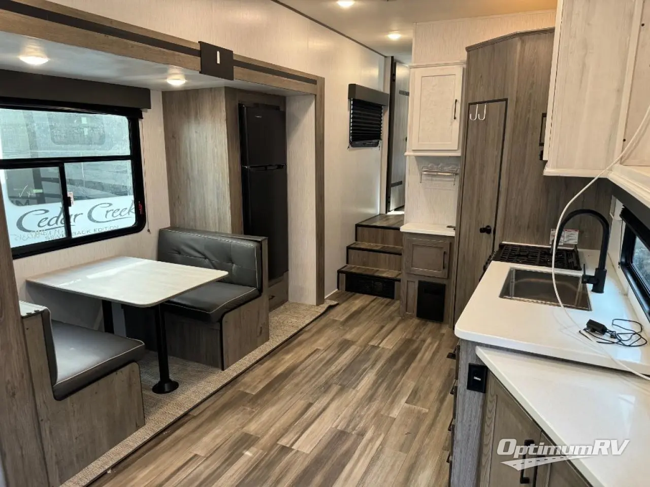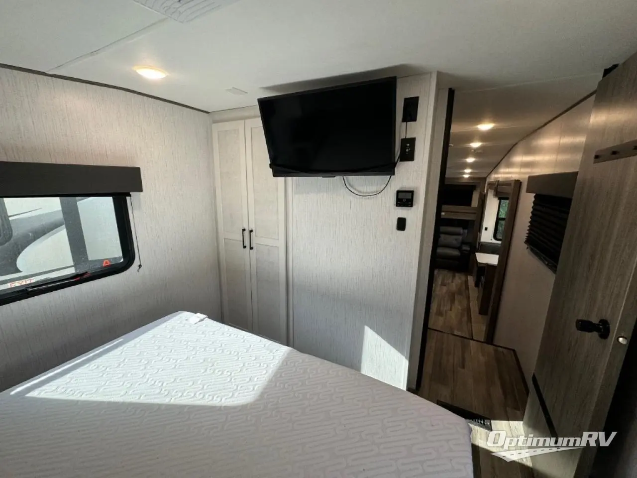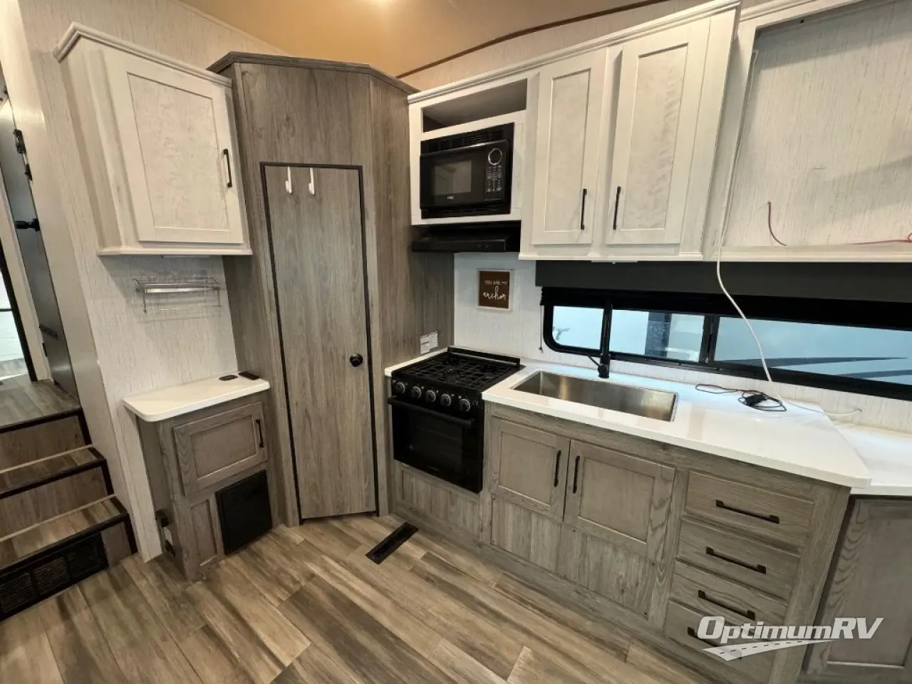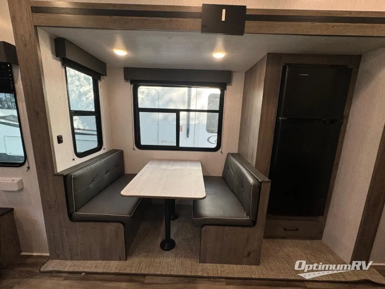 This Milestone M-One fifth wheel will catch your eye because it has an outdoor kitchen that you can use to cook up a meal worth sharing! You can pull out the 14' awning so that you have some shade while you cook, or you can simply head inside to do some extra preparations on the three-burner range. The farm sink will make it an easy job to do dishes afterwards, and the large pantry is an excellent place to store your midnight snacks. In the back of this unit is a set of bunk beds that rest behind the theater seating. There is also a ladder that leads up to the top bunk and a wardrobe to the side of the bunks for storage. The U-shaped dinette is a useful piece of furniture that allows you to sit down with a hot meal, and you can also transform the dinette into an additional bed at night.